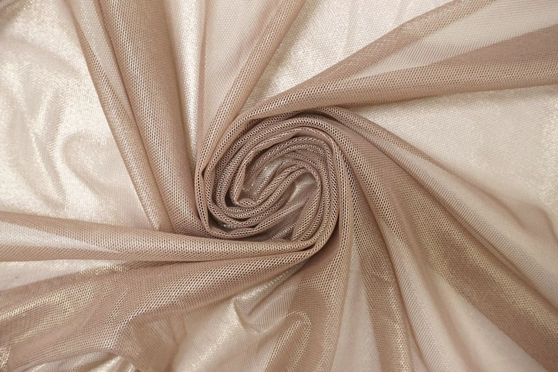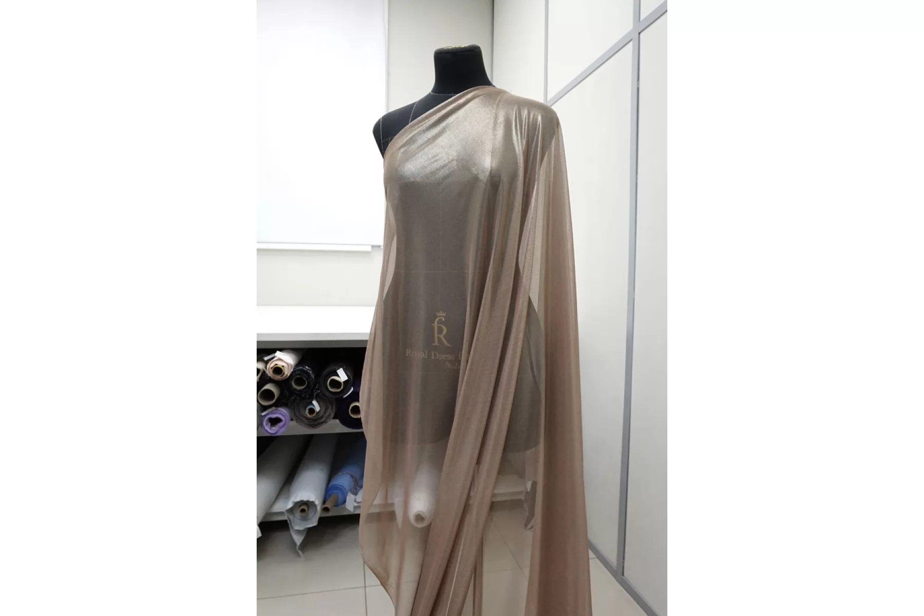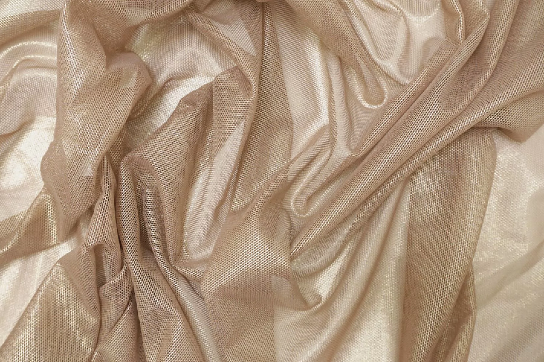 Сетка бежевого цвета с золотым накатом. Приятная, мягкая, блестящая и нарядная. Тонкая, пластичная. Упруго тянется за счет плетения. Просвечивает. Красив в складках. Шьем нарядные платья, кофты, кардиганы, юбки со сборкой и не только. При необходимости используйте подкладочный материал