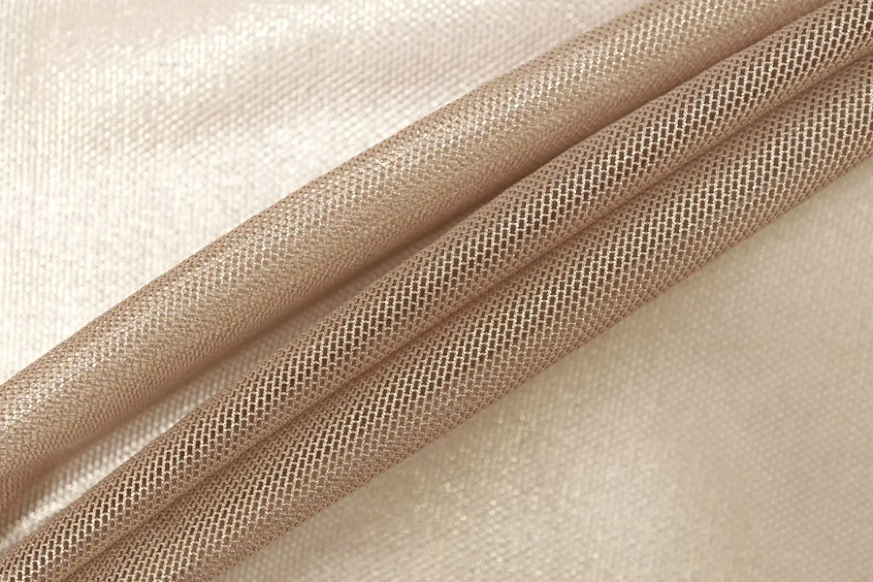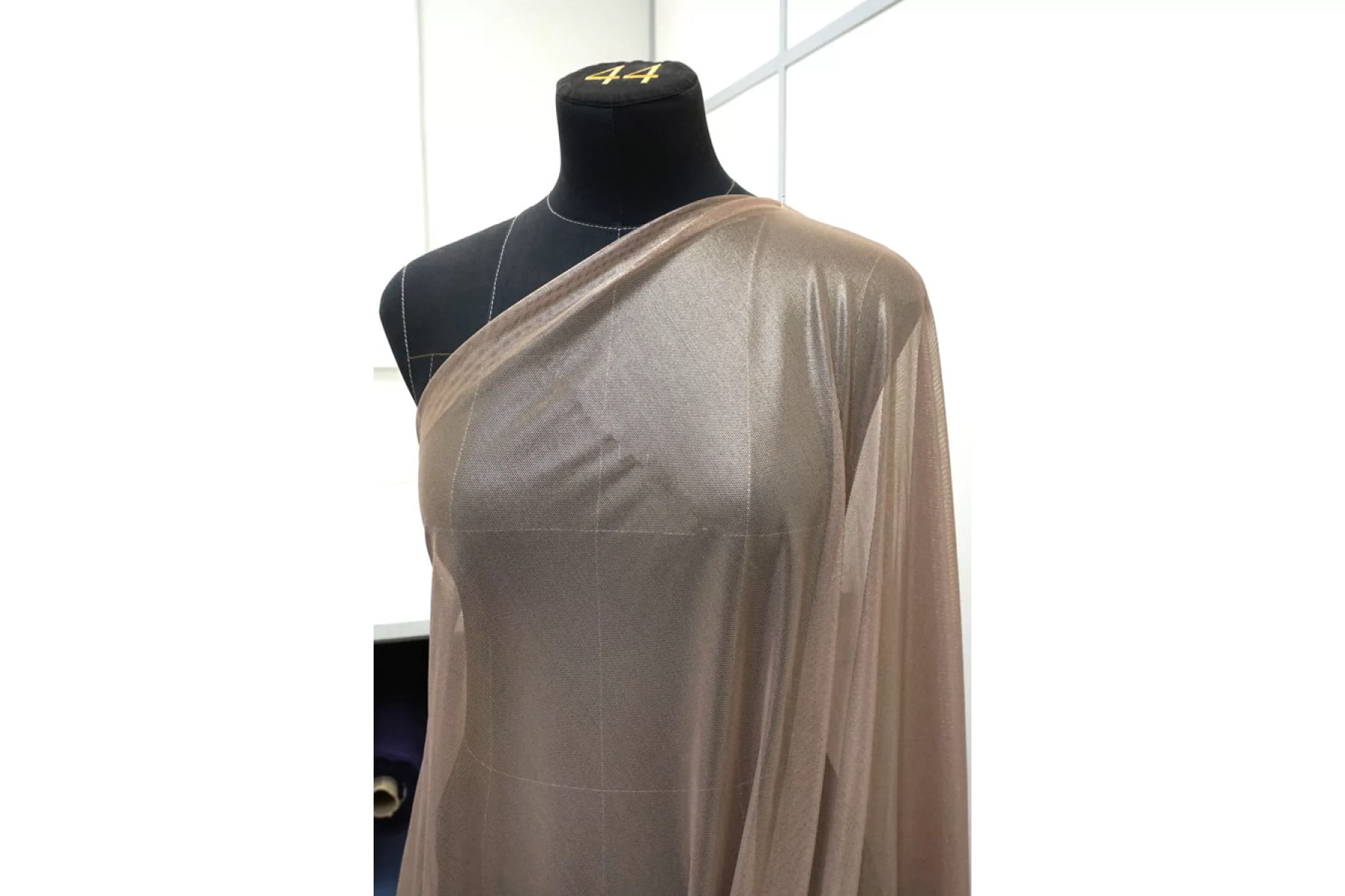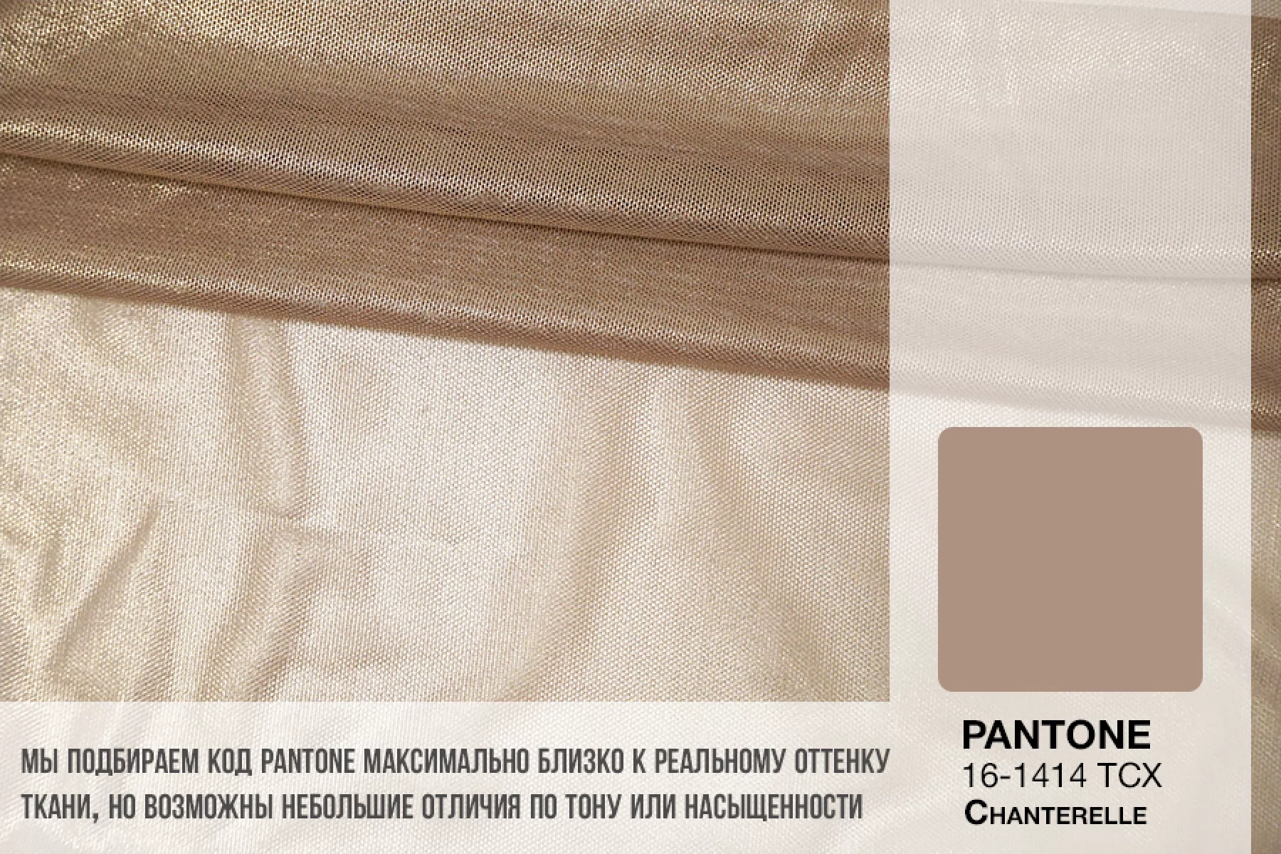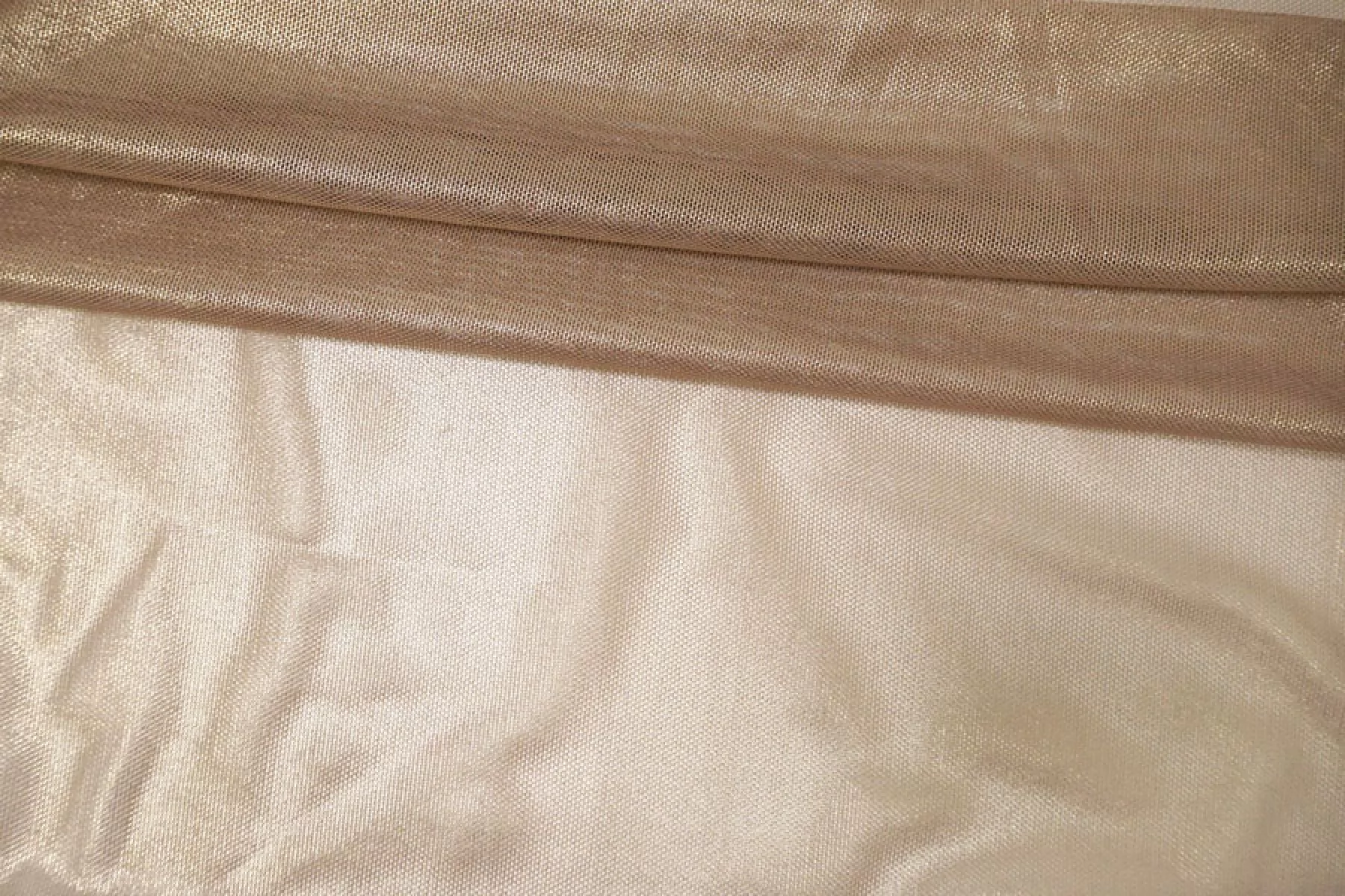 Сетка бежевого цвета с золотым накатом. Приятная, мягкая, блестящая и нарядная. Тонкая, пластичная. Упруго тянется за счет плетения. Просвечивает. Красив в складках. Шьем нарядные платья, кофты, кардиганы, юбки со сборкой и не только. При необходимости используйте подкладочный материал
