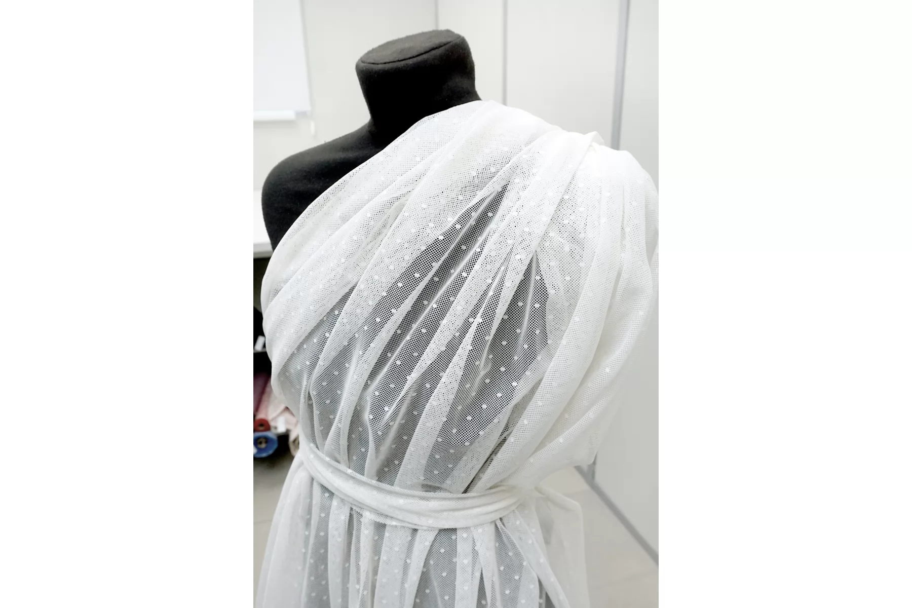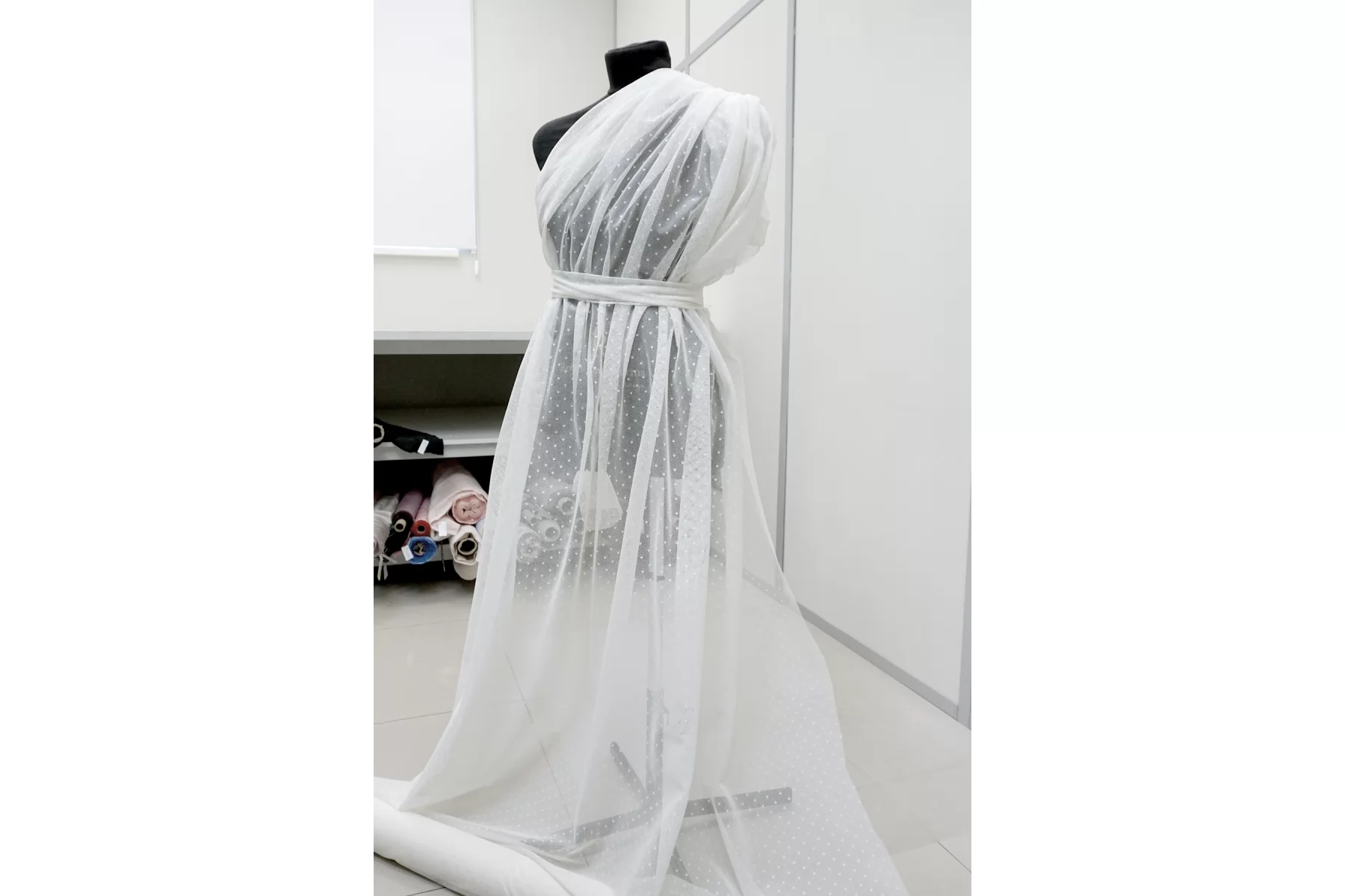 Тонкая итальянская сетка молочного цвета с узором-горошком. Тактильно слегка шероховатая. Шьем нарядные платья, юбки со сборкой и не только.