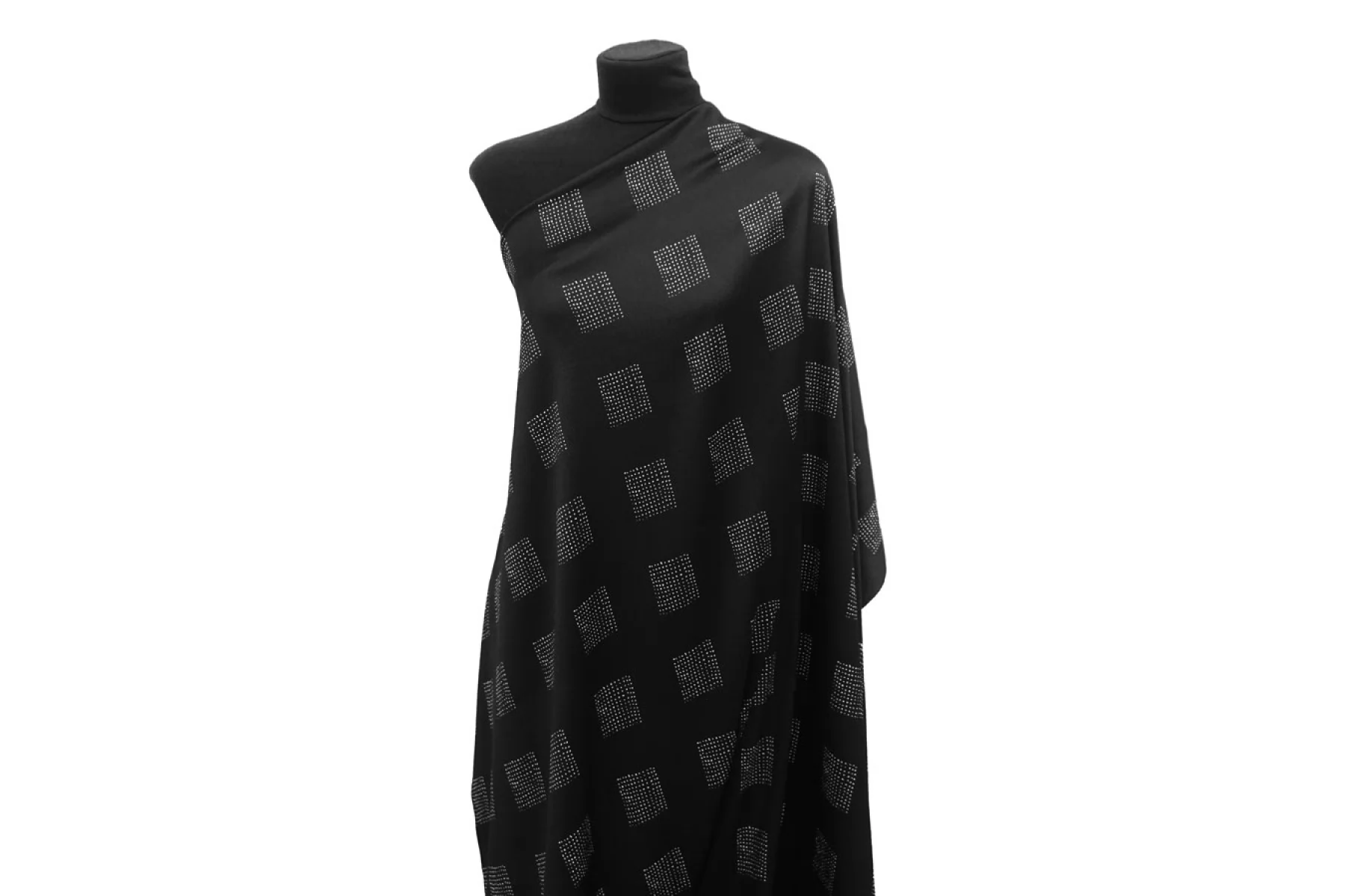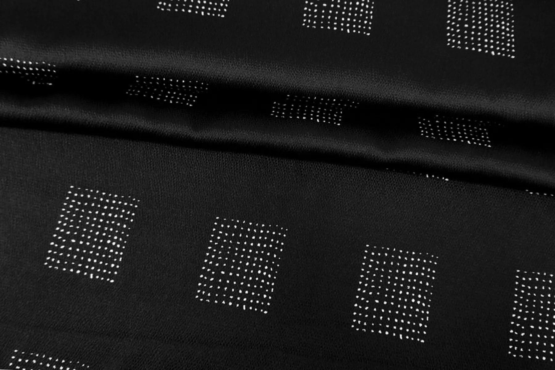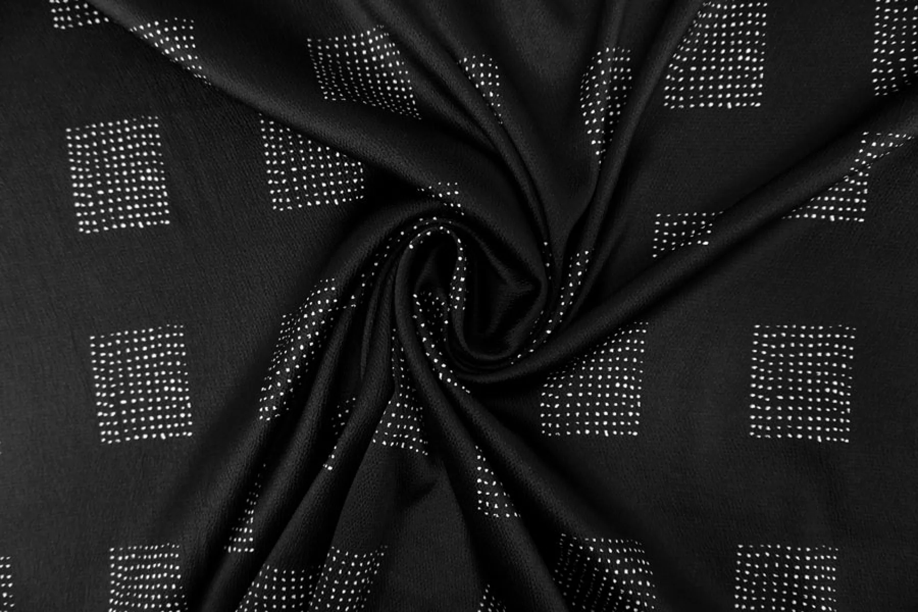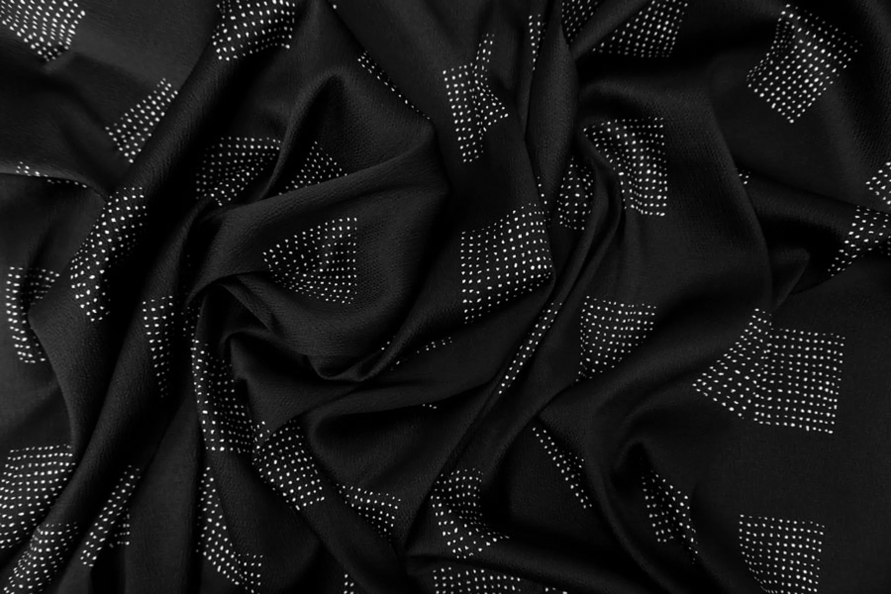 Классный атласный шелк от ARMANI фактурный черного цвета с принтом в виде квадратов из белых точек. Материал наощупь фактурный, мягкий, немного шуршащий. Форму не держит. Очень красиво струится, пластичен. Немного просвечивает. Очень хорошо тянется. Не мнется. Отлично подойдет на платья, юбки. Уход деликатный.