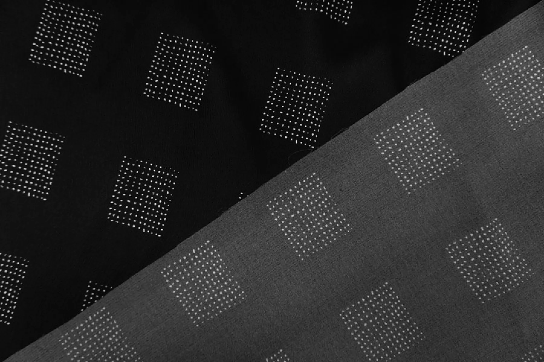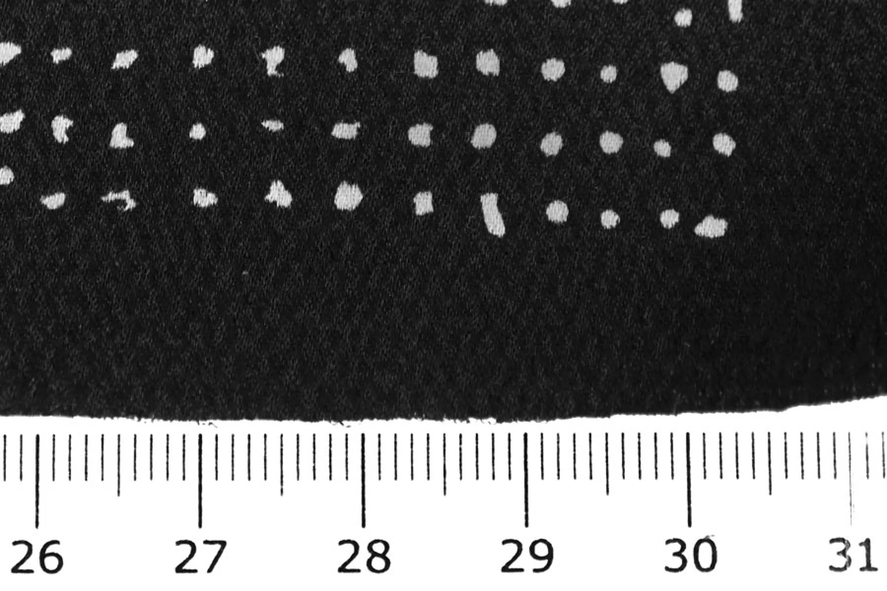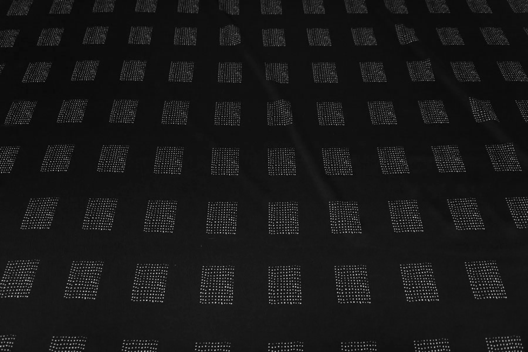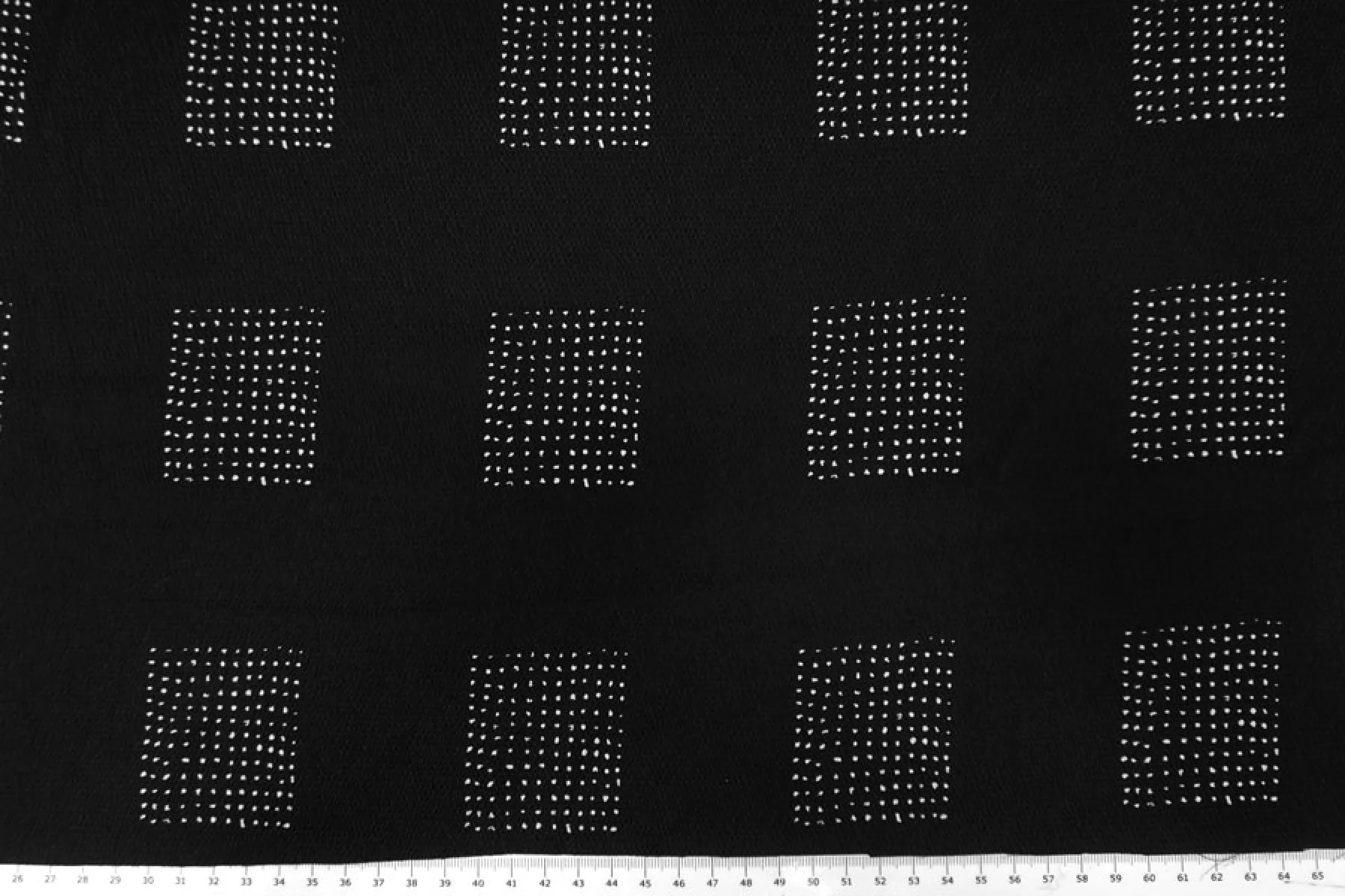Классный атласный шелк от ARMANI фактурный черного цвета с принтом в виде квадратов из белых точек. Материал наощупь фактурный, мягкий, немного шуршащий. Форму не держит. Очень красиво струится, пластичен. Немного просвечивает. Очень хорошо тянется. Не мнется. Отлично подойдет на платья, юбки. Уход деликатный.