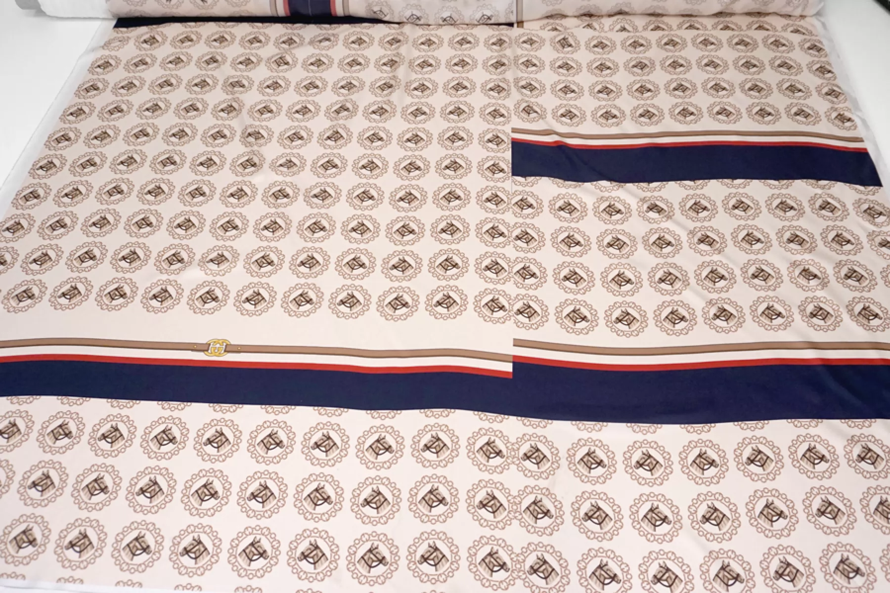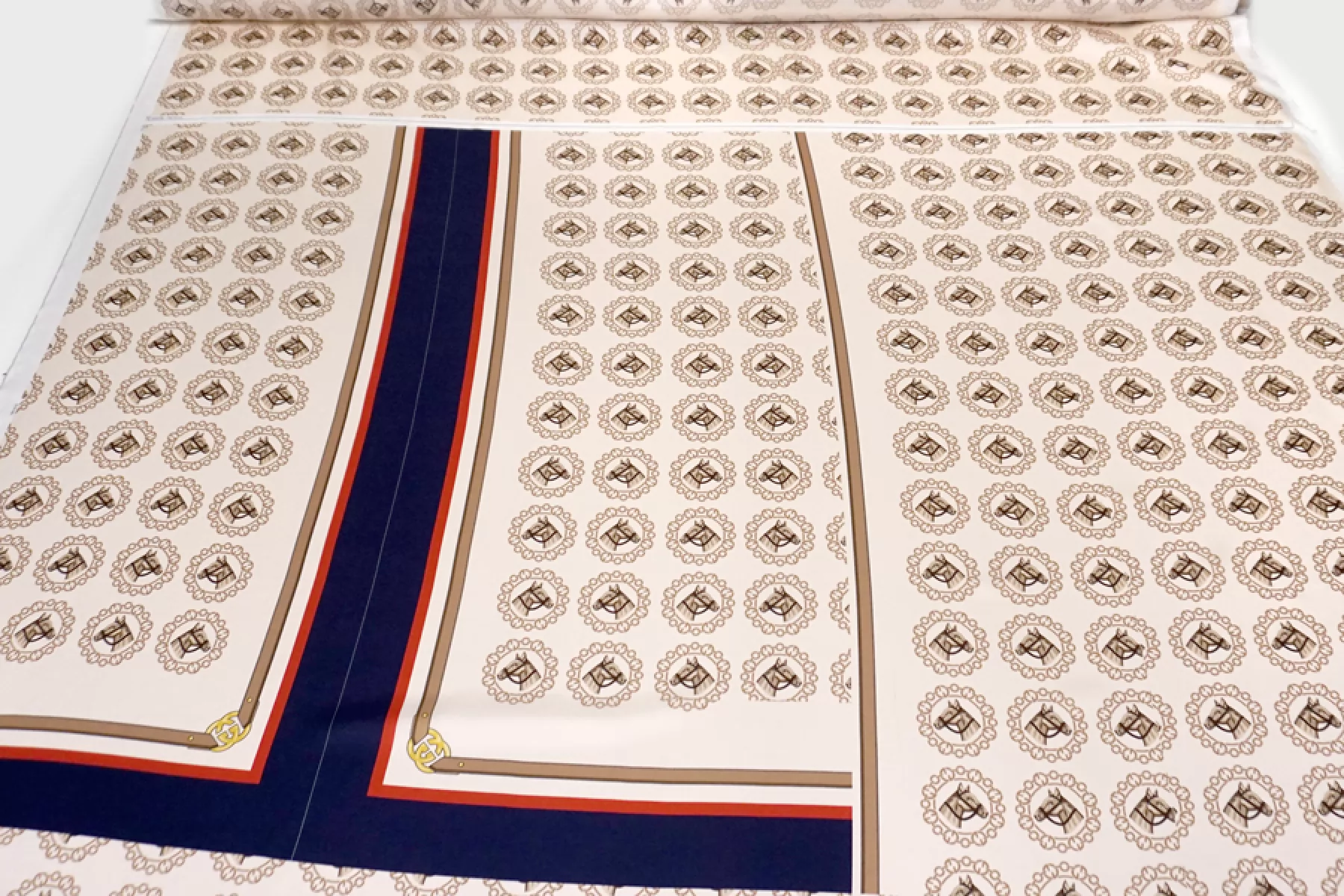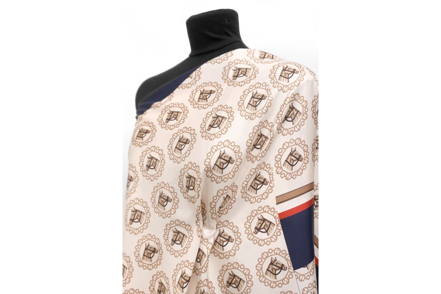Шелковый твил Gucci с принтом в виде лошадей на бежевом с синими и красными полосками. Купон 197 см. С частями для изделия (рубашки с коротким рукавом). Материал легкий, скользящий, очень приятный наощупь. Не просвечивает, не тянется. Идеально на костюм рубашка плюс шорты. Уход деликатный!