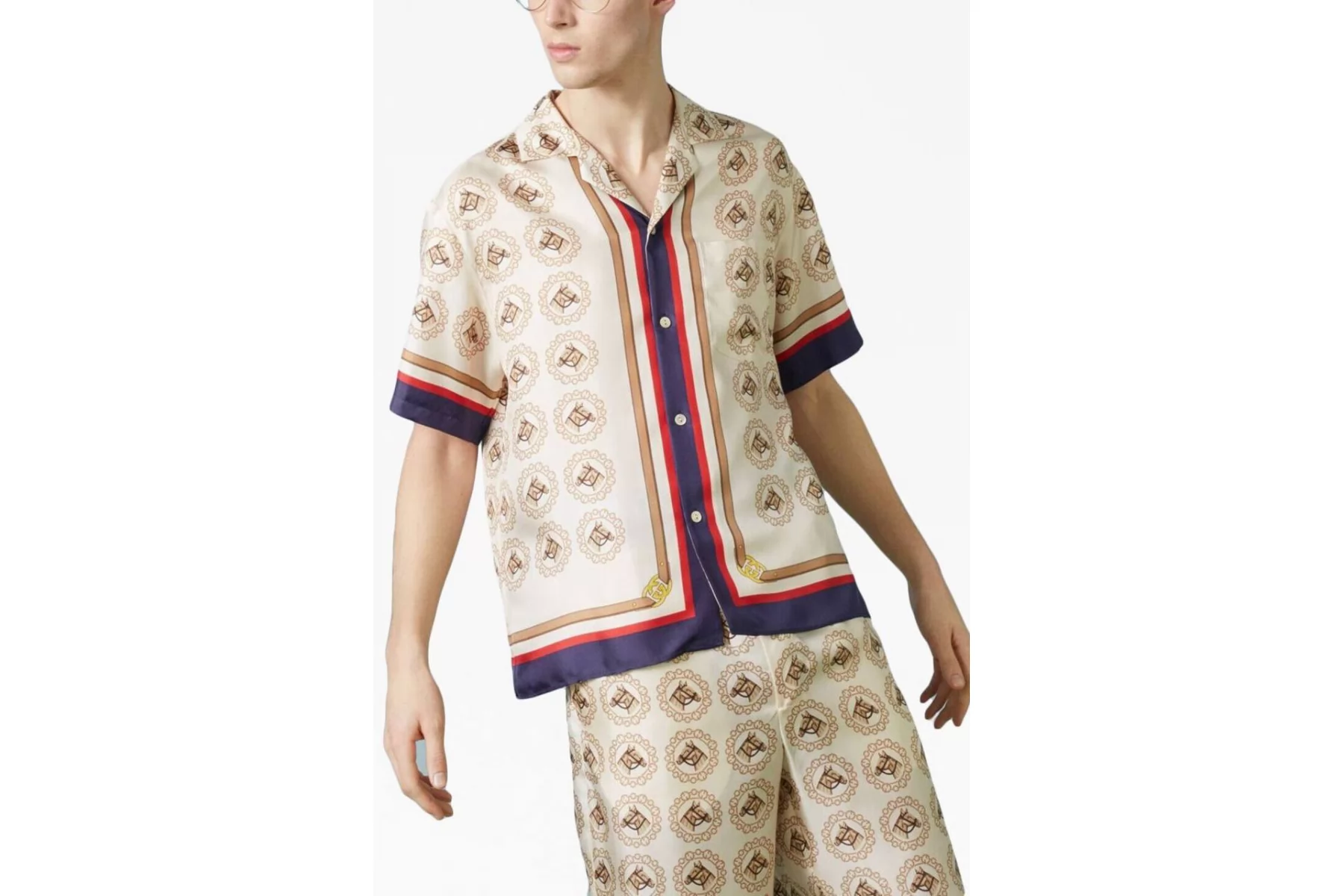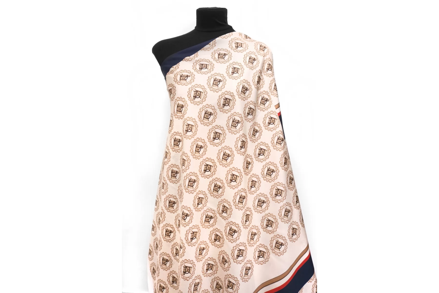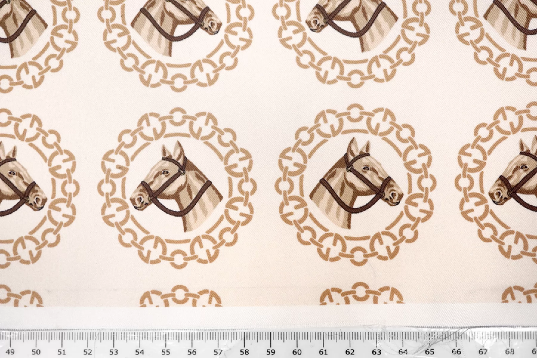 Шелковый твил Gucci с принтом в виде лошадей на бежевом с синими и красными полосками. Купон 197 см. С частями для изделия (рубашки с коротким рукавом). Материал легкий, скользящий, очень приятный наощупь. Не просвечивает, не тянется. Идеально на костюм рубашка плюс шорты. Уход деликатный!