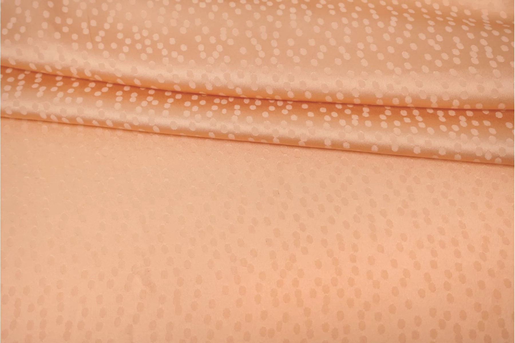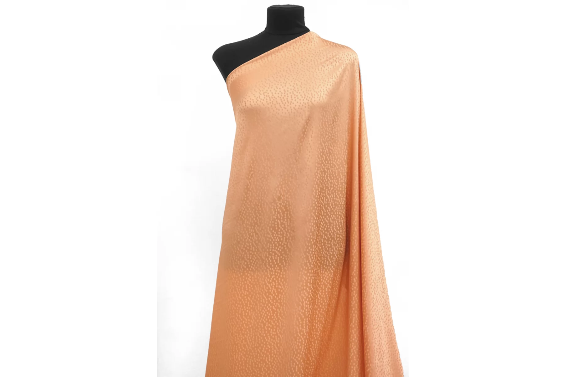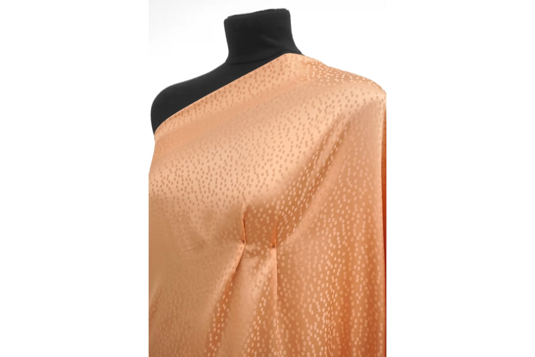 Плательный жаккардовый шелк с ацетатом от GIAMBATTISTA VALLI актуального персикового оттенка. Жаккардовая выработка в виде маленьких пятнышек. Материал тактильно очень мягкий и приятный на ощупь, гладкий и скользящий. Легкий и воздушный. Не тянется, но слегка пружинит за счет плетения. Красиво струится. Совсем немного просвечивает силуэт. Немного мнется. Форму не держит, но красив в драпировке. Идеальный вариант на блузки и платья. Уход, как и за любым шелком, деликатный.