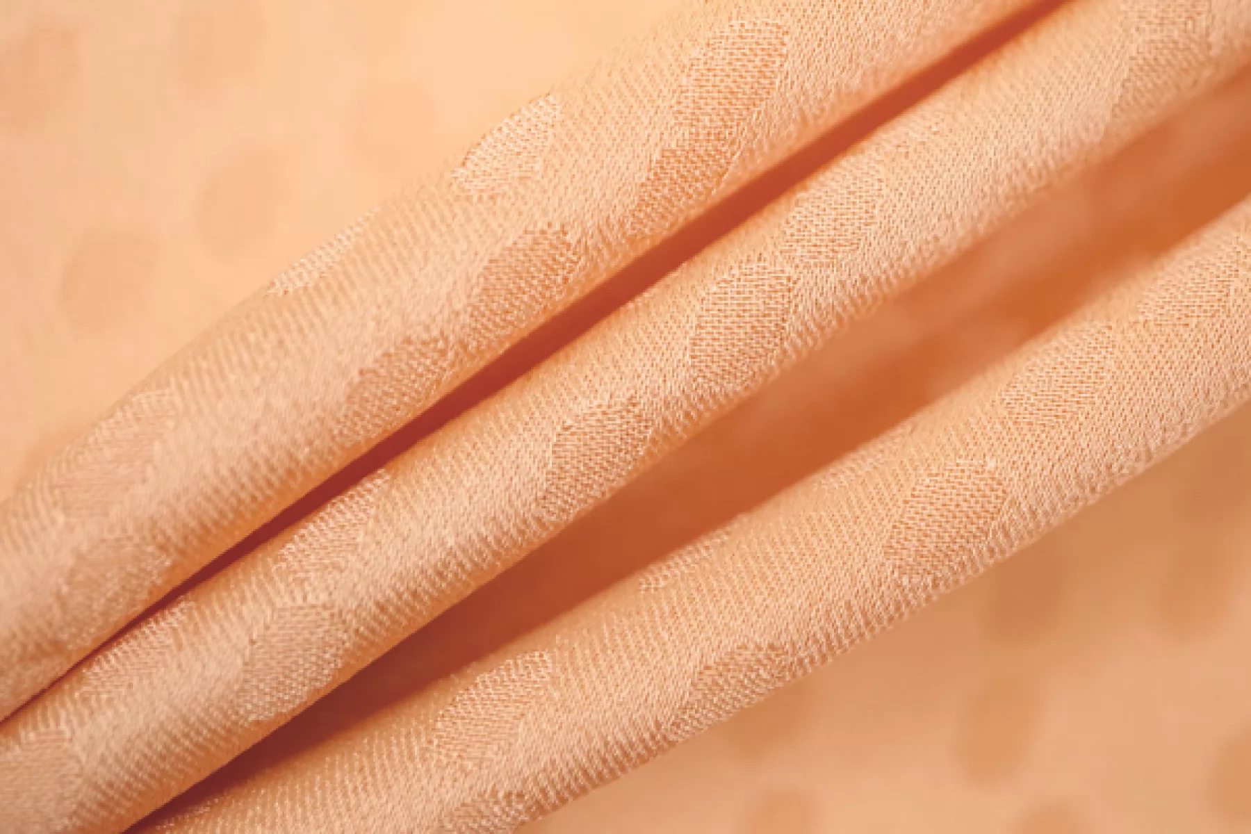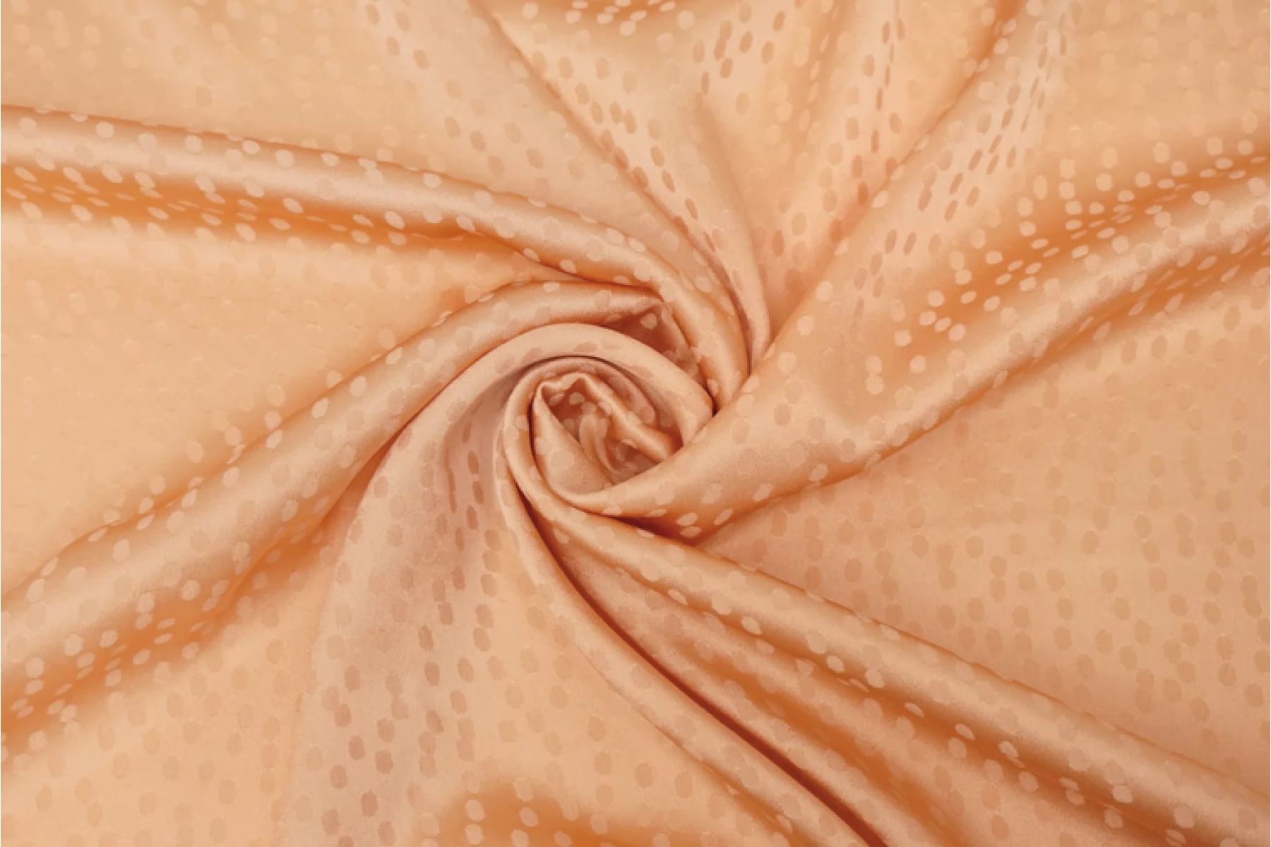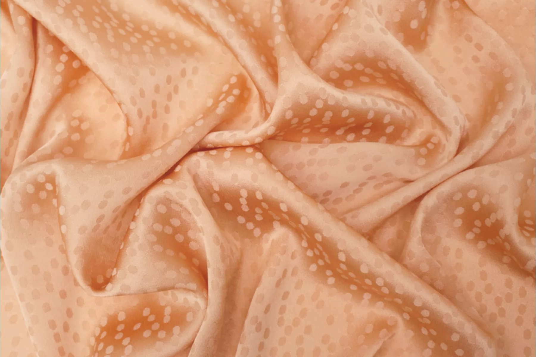 Плательный жаккардовый шелк с ацетатом от GIAMBATTISTA VALLI актуального персикового оттенка. Жаккардовая выработка в виде маленьких пятнышек. Материал тактильно очень мягкий и приятный на ощупь, гладкий и скользящий. Легкий и воздушный. Не тянется, но слегка пружинит за счет плетения. Красиво струится. Совсем немного просвечивает силуэт. Немного мнется. Форму не держит, но красив в драпировке. Идеальный вариант на блузки и платья. Уход, как и за любым шелком, деликатный.