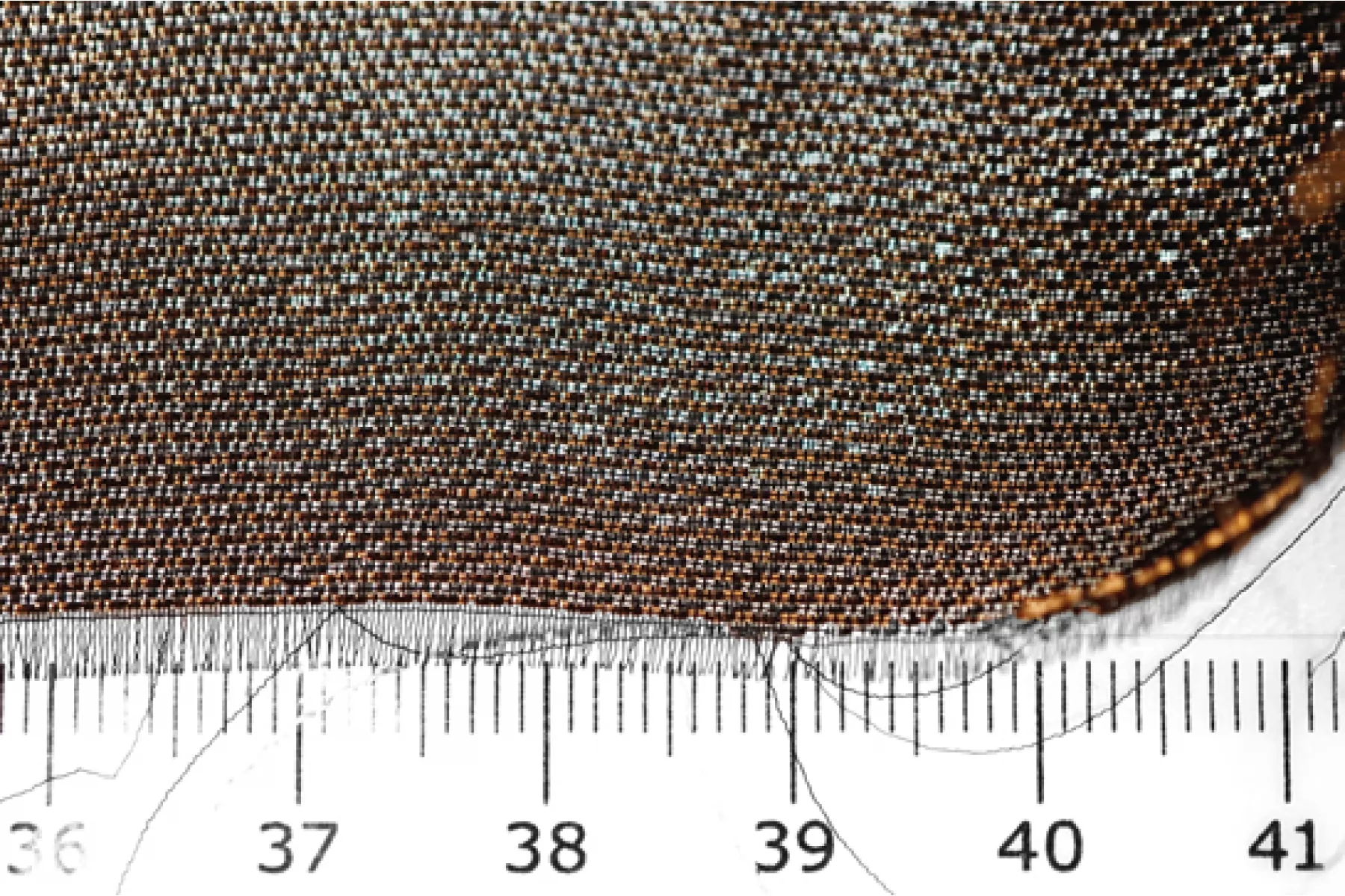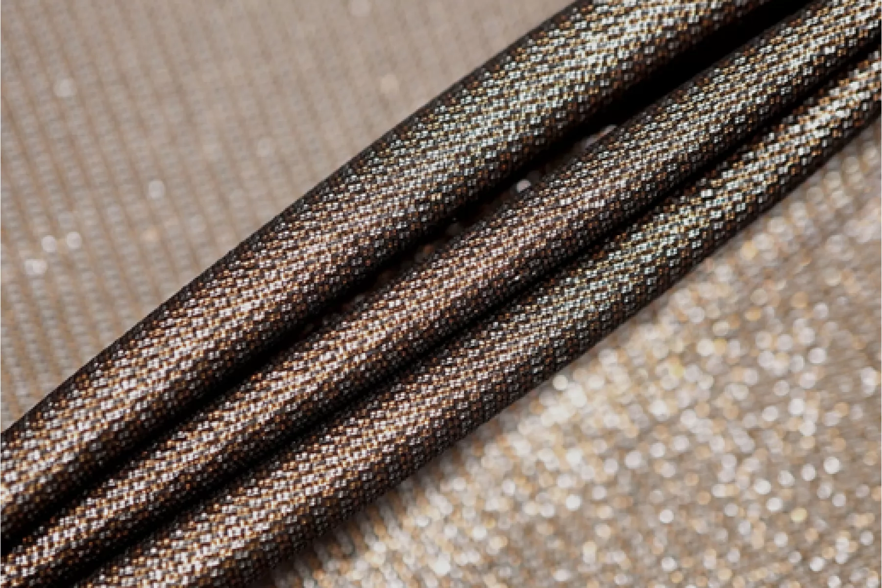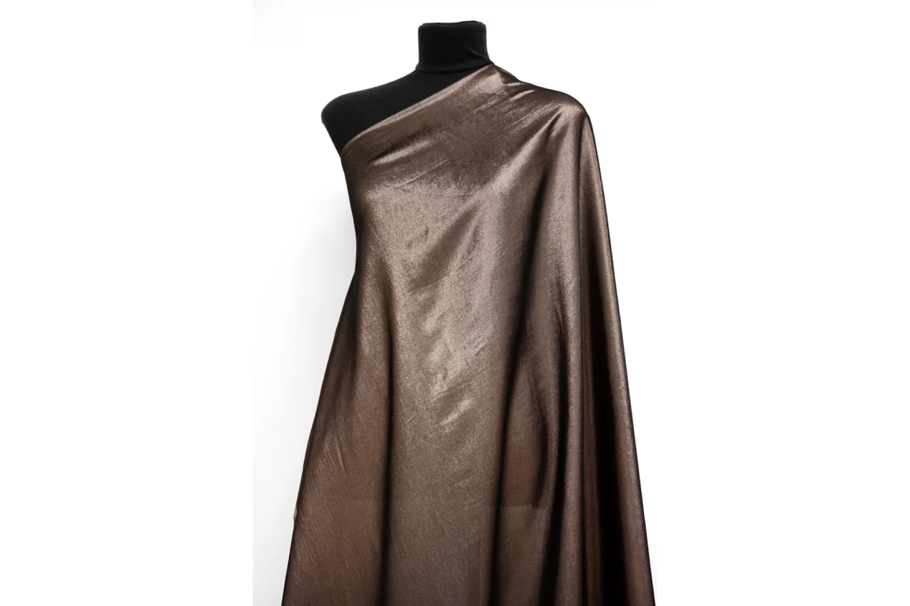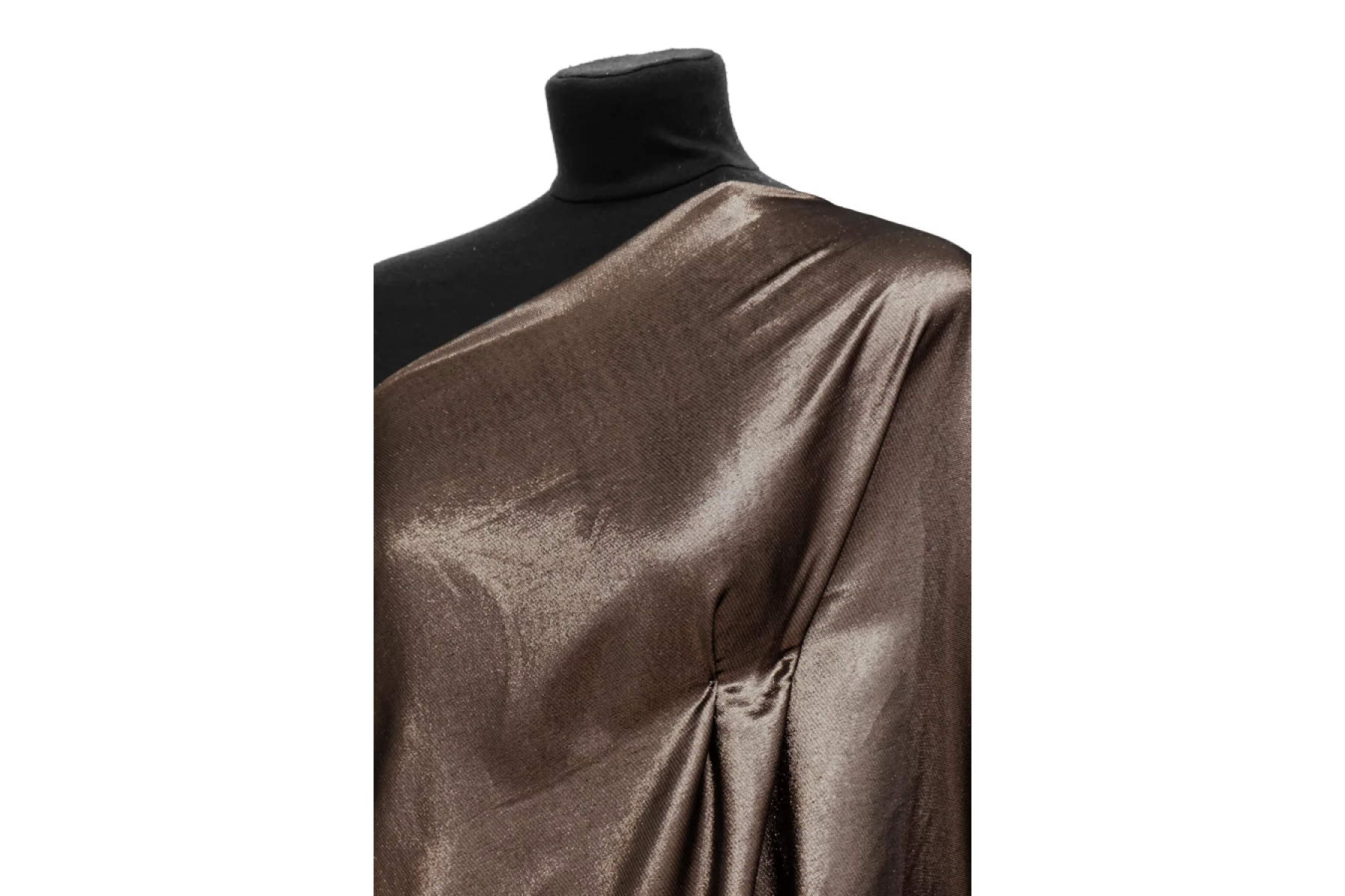 Прекрасный шелк с бронзовым люрексом от бренда MAX MARA. Гладкий. Чувствуются нити люрекса. Одна сторона темнее, другая светлее и насыщеннее. Просвечивает. Форму не держит. Сминается. Не тянется. Прекрасный вариант для платья, юбки, блузки, подойдет для вечерней группы. При необходимости используйте подкладочный материал. Уход за материалом деликатный.