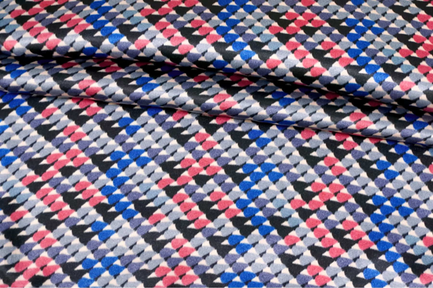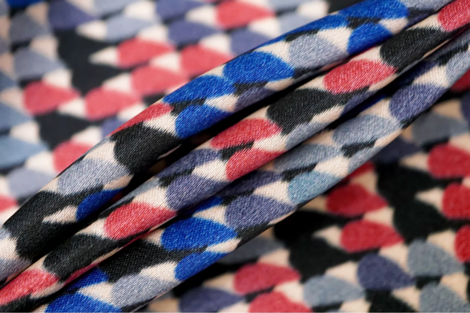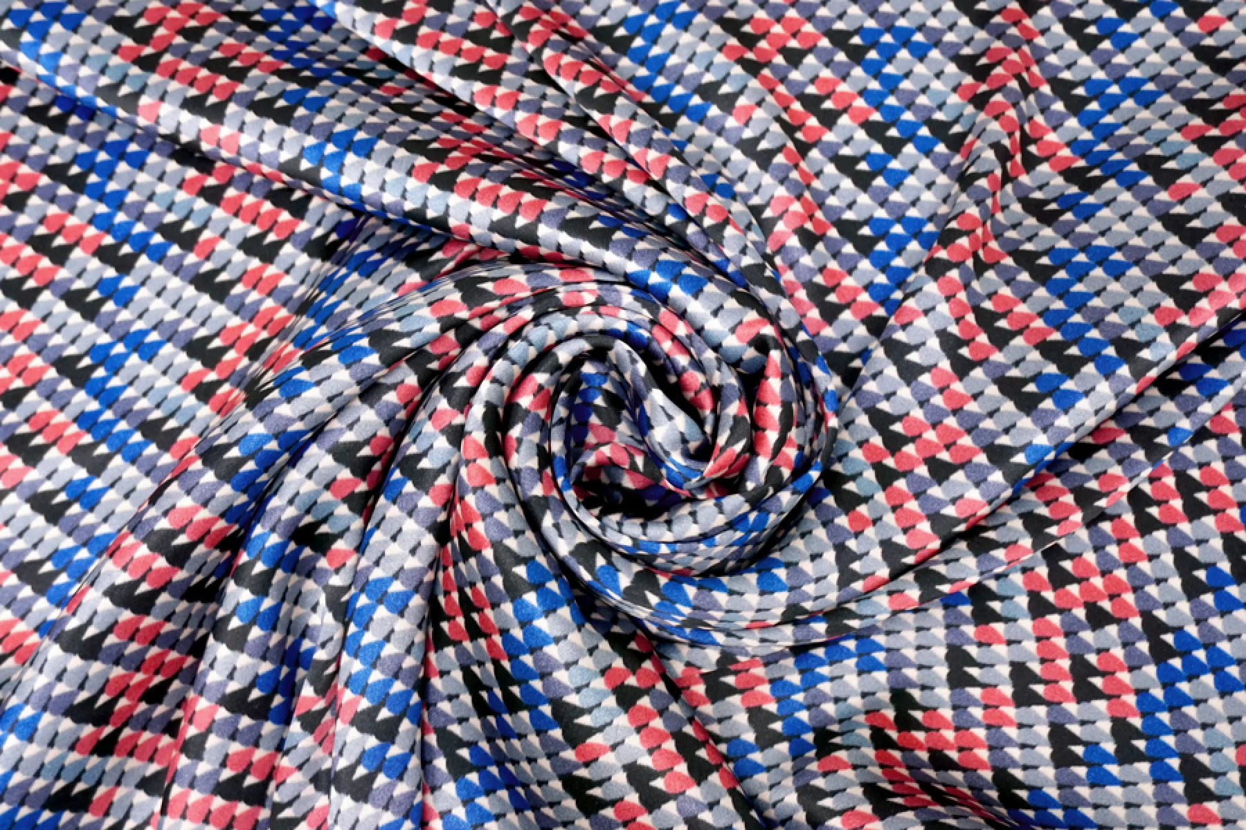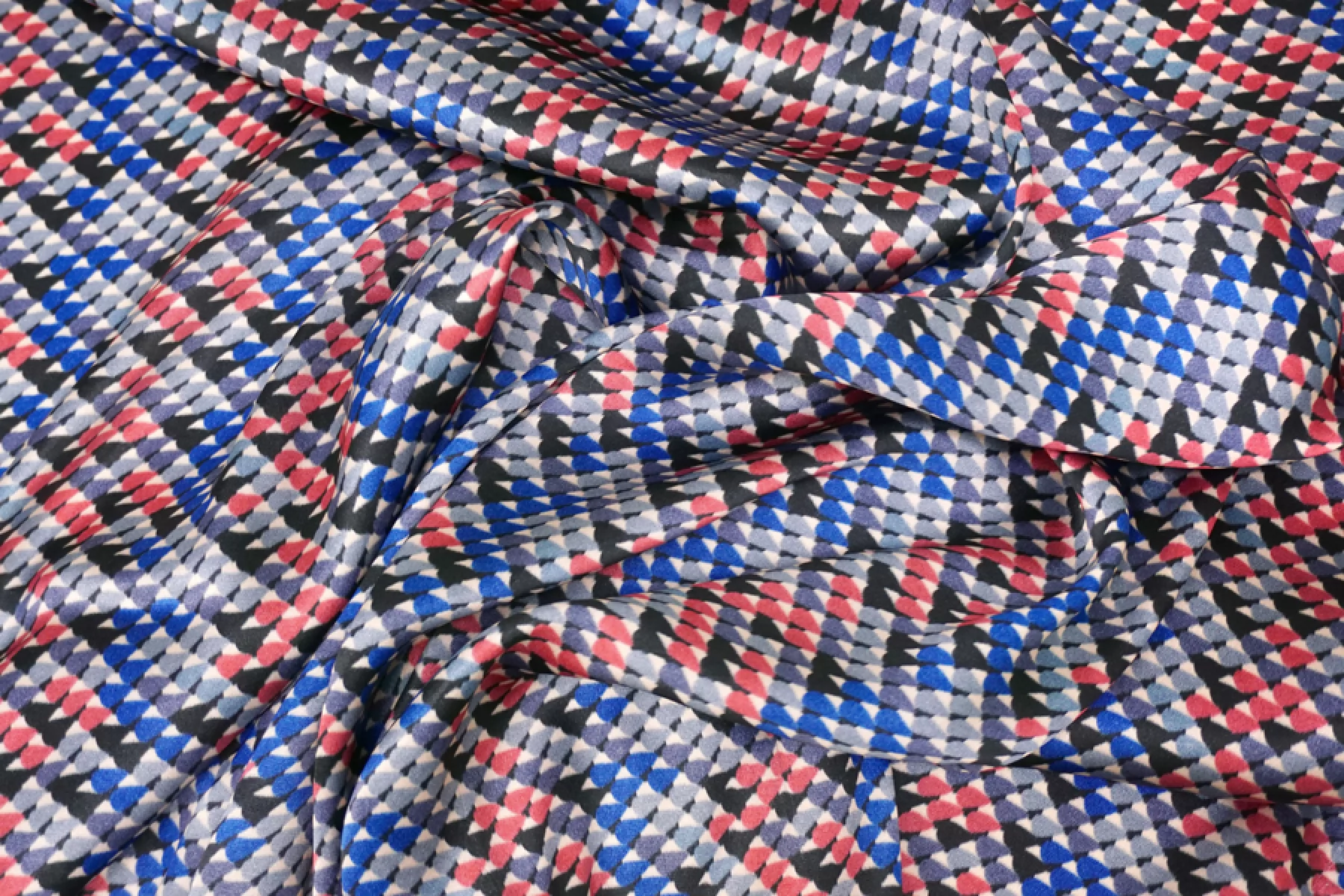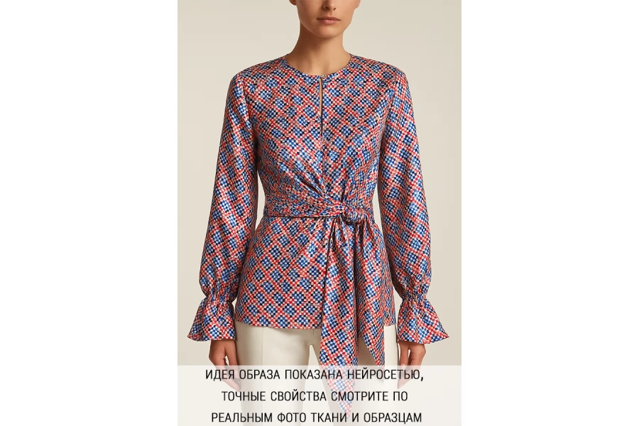 Классный атласный шелк с вискозой от PRADA. Принт в виде множества маленьких закругленных треугольников в бледно-красном, серо-голубой, серо-синем, черном и молочном оттенке. Материал наощупь гладкий и скользящий. Форму не держит. Очень красиво струится, пластичен. Не просвечивает. Не тянется. Не мнется. Отлично подойдет на платья, юбки.