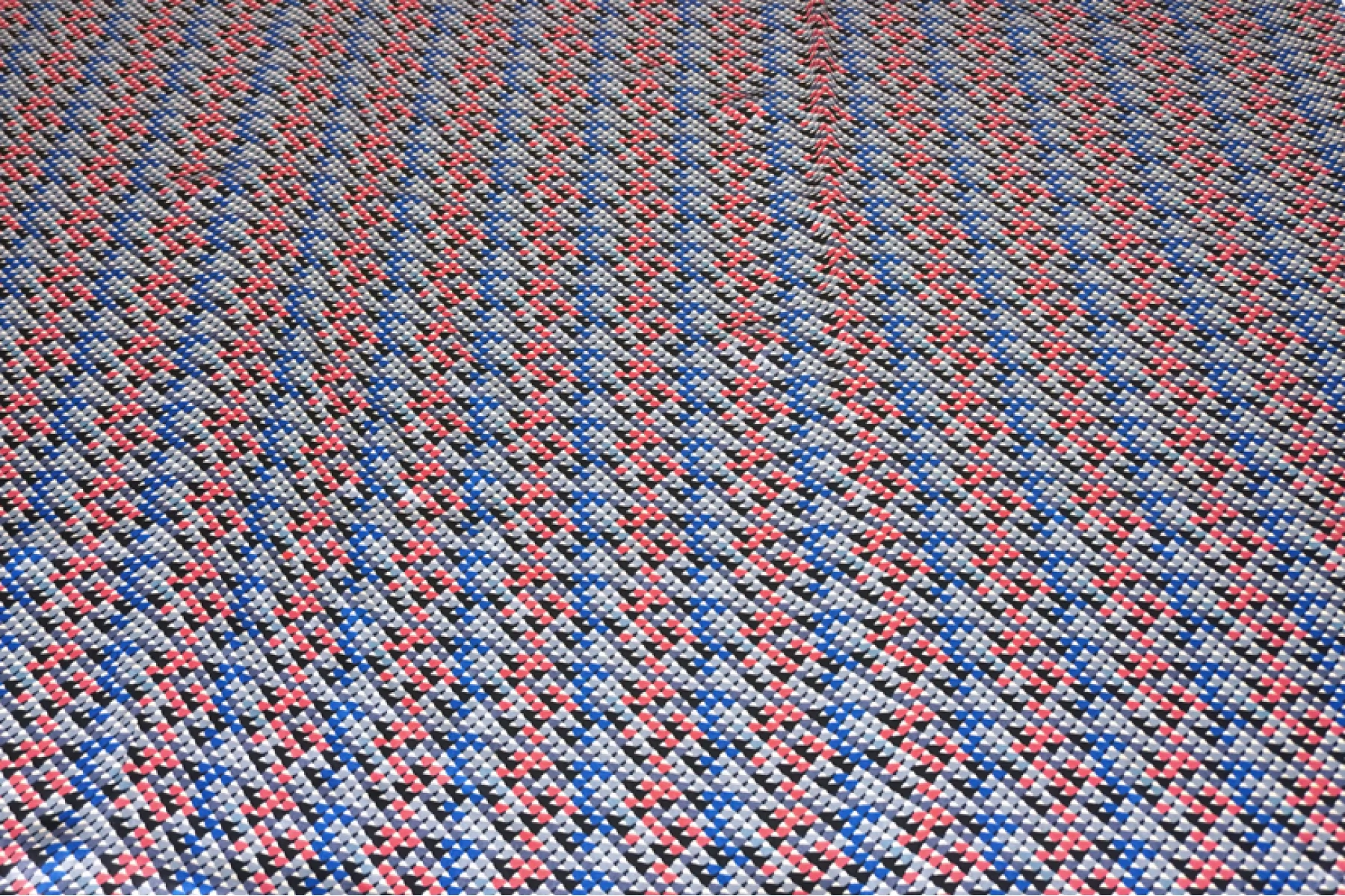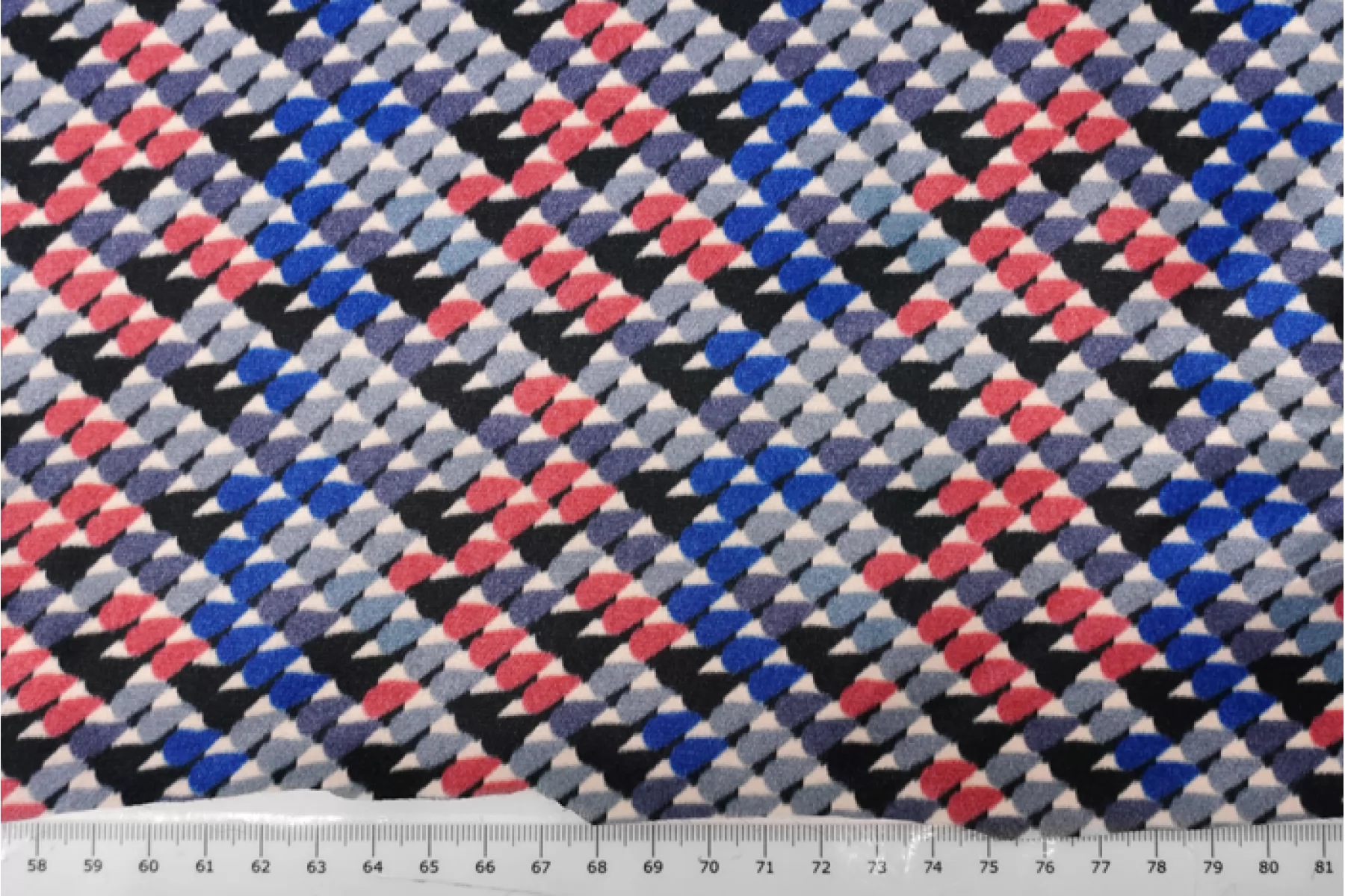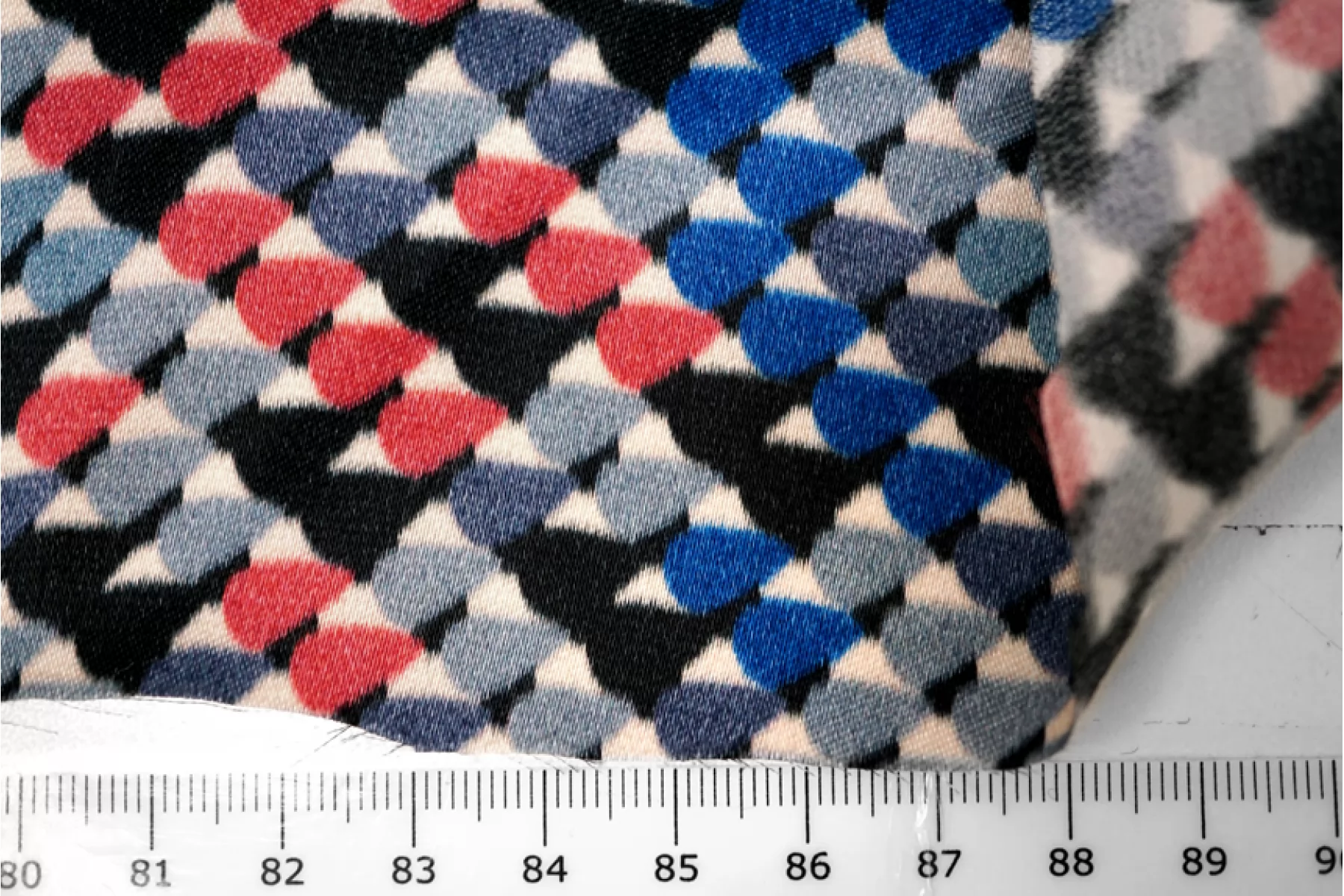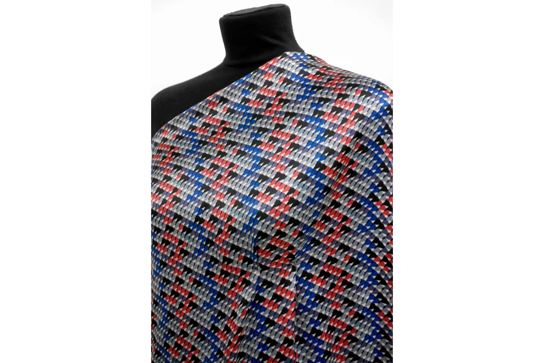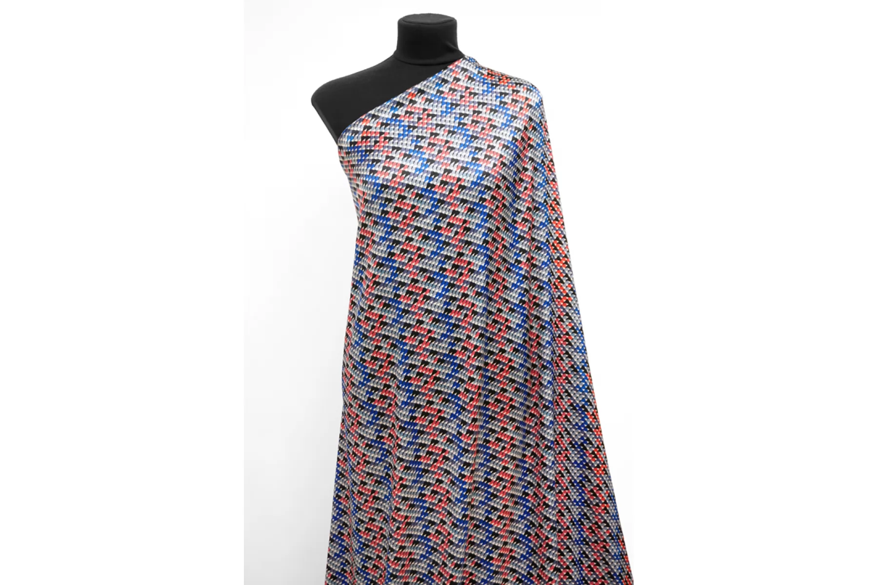 Классный атласный шелк с вискозой от PRADA. Принт в виде множества маленьких закругленных треугольников в бледно-красном, серо-голубой, серо-синем, черном и молочном оттенке. Материал наощупь гладкий и скользящий. Форму не держит. Очень красиво струится, пластичен. Не просвечивает. Не тянется. Не мнется. Отлично подойдет на платья, юбки.