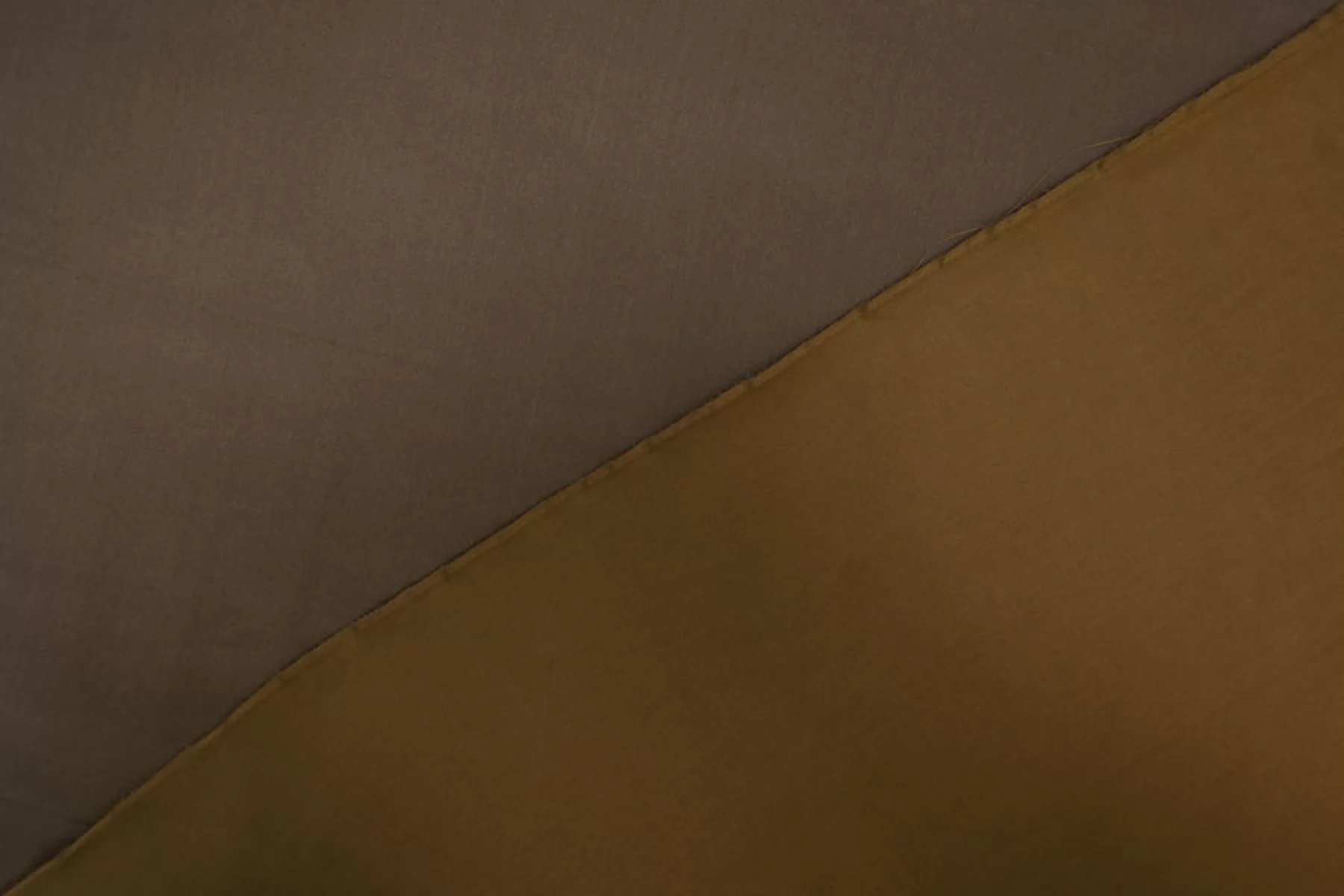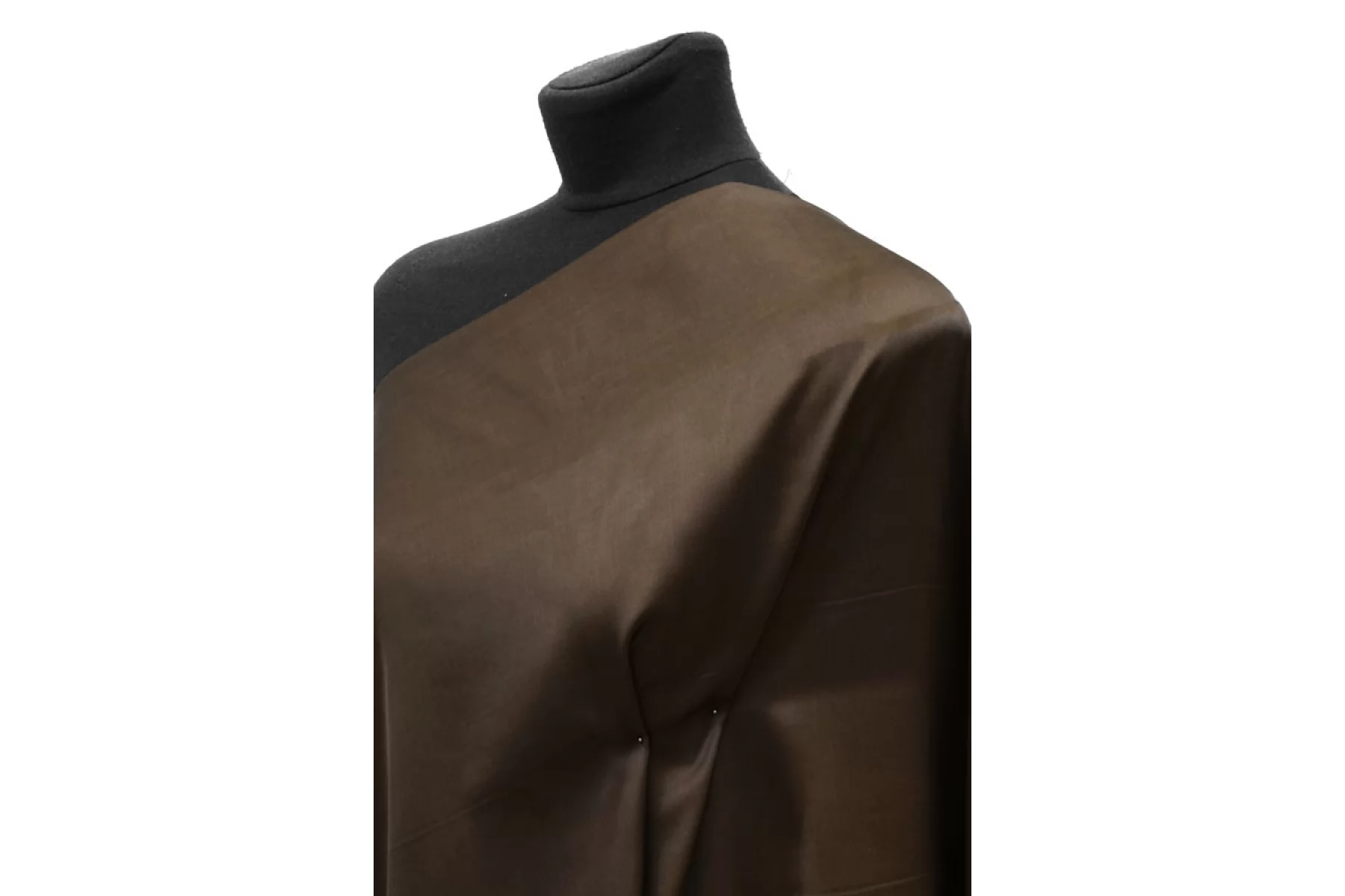 Тонкий плательно-блузочный шёлк с добавлением вискозы, плетение сатиновое, цвет коричневый с лёгким охристо-горчичным переливом, т.к. шёлковые нити коричневые а вискозные охристо-горчичные. Материал мягкий, легкий, гладкий. Немного просвечивает. Мнется мало. Пластичный, форму не держит, красив в складке, не тянется. Отличный вариант на платья, блузки, юбки. Уход, как и за любым шелком, деликатный.