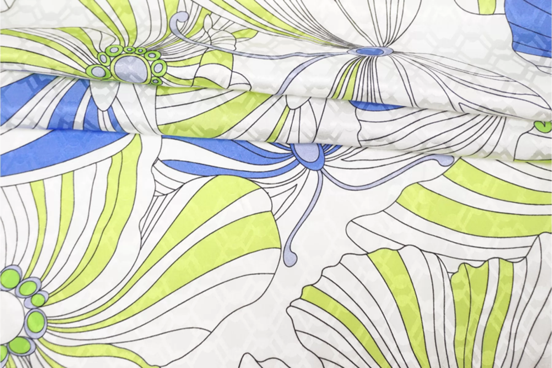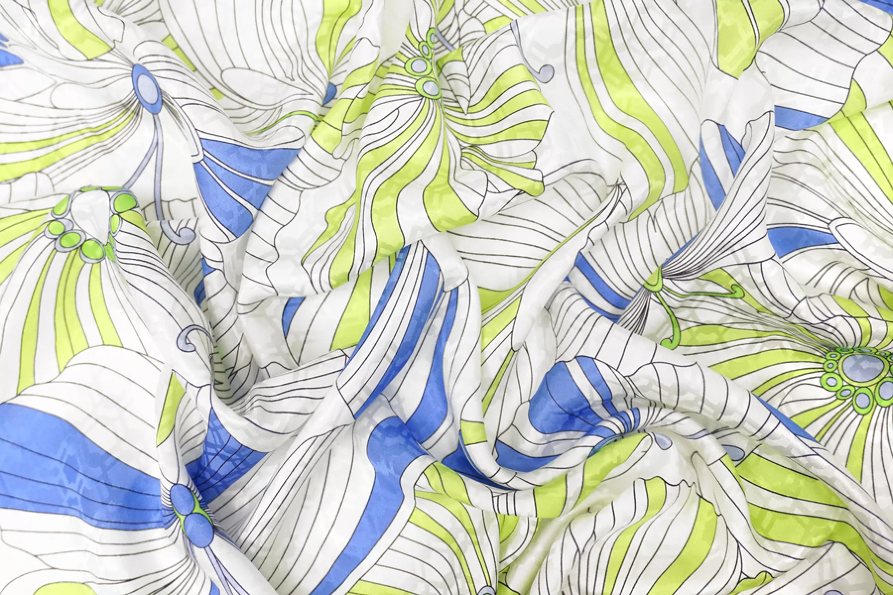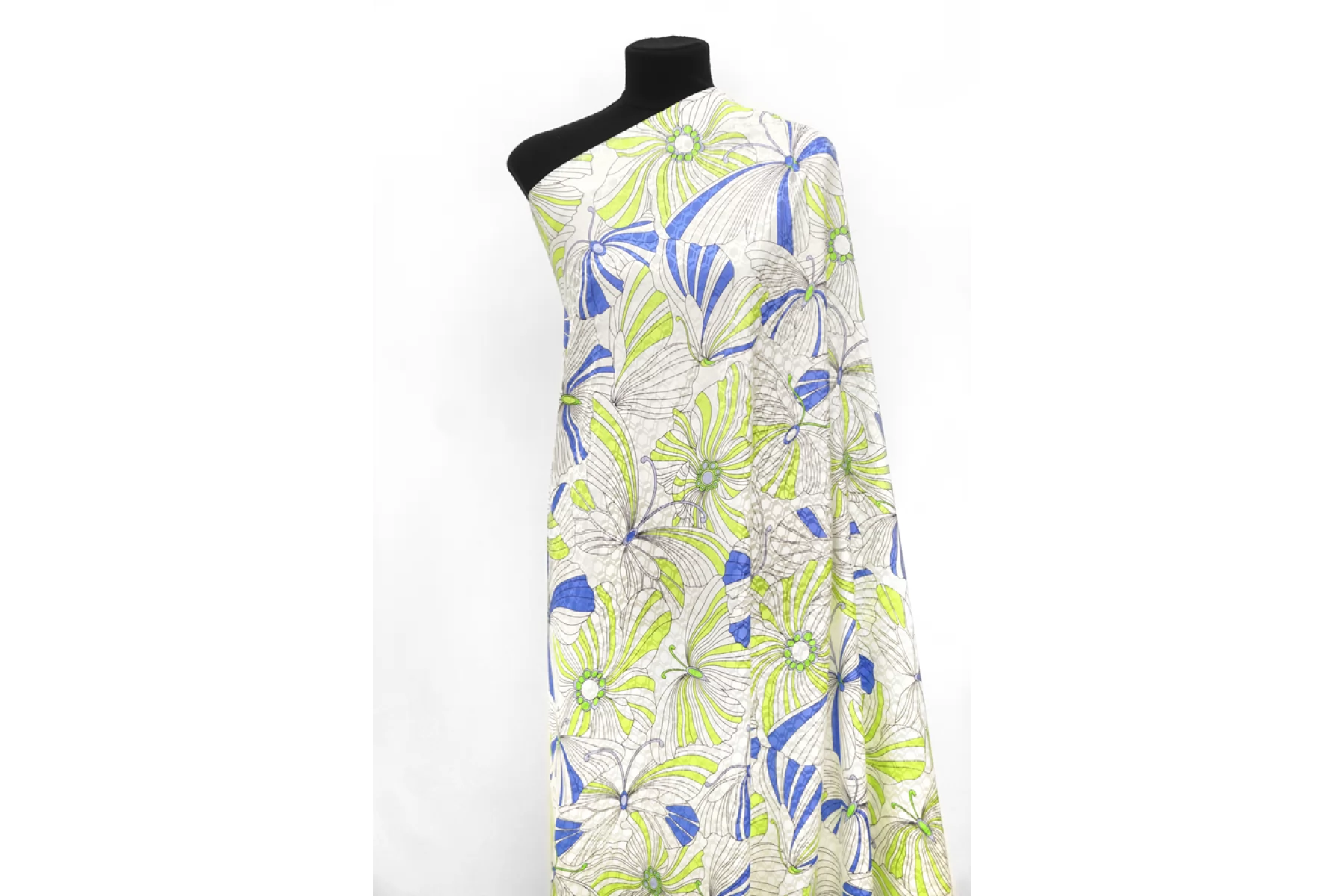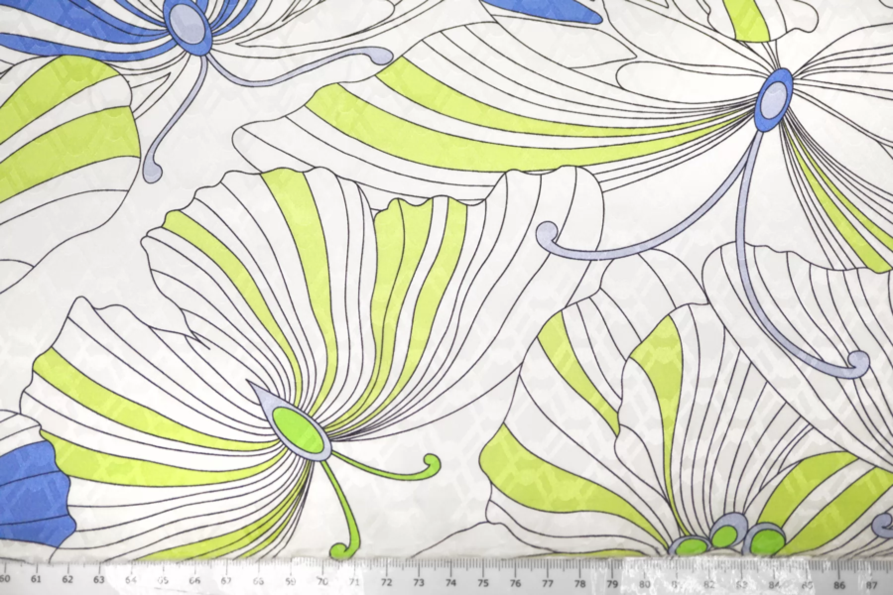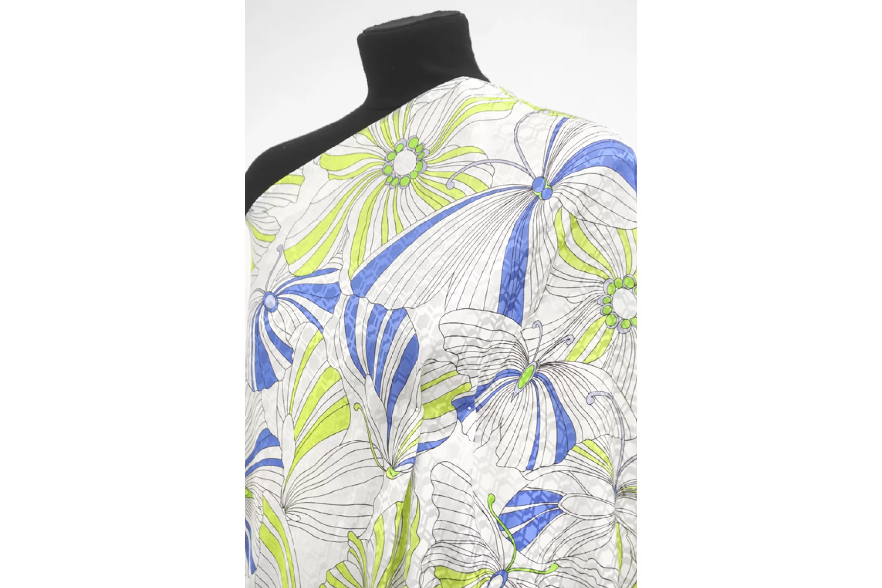 Очень красивый плательный шелк от бренда P.A.R.O.S.H с жаккардовой выработкой в виде геометрического орнамента белого цвета и принтом в виде крупных цветов и бабочек черного контура с салатовыми и синими заполнениями. Ткань тактильно приятная, гладкая и скользящая, красиво переливается. Едва просвечивает силуэт. Очень пластичная и красивая в складках. Форму не держит. Отлично подойдет на легкие платья, юбки, блузки.