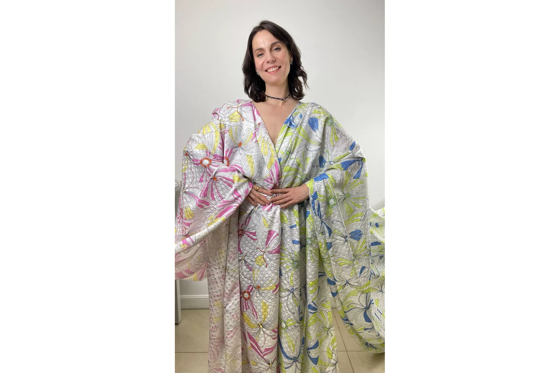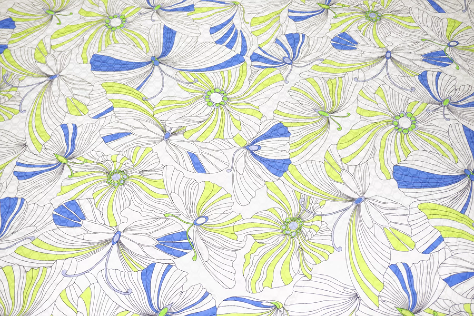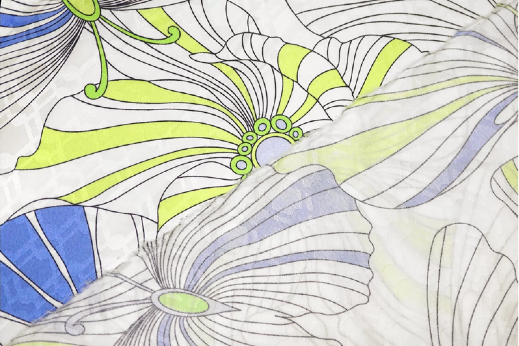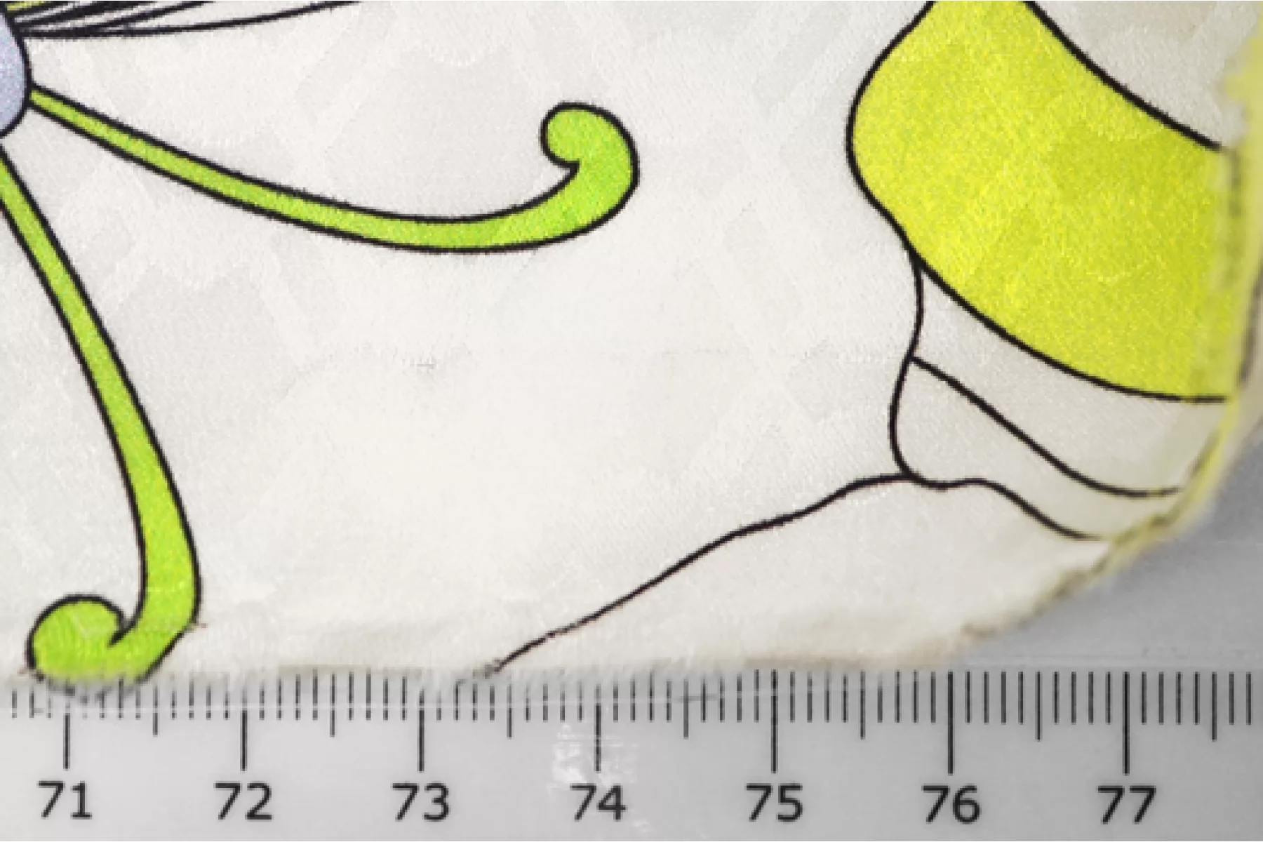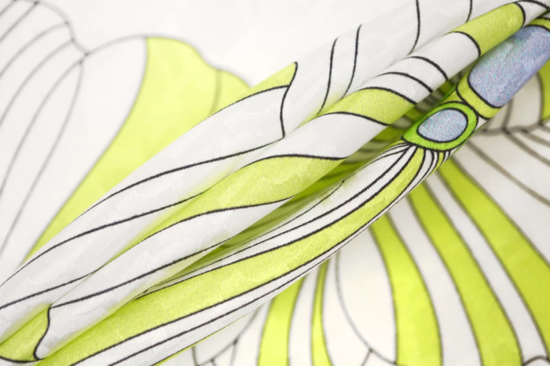 Очень красивый плательный шелк от бренда P.A.R.O.S.H с жаккардовой выработкой в виде геометрического орнамента белого цвета и принтом в виде крупных цветов и бабочек черного контура с салатовыми и синими заполнениями. Ткань тактильно приятная, гладкая и скользящая, красиво переливается. Едва просвечивает силуэт. Очень пластичная и красивая в складках. Форму не держит. Отлично подойдет на легкие платья, юбки, блузки.