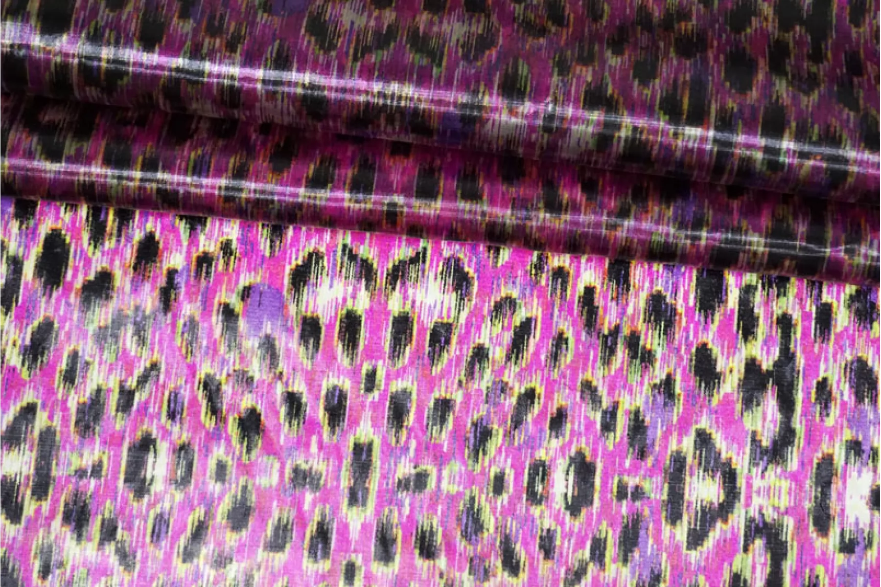 Шелковая органза от бренда REDEMTION с леопардовым принтом в цвете фуксии с добавлением виниловой нити. Упругая, легкая, тонкая. Просвечивает. Не тянется. Подойдет на блузку, платье, тунику или юбку. Уход, как и за любым шелком, деликатный.
