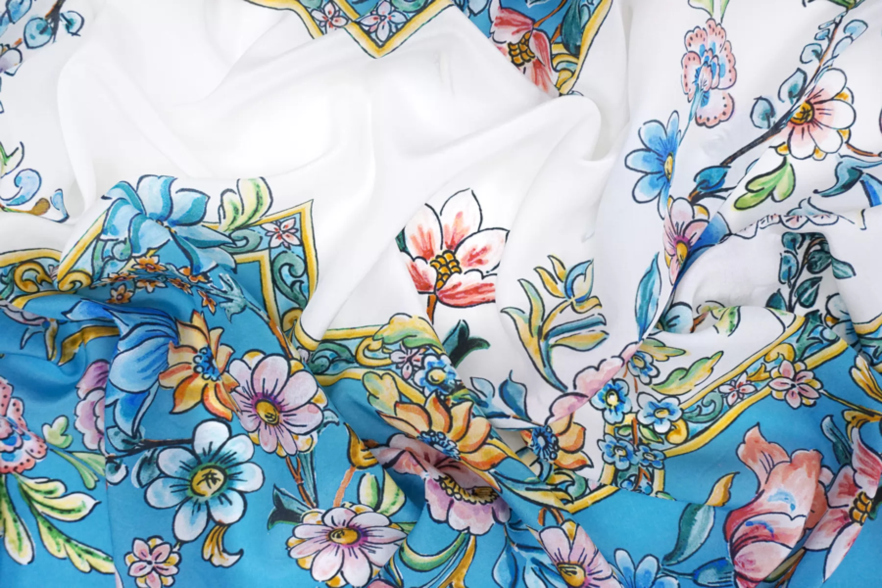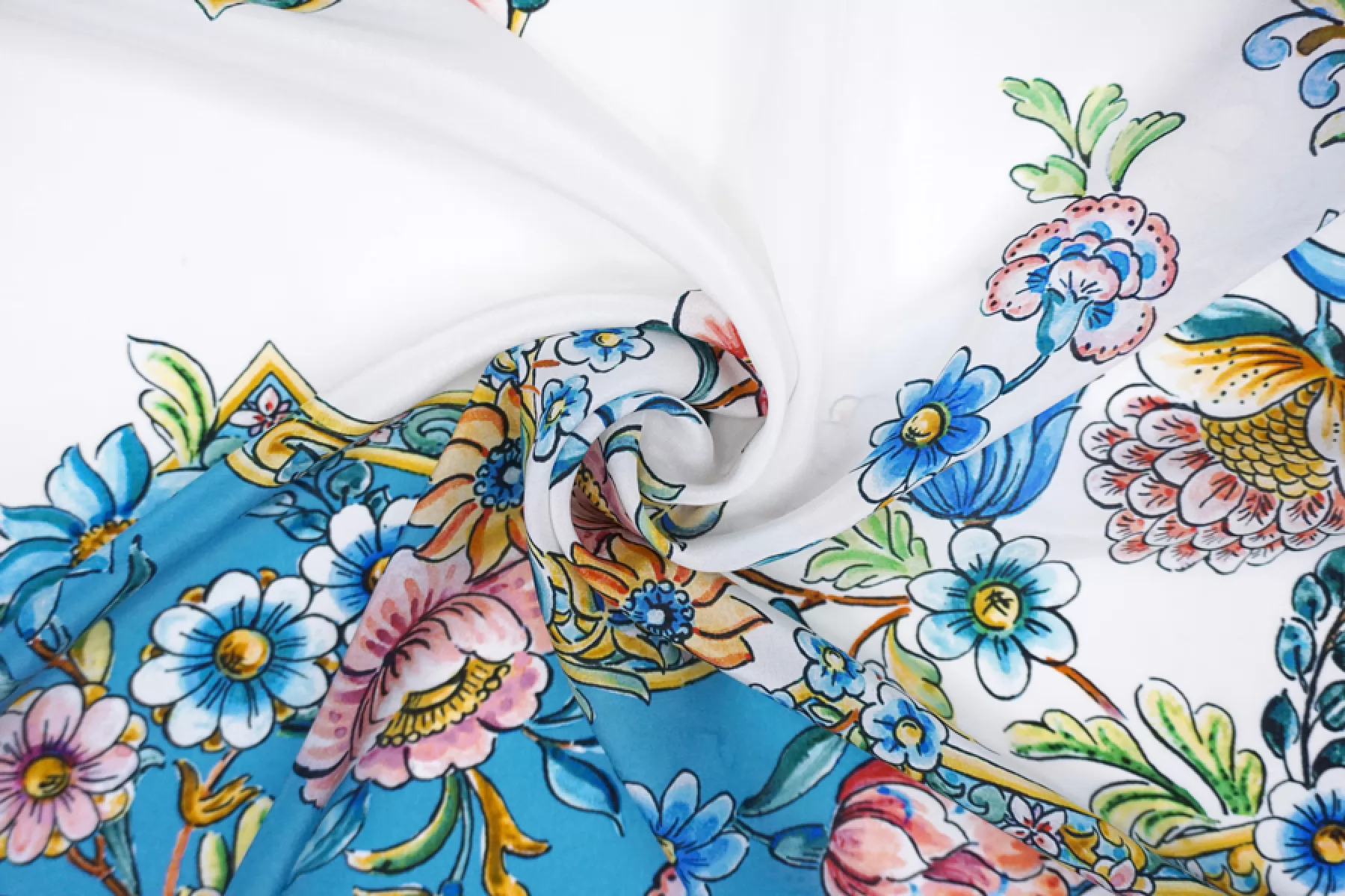 !Внимание! Цена указана за один платок 132*138 см ! Очень красивый и нежный шелковый крепдешин, в основе которого фон белого оттенка с цветочным принтом из голубых, розовых, зеленых, оранжевых и желтых оттенков. Тактильно очень приятный, легкий, летящий, пластичный, не тянется, немного просвечивает. Смотрится очень дорого! Прекрасно подойдет на блузку, тунику, головной убор и станет прекрасным аксессуаром в женском гардеробе. Уход, как и за любым шелком, деликатный.