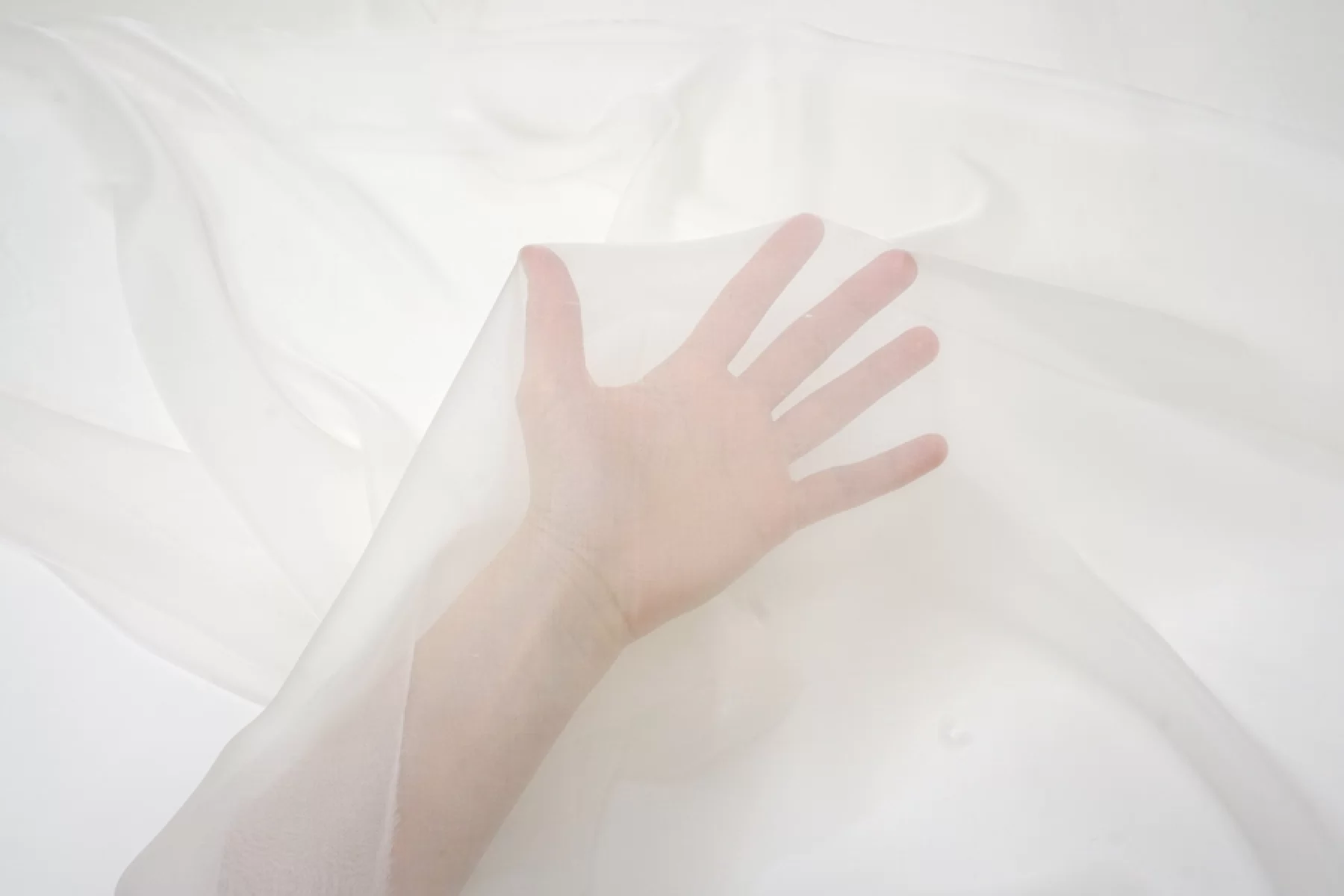 ВНИМАНИЕ!! Зацепки/затяжки каждые 20-50см, см. на фото. Прекрасный шелковый шифон в белом цвете. Струящийся, летящий, воздушный, очень приятный к телу, не тянется. Уход, как и за любым шелком, деликатный. Прозрачный. Сминается не сильно. Подойдет на платье, блузку, юбку.