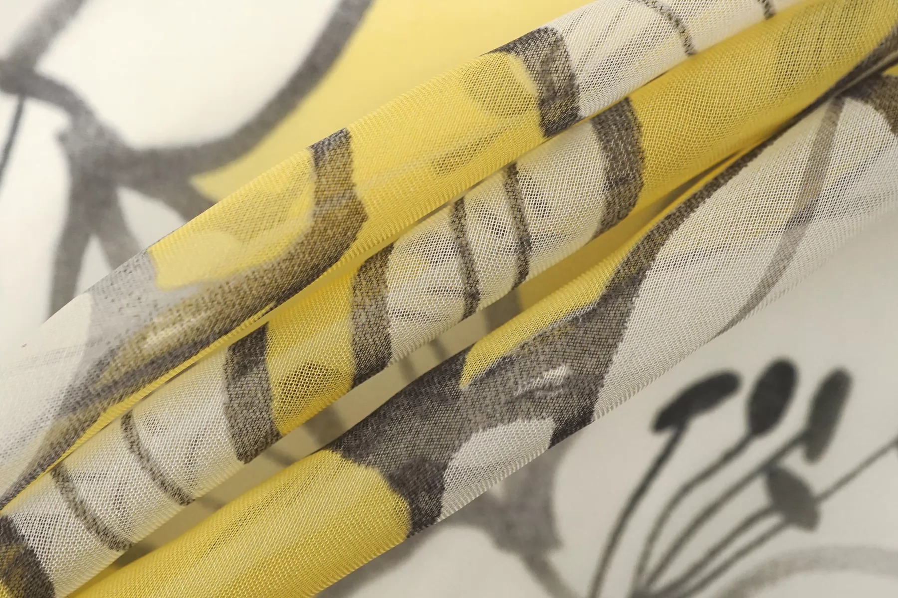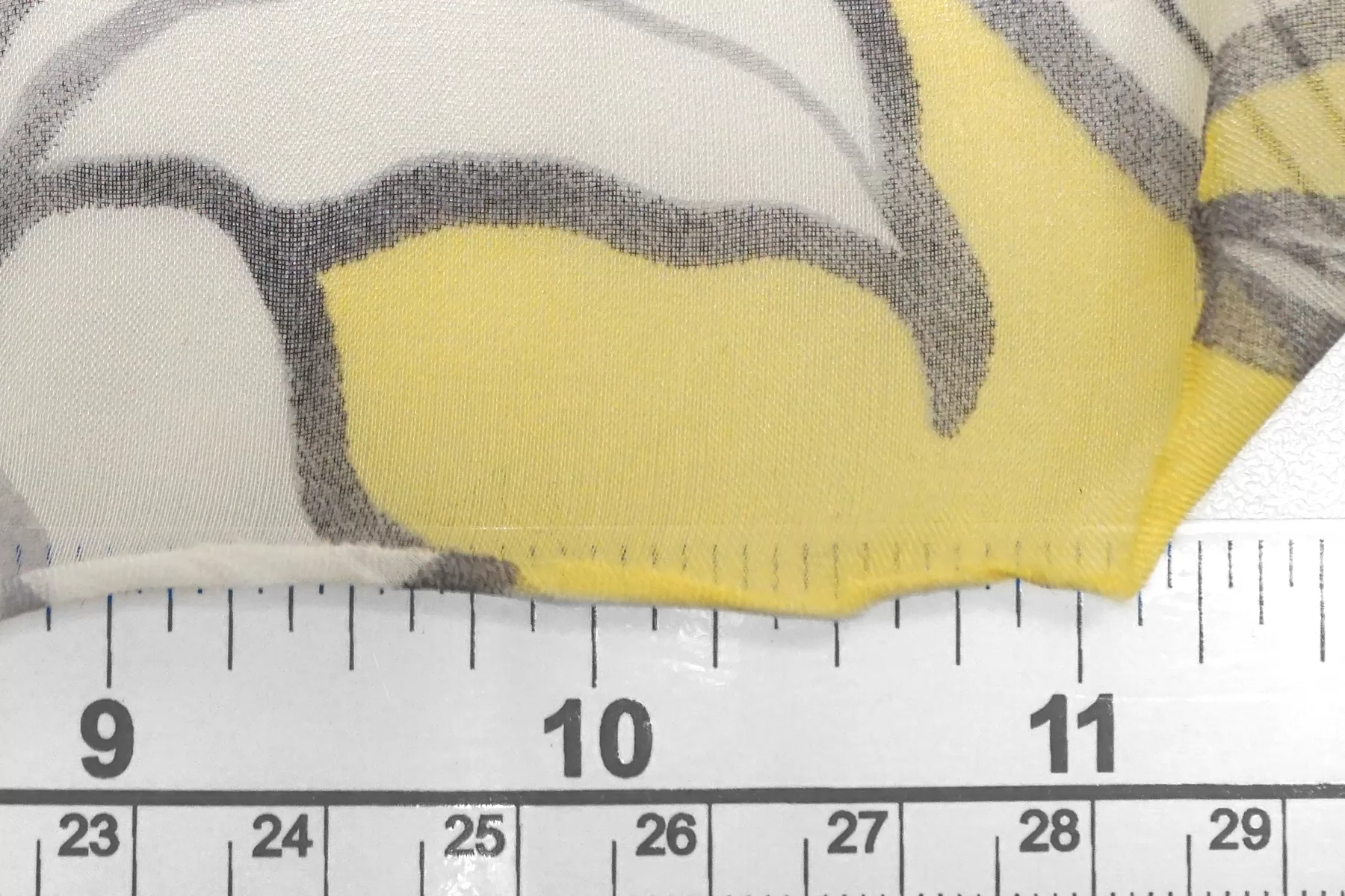 Прекрасный шелковый шифон от бренда Max Mara, принт цветочный черно-белый на жёлтом фоне. Струящийся, летящий, воздушный, очень приятный и нежный к телу. Уход, как и за любым шелком, деликатный. Прозрачный. Сминается несильно. Подойдет на платье, блузку, юбку.