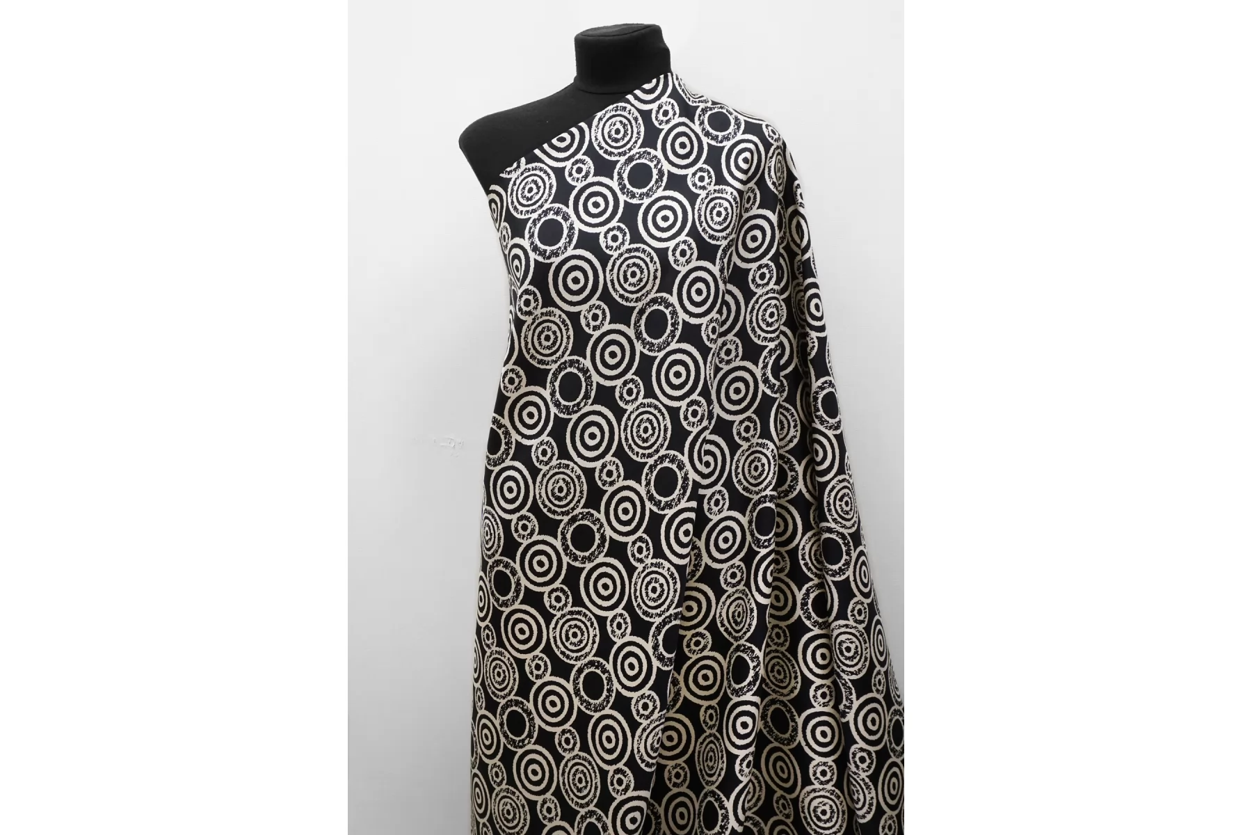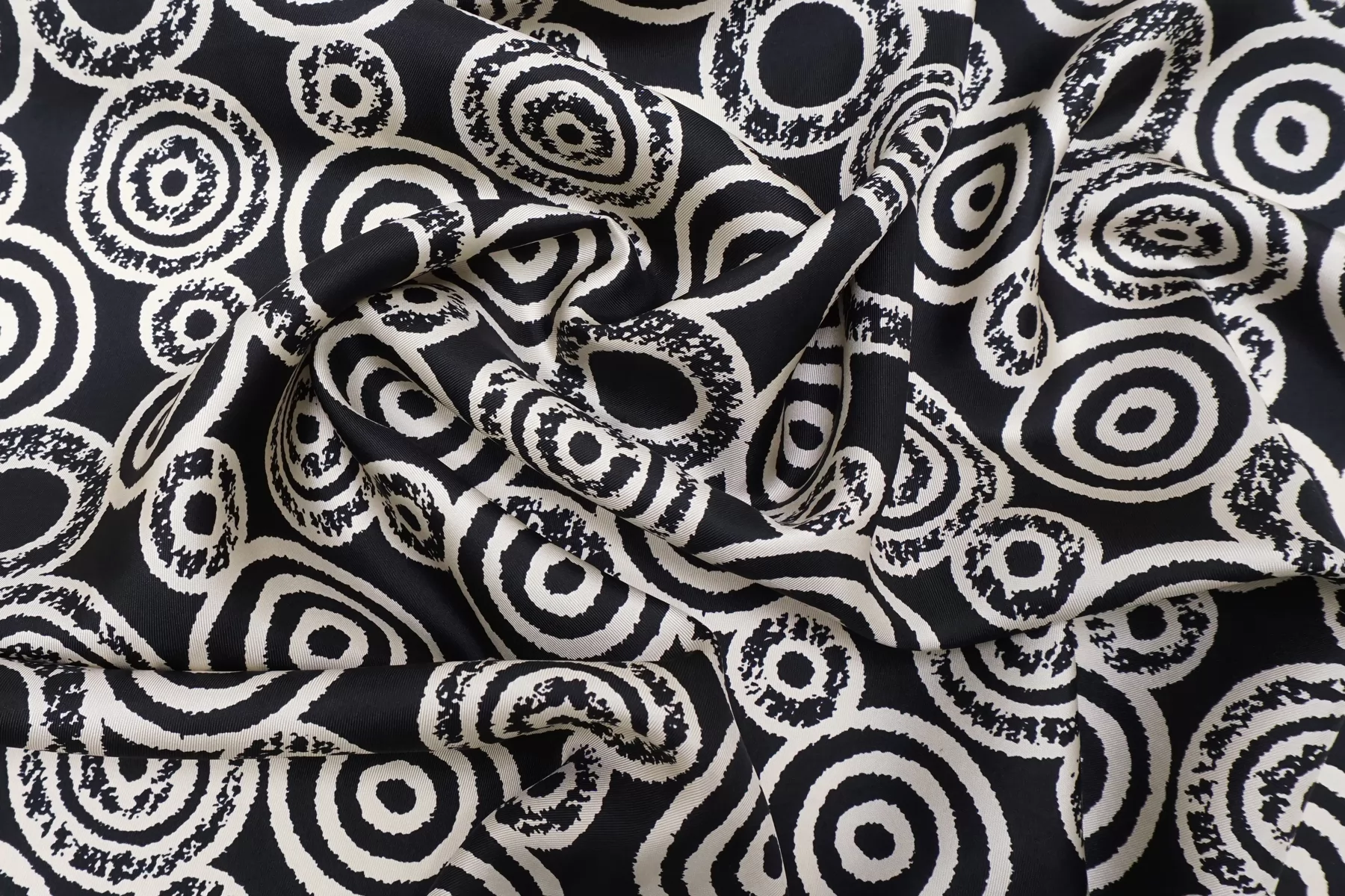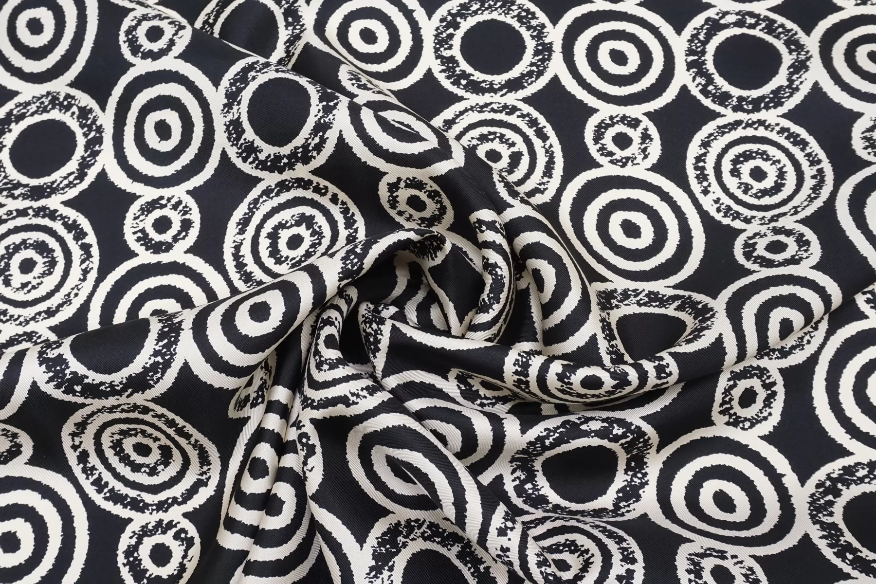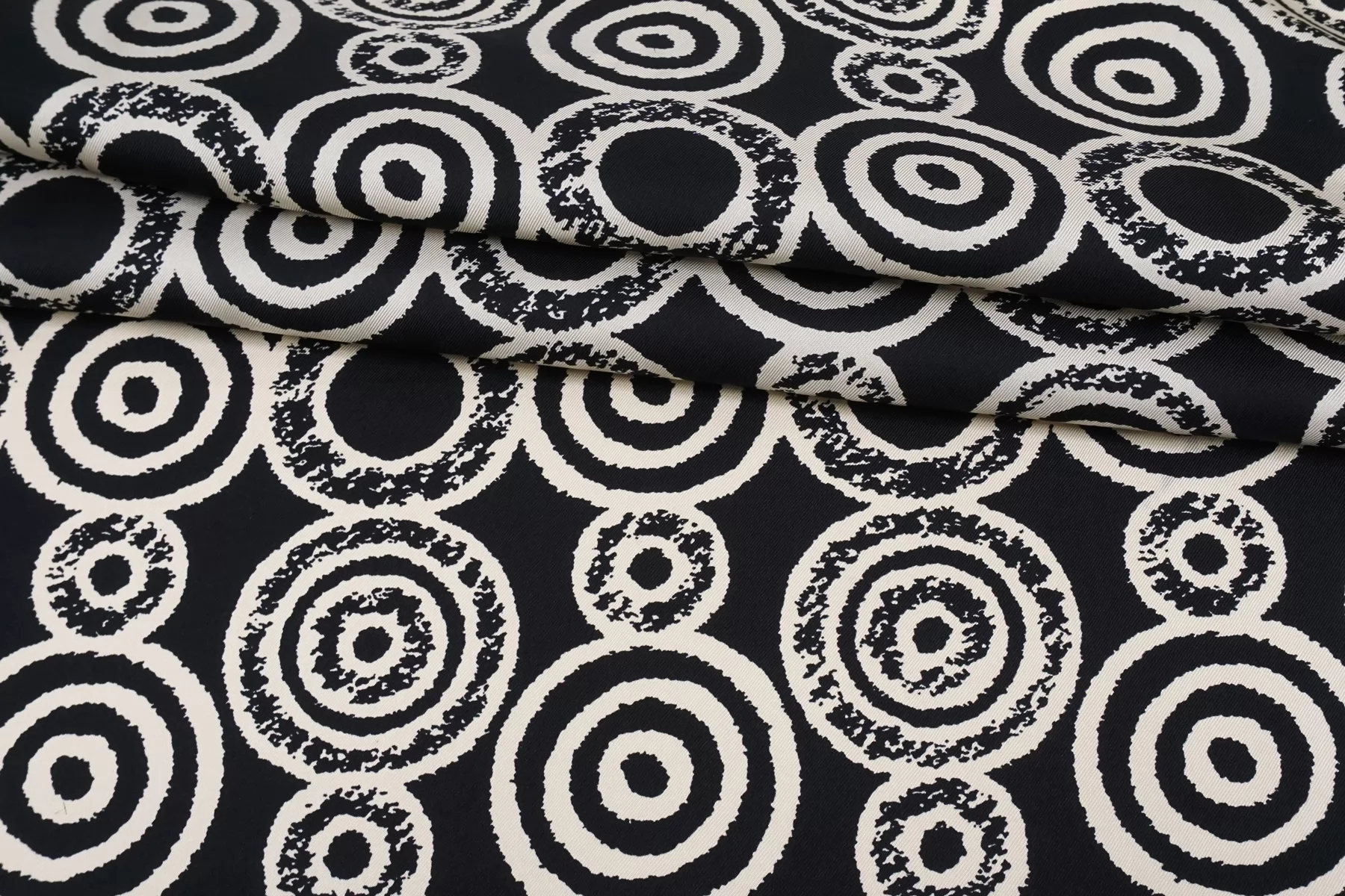 Классный твиловый шёлк от MAX MARA с принтом в виде орнаментальных кругов, цвета черный и очень светлый бежевый. Тактильно очень приятный, очень мягкий, гладкий. Тонкий, но плотный по плетению. Мнется совсем немного и слегка просвечивает силуэт на просвет. Красиво держит округлую складку. Легкий, летящий. Шьем платья, юбки, блузки и одежду в бельевом стиле. Рекомендуется деликатный уход, как за любым шелком.