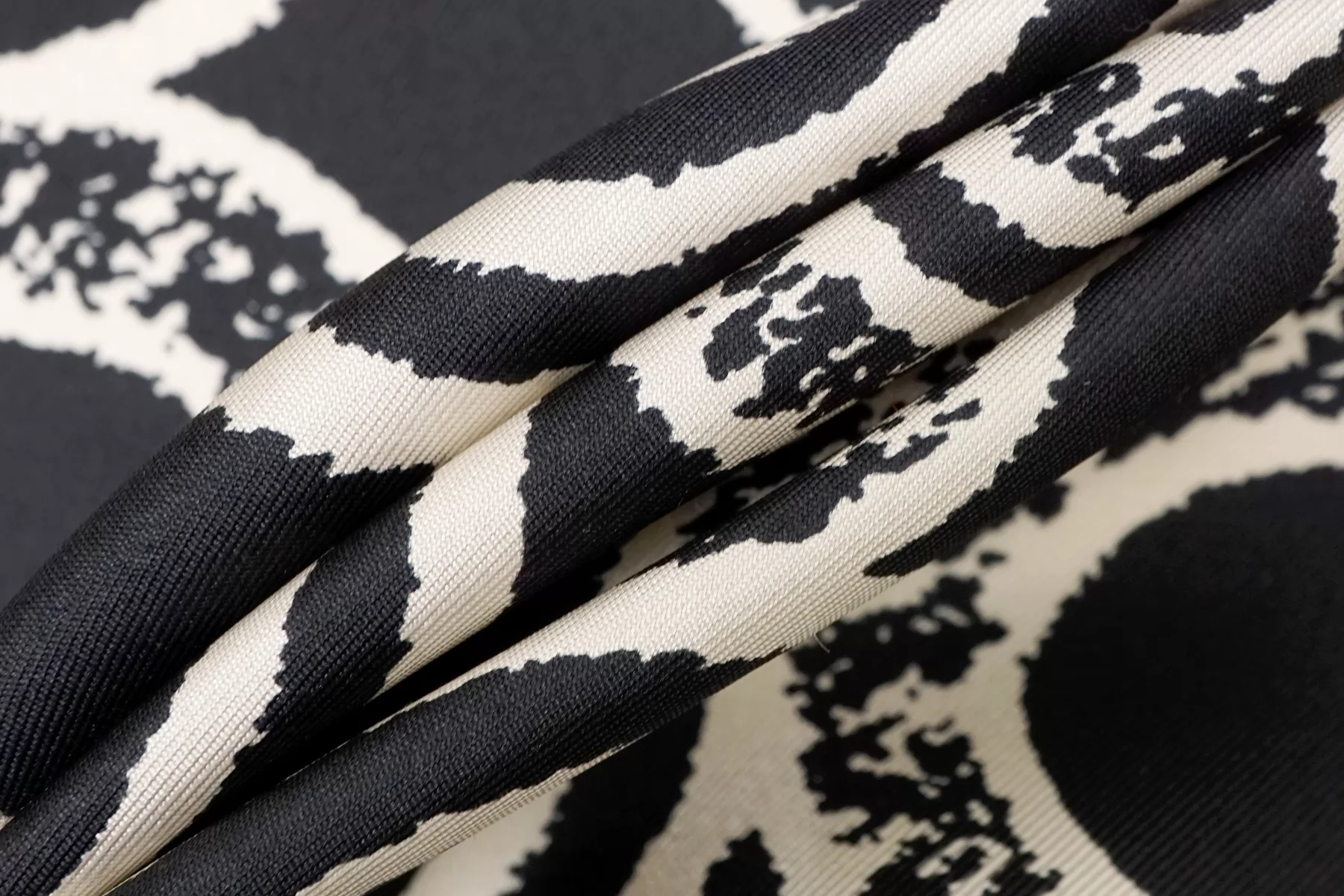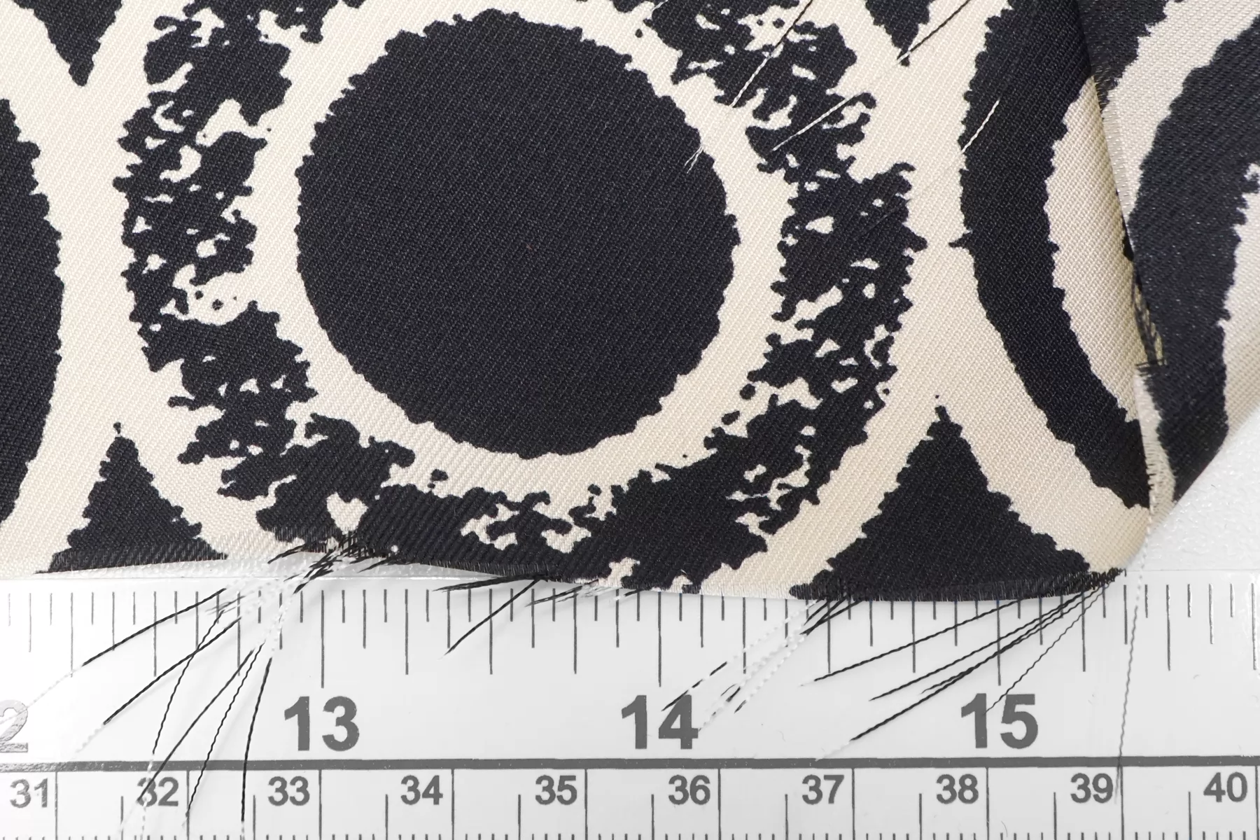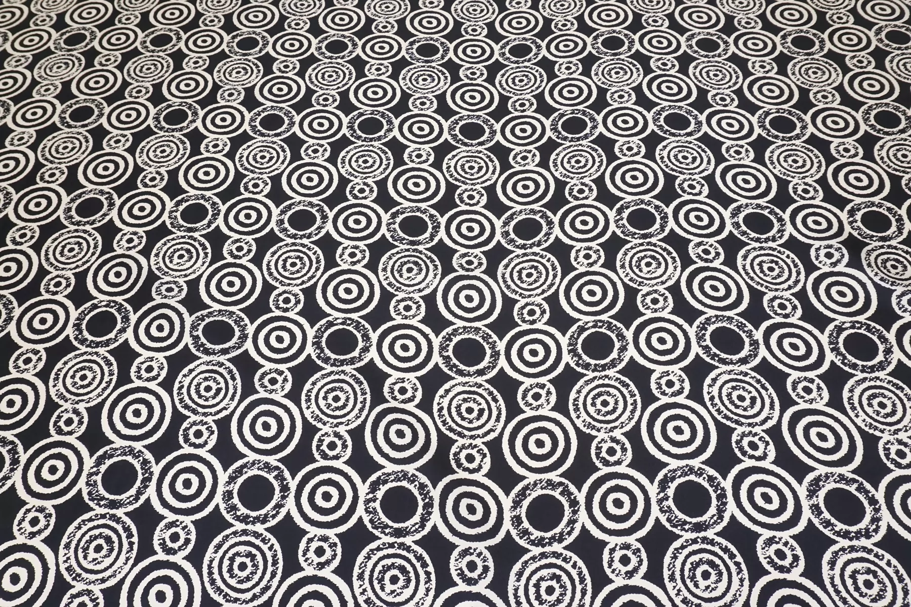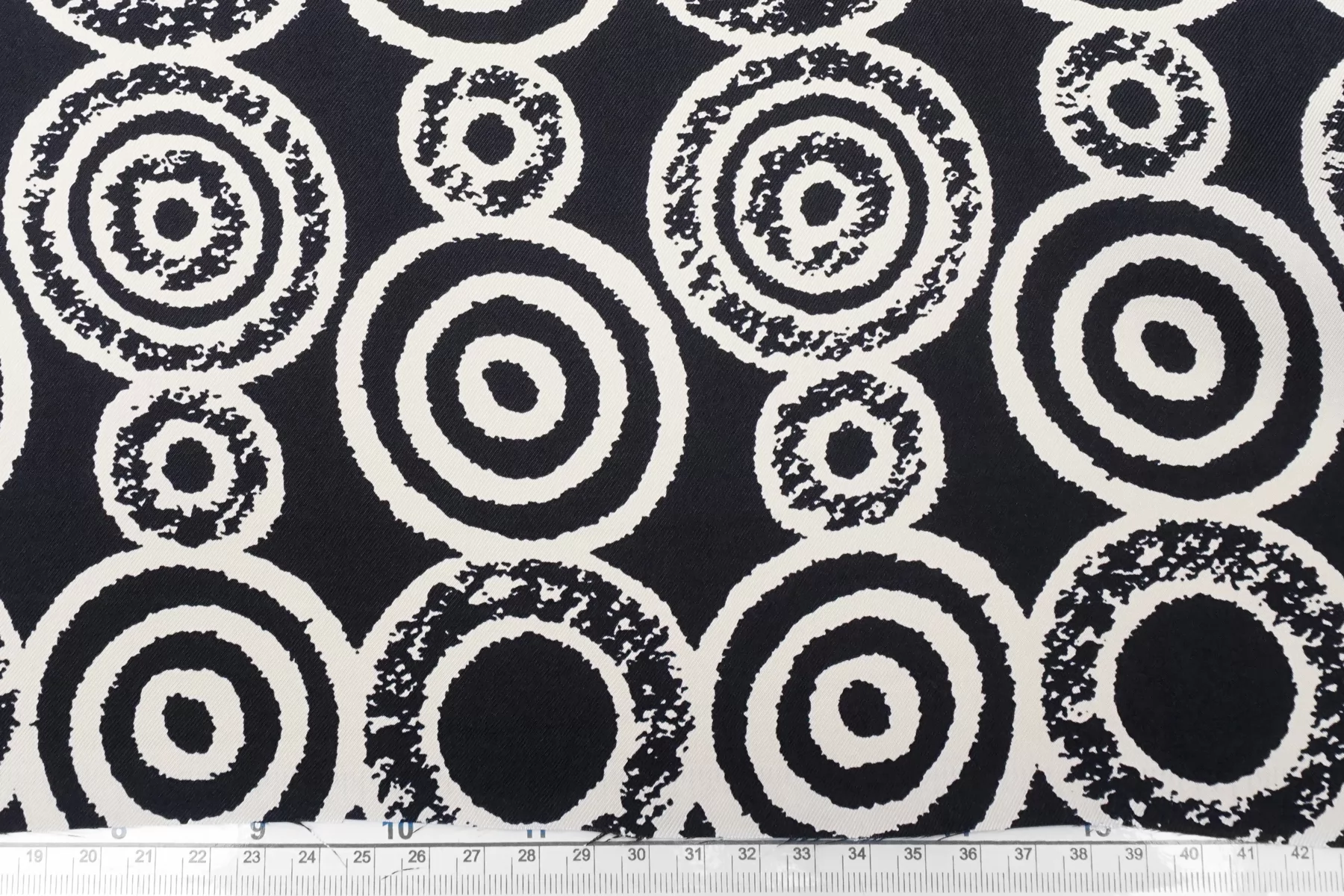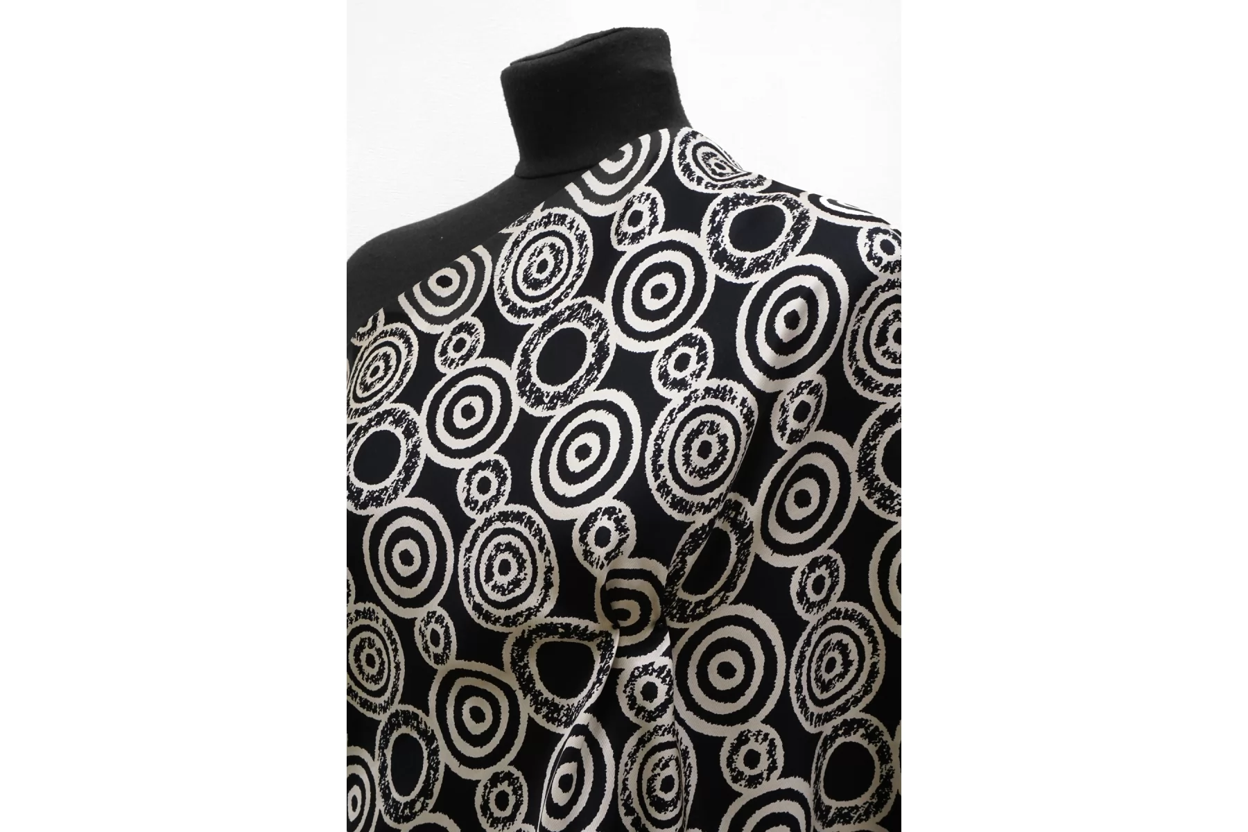 Классный твиловый шёлк от MAX MARA с принтом в виде орнаментальных кругов, цвета черный и очень светлый бежевый. Тактильно очень приятный, очень мягкий, гладкий. Тонкий, но плотный по плетению. Мнется совсем немного и слегка просвечивает силуэт на просвет. Красиво держит округлую складку. Легкий, летящий. Шьем платья, юбки, блузки и одежду в бельевом стиле. Рекомендуется деликатный уход, как за любым шелком.