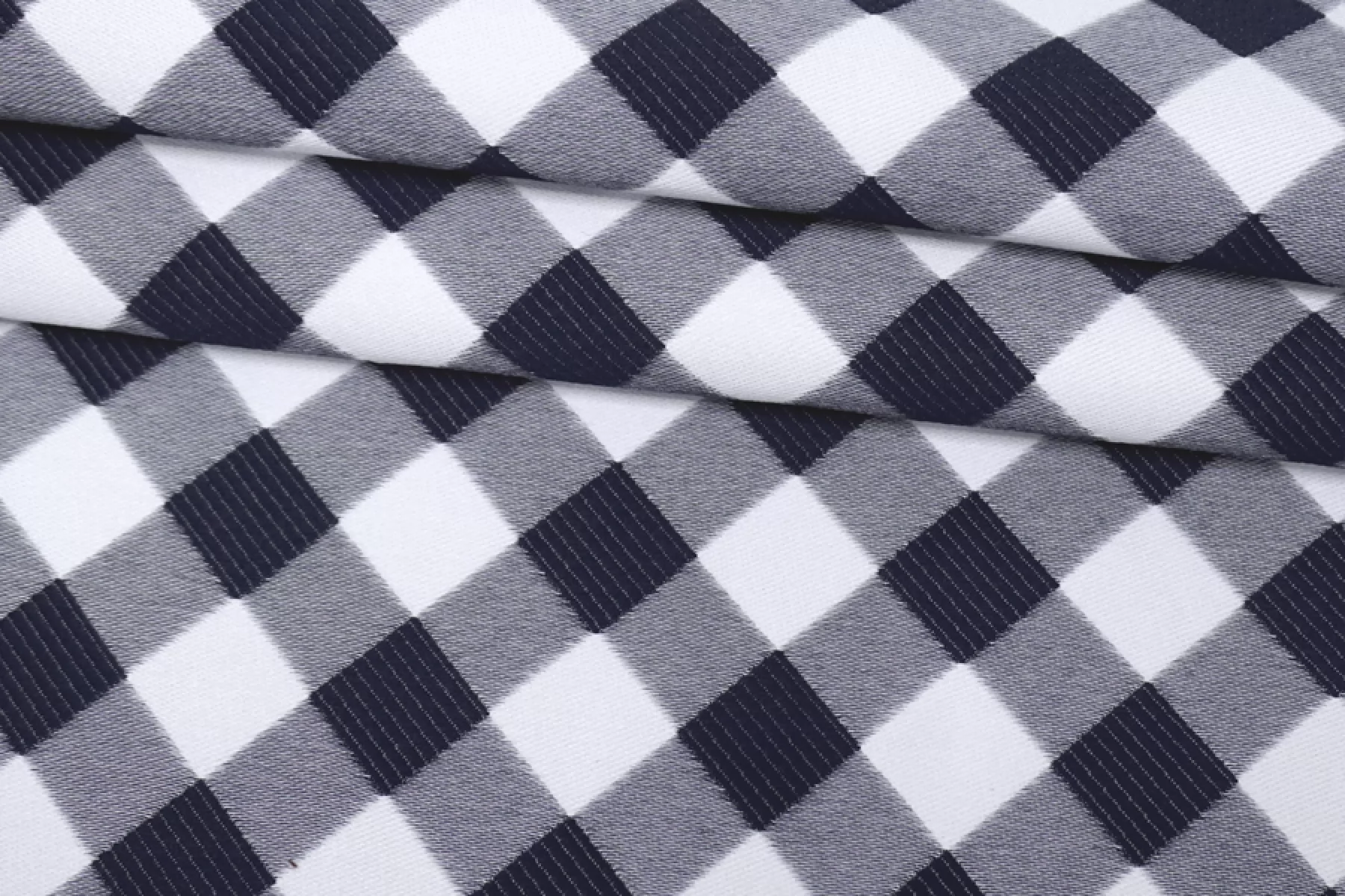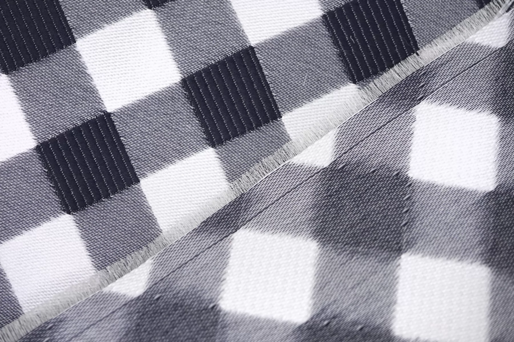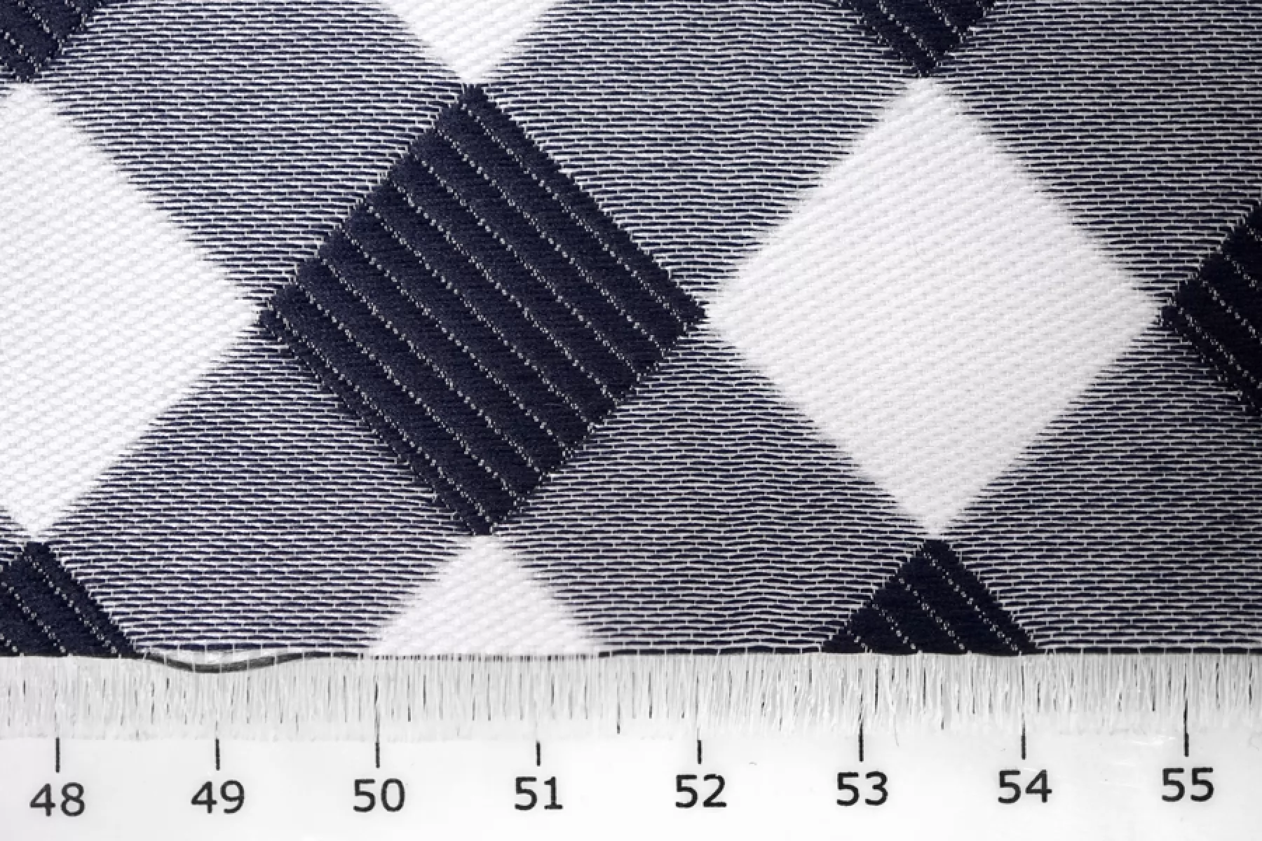 Шелковый костюмный жаккард THOM BROWNE в оттенках серого и синего в ромбовидную клетку среднего размера. Материал плотный, непрозрачный. Тактильно гладкий, формодержащий. Чувствуется шелк. Немного мнется. Обладает приятным лоском. Не тянется. Отлично подойдет на жакеты, костюмные варианты, юбки и другое. Уход за материалом деликатный, как и за любым шелком.