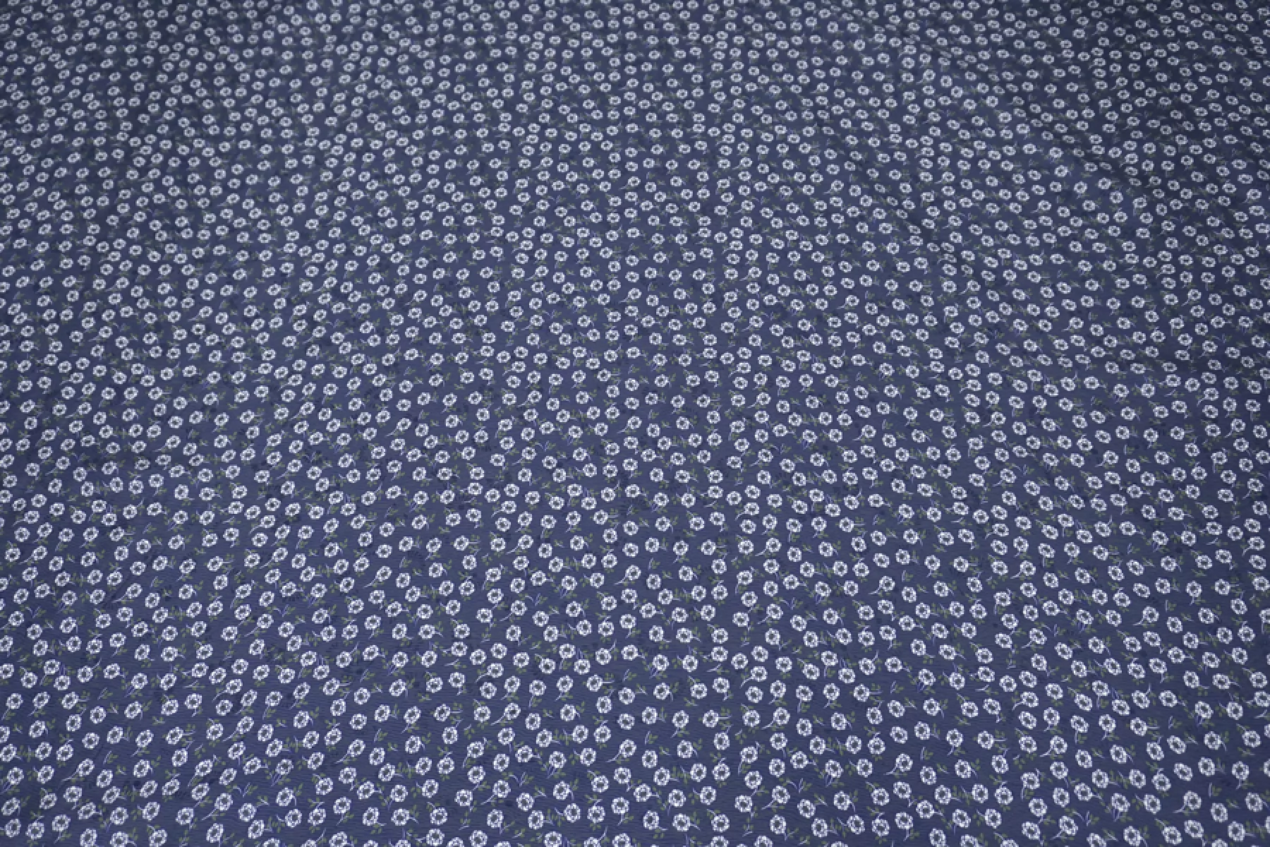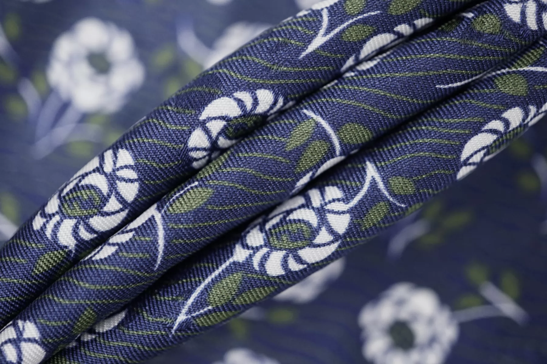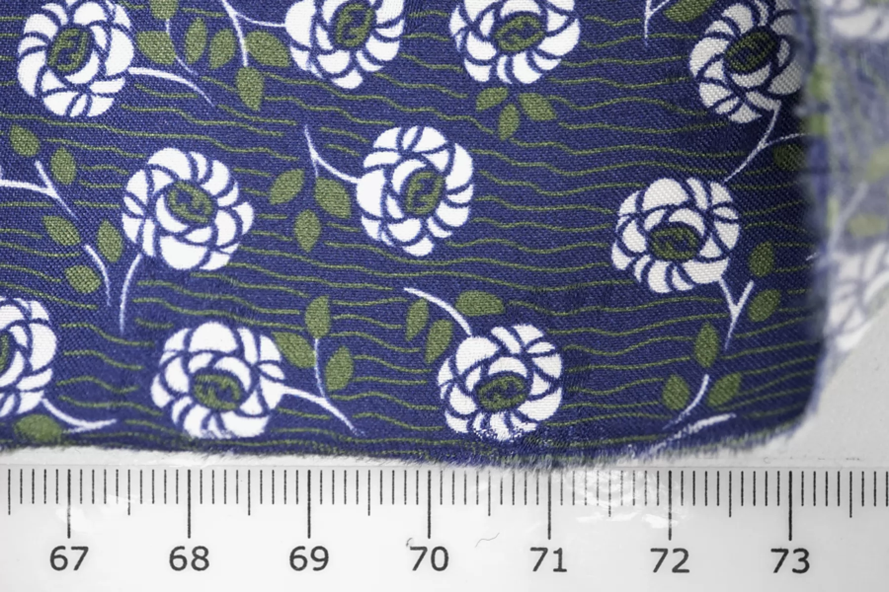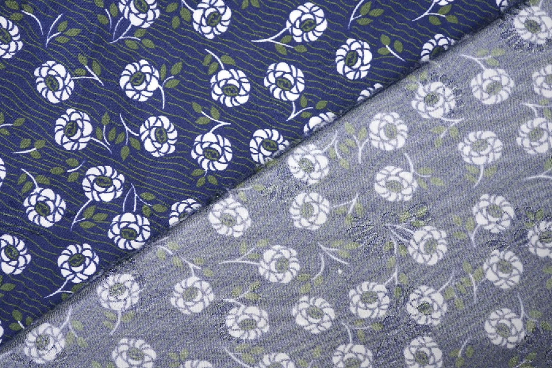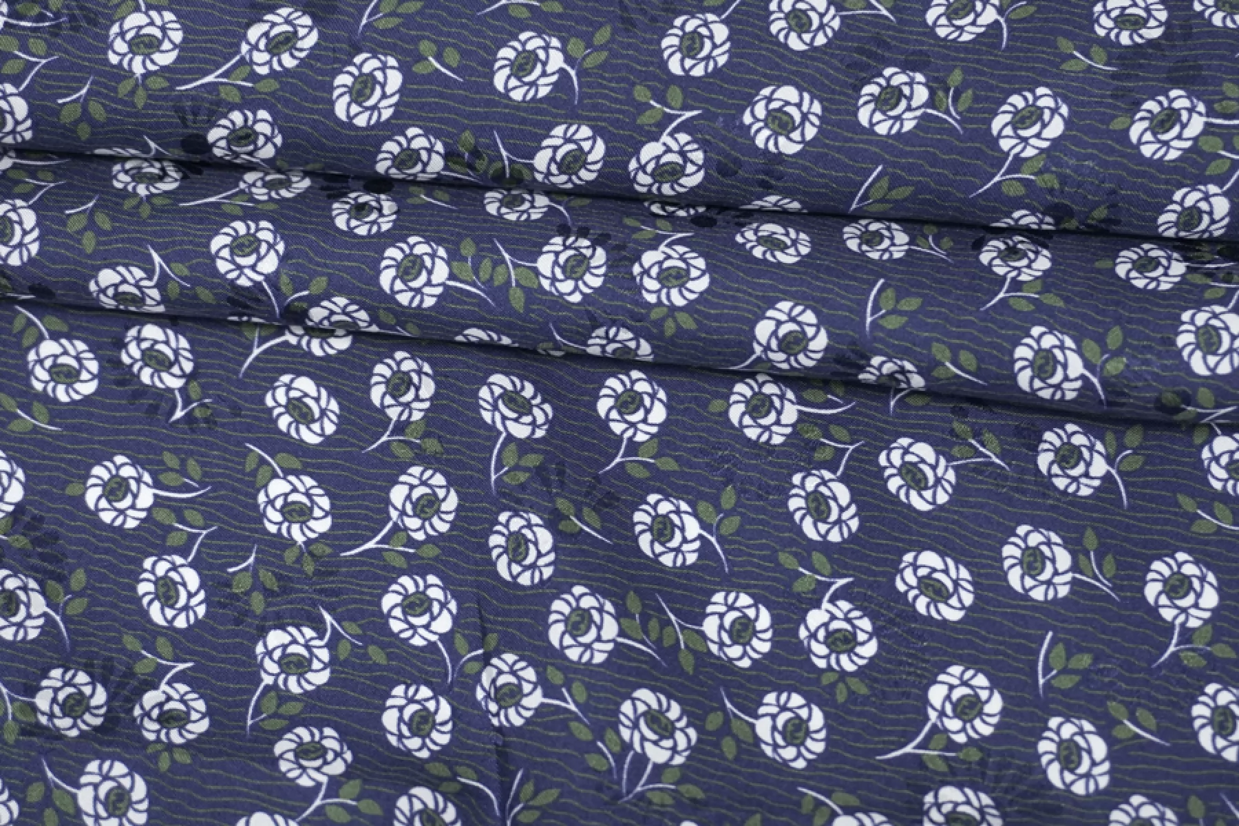 Тактильно очень мягкий и приятный, тонкий и летящий, струящийся шелковый тонкий атлас с некрупной жаккардовой выработкой цветов по полотну от FENDI. Сам материал приглушенного темно-синего оттенка в мелкий цветочек и полосочки белого и оливкового оттенков. Не прозрачный, но прослеживается слабый силуэт на просвет. Пластичный, не тянется. Немного мнется. Обладает шелковым блеском. Прекрасно подойдет на платье, блузку, тунику, юбку и одежду в бельевом стиле. Уход за материалом деликатный.