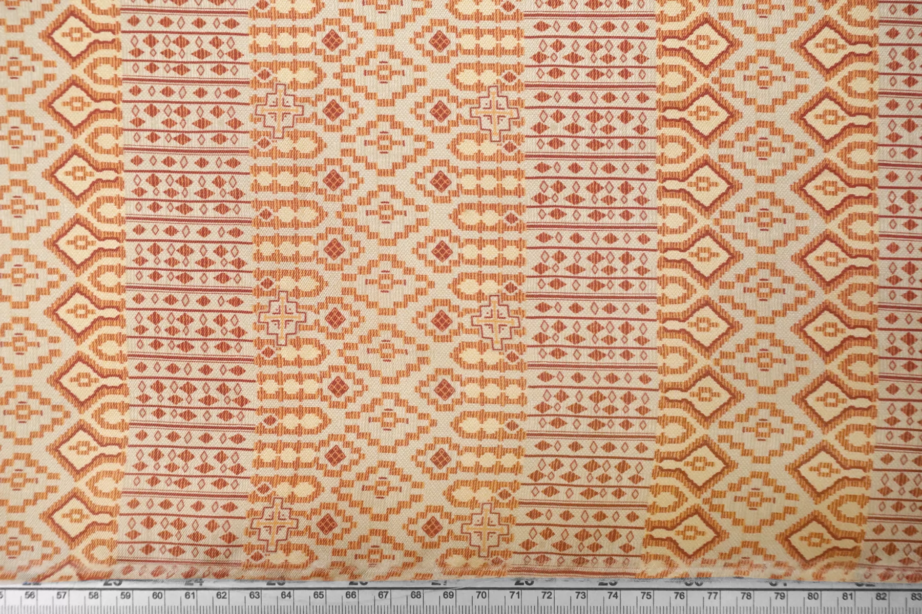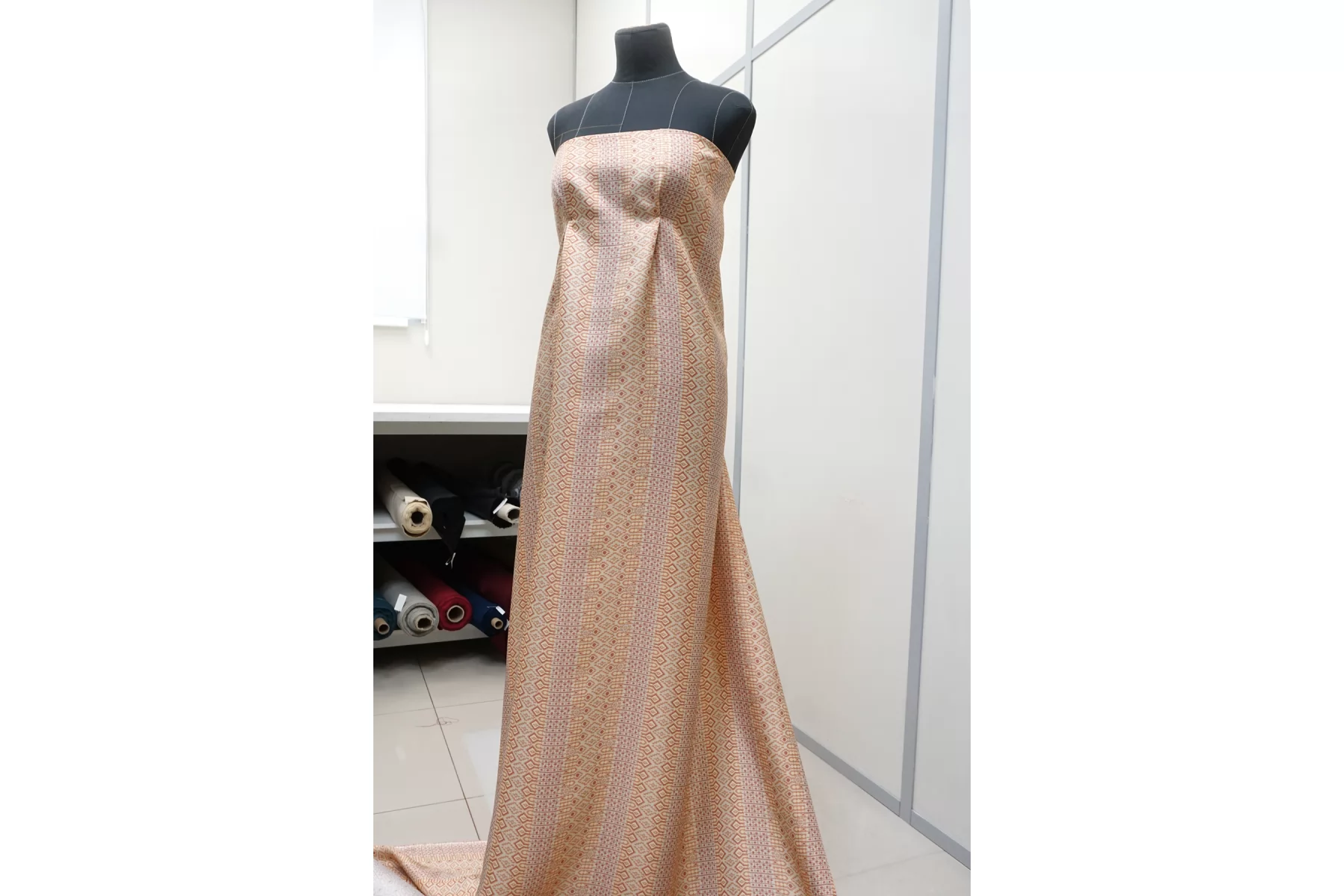 Твиловый шёлк от Forte Forte со стильным орнаментальным принтом на светло-бежевом фоне. Оттенки принта: желтый, оранжевый, ягодный. Очень приятный и мягкий, гладкий. Достаточно плотный, пластичный, струящийся, легкий. Обладает красивым шелковым лоском. Не тянется. Минимально просвечивает силуэт если смотреть насквозь в один слой. Не мнется. Форму не держит, но красиво смотрится в драпировке. Прекрасный легкий вариант на блузки, платья и юбки. Уход за шёлком деликатный.