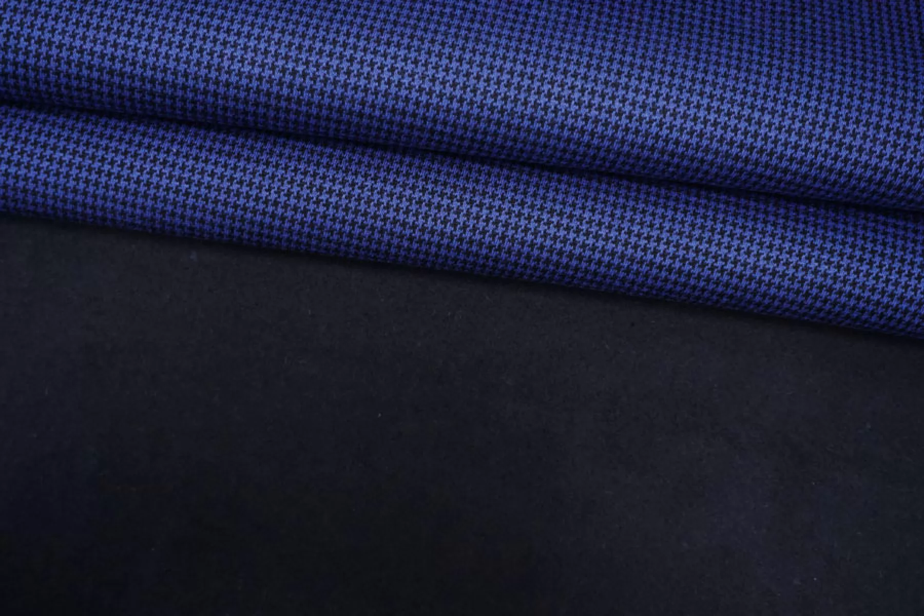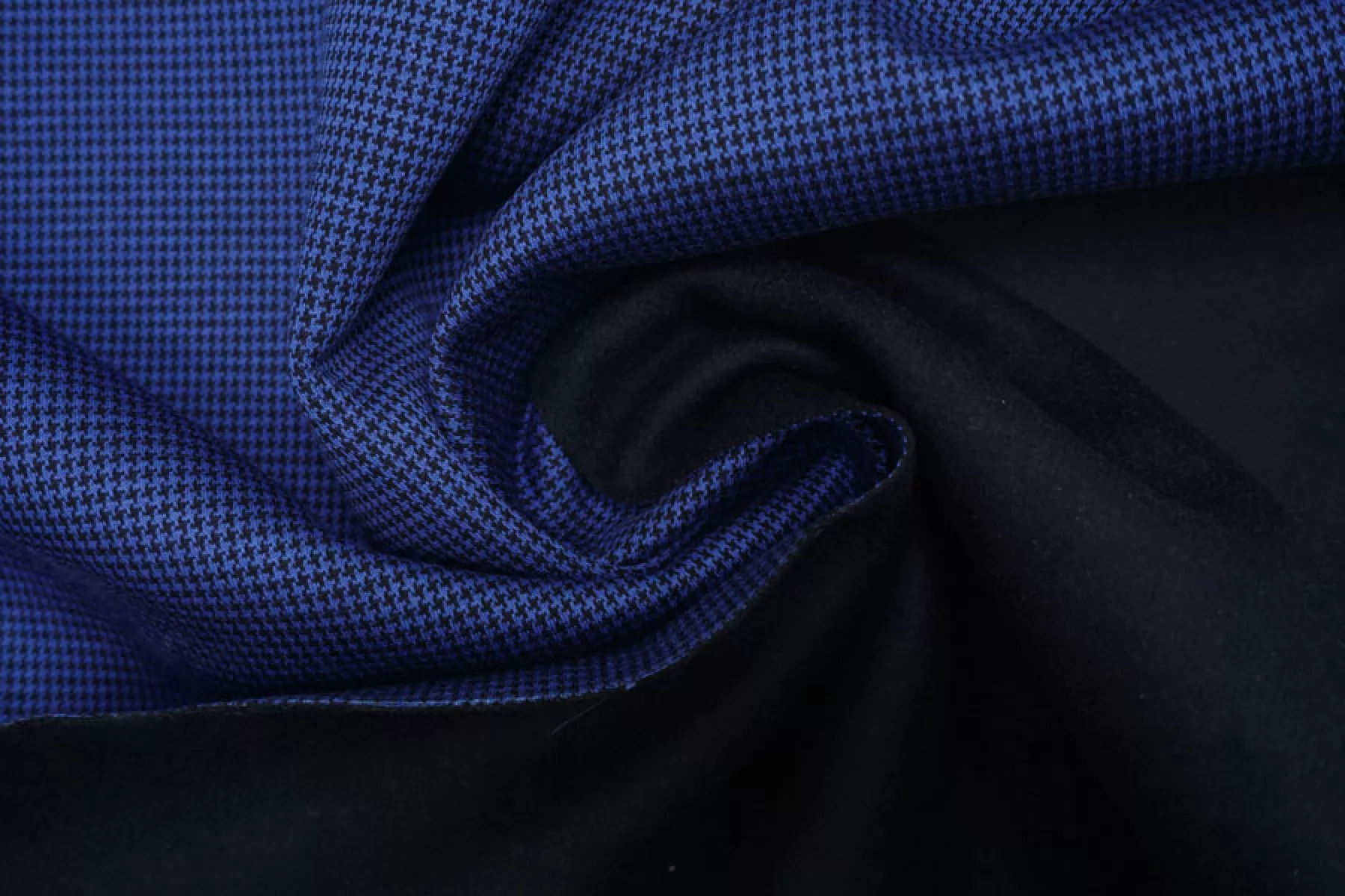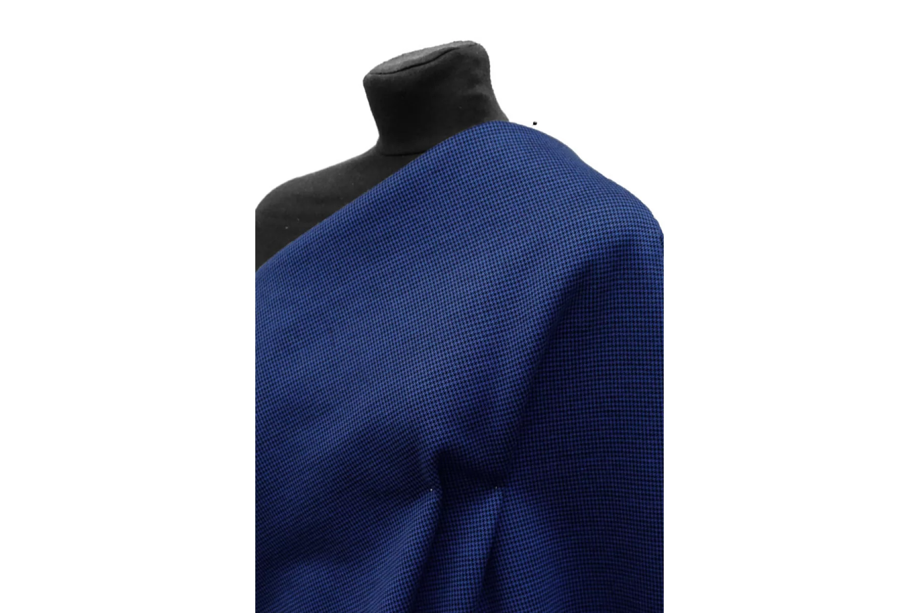 Костюмная шерсть дабл одна сторона синяя с мелким узором, другая однотонная темно-синяя. Слои разделяются, но немного деформируются. Работать можно на обе стороны. Материал мягкий, но немного суховатый наощупь. Немного покалывает. Форму держит. При этом довольно пластичный. Шьем рубашки, теплые жакеты и облегченные пальто. Уход - деликатный.
