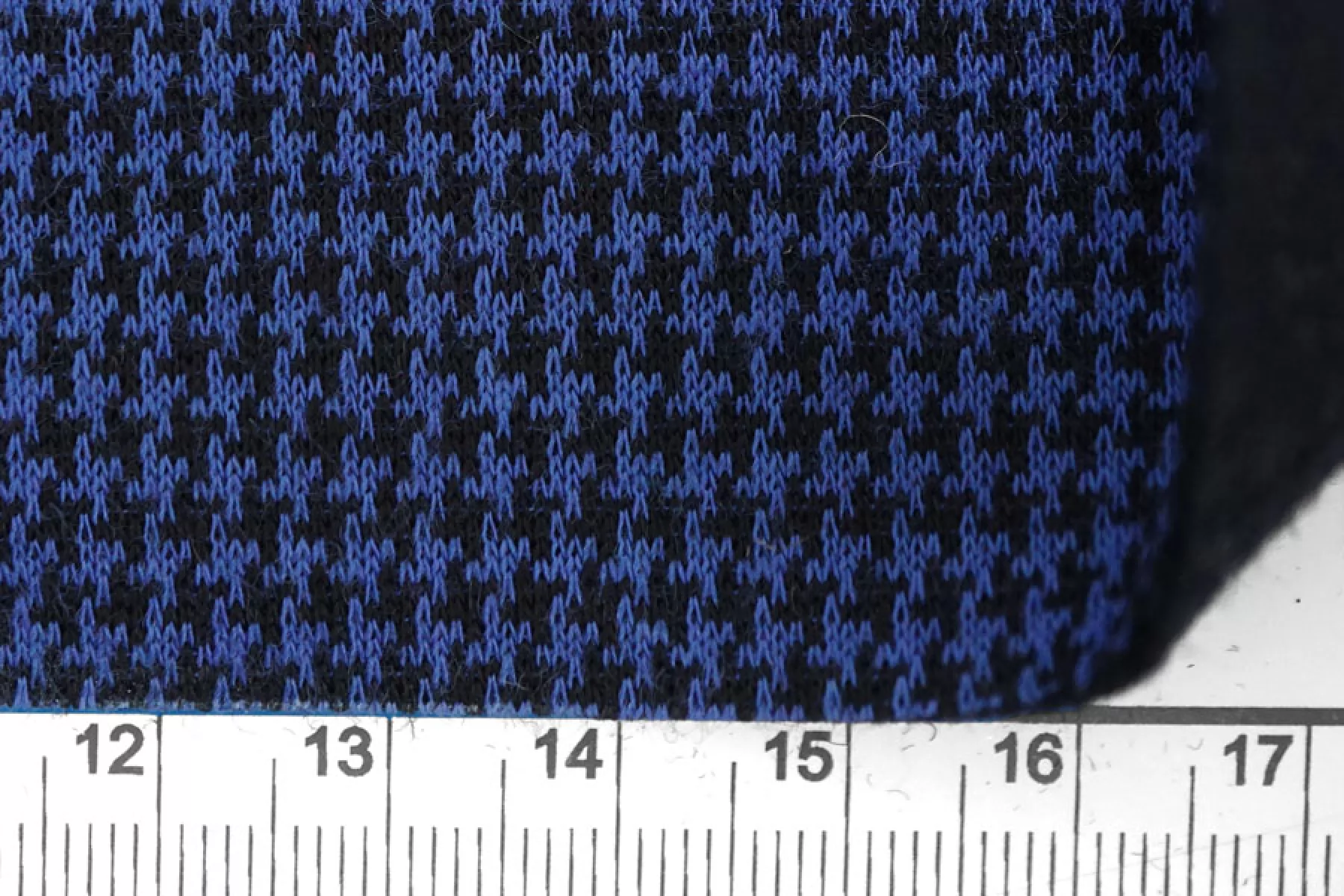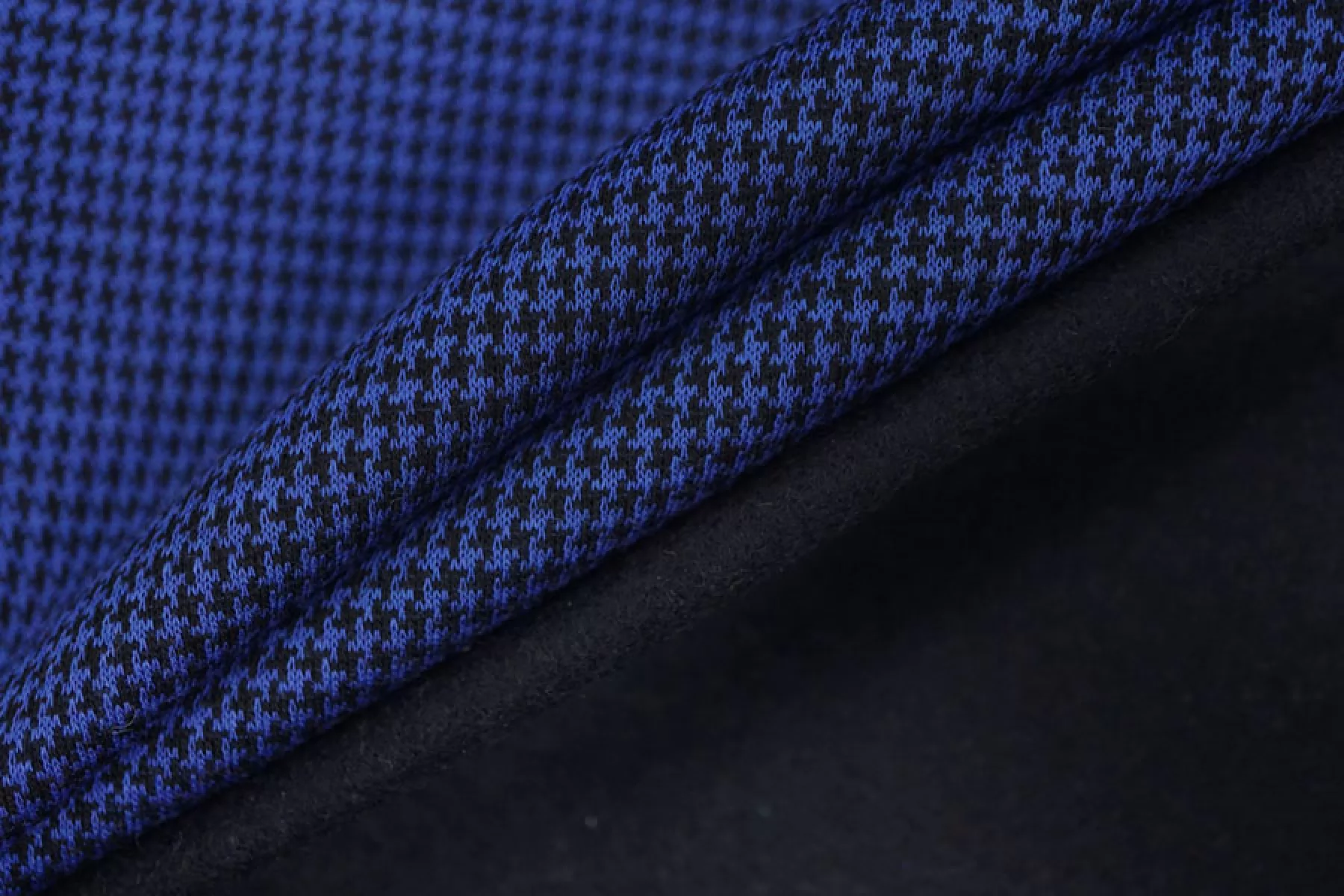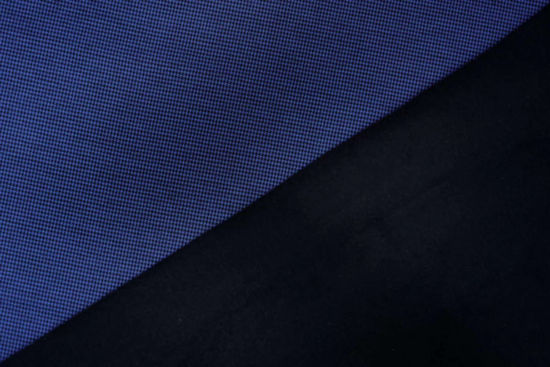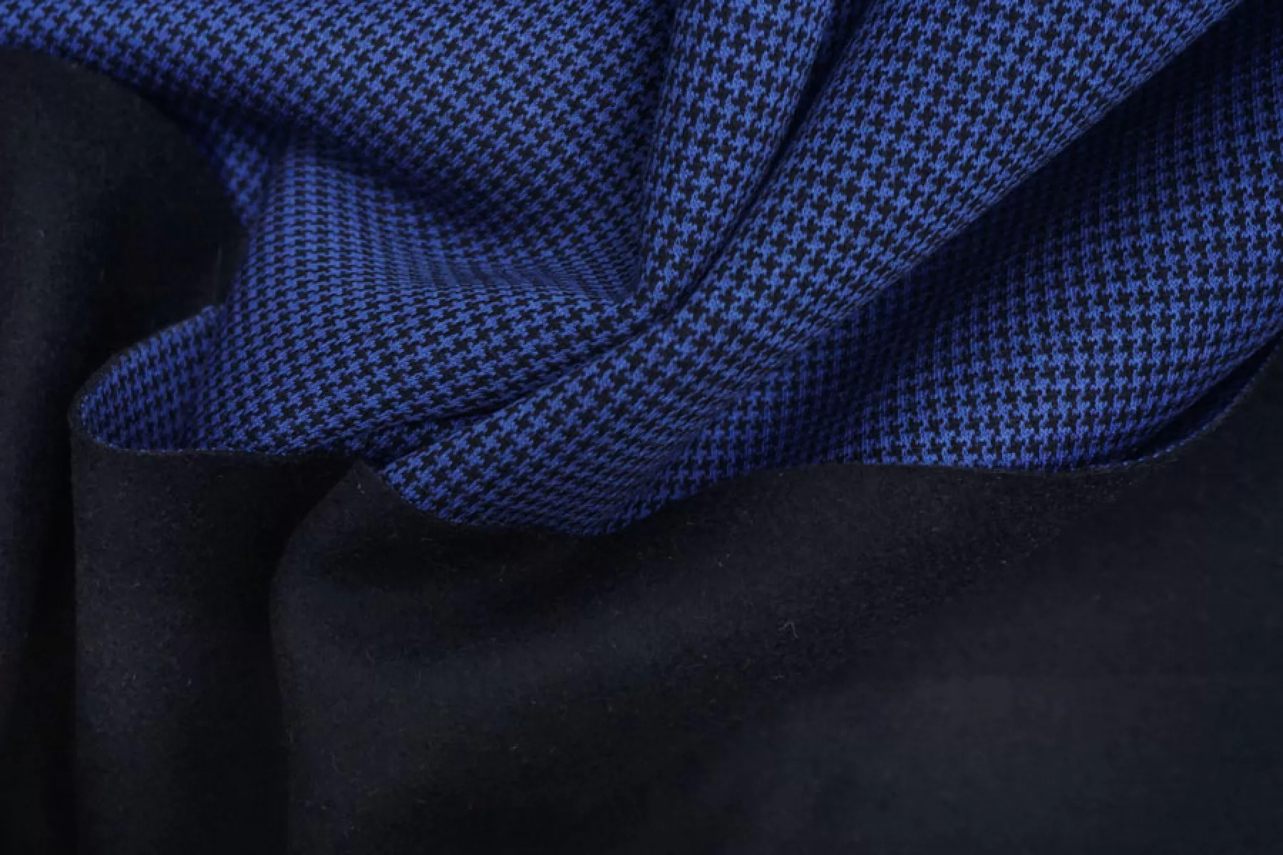 Костюмная шерсть дабл одна сторона синяя с мелким узором, другая однотонная темно-синяя. Слои разделяются, но немного деформируются. Работать можно на обе стороны. Материал мягкий, но немного суховатый наощупь. Немного покалывает. Форму держит. При этом довольно пластичный. Шьем рубашки, теплые жакеты и облегченные пальто. Уход - деликатный.