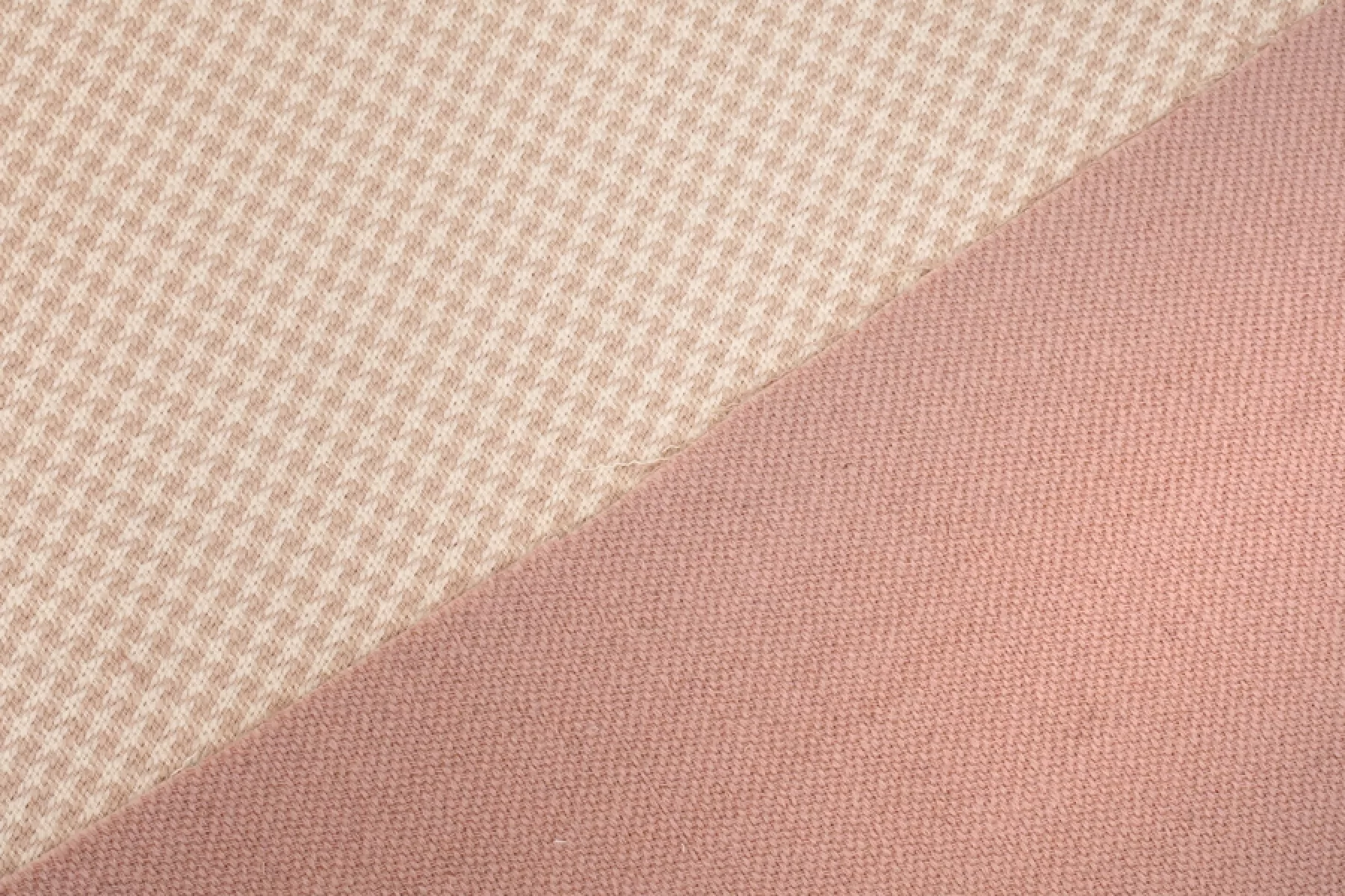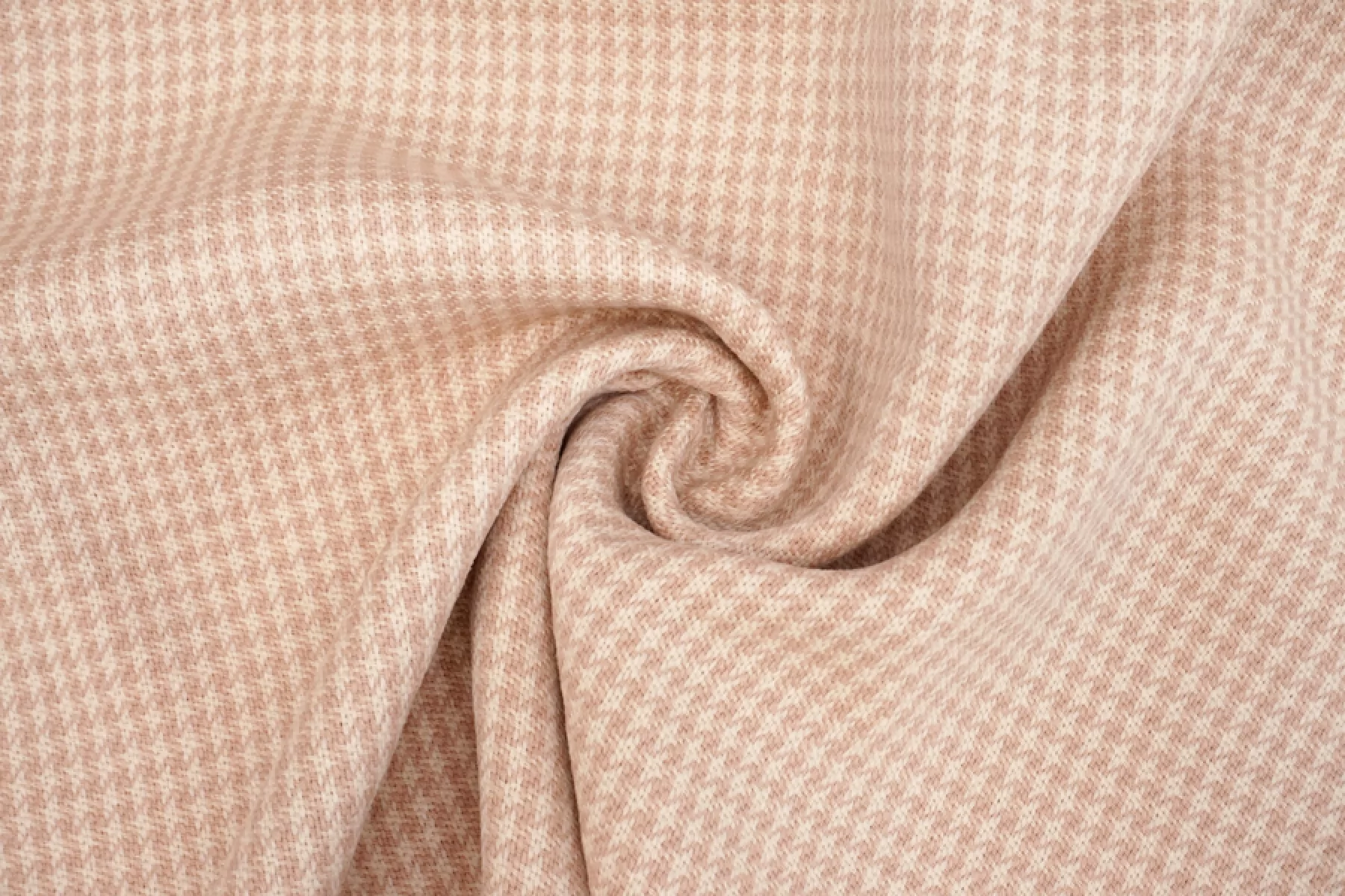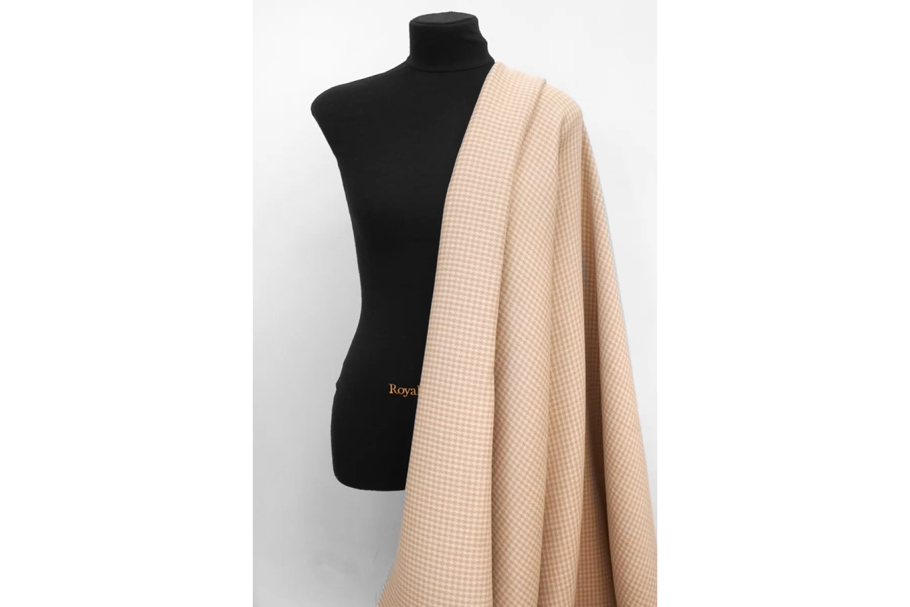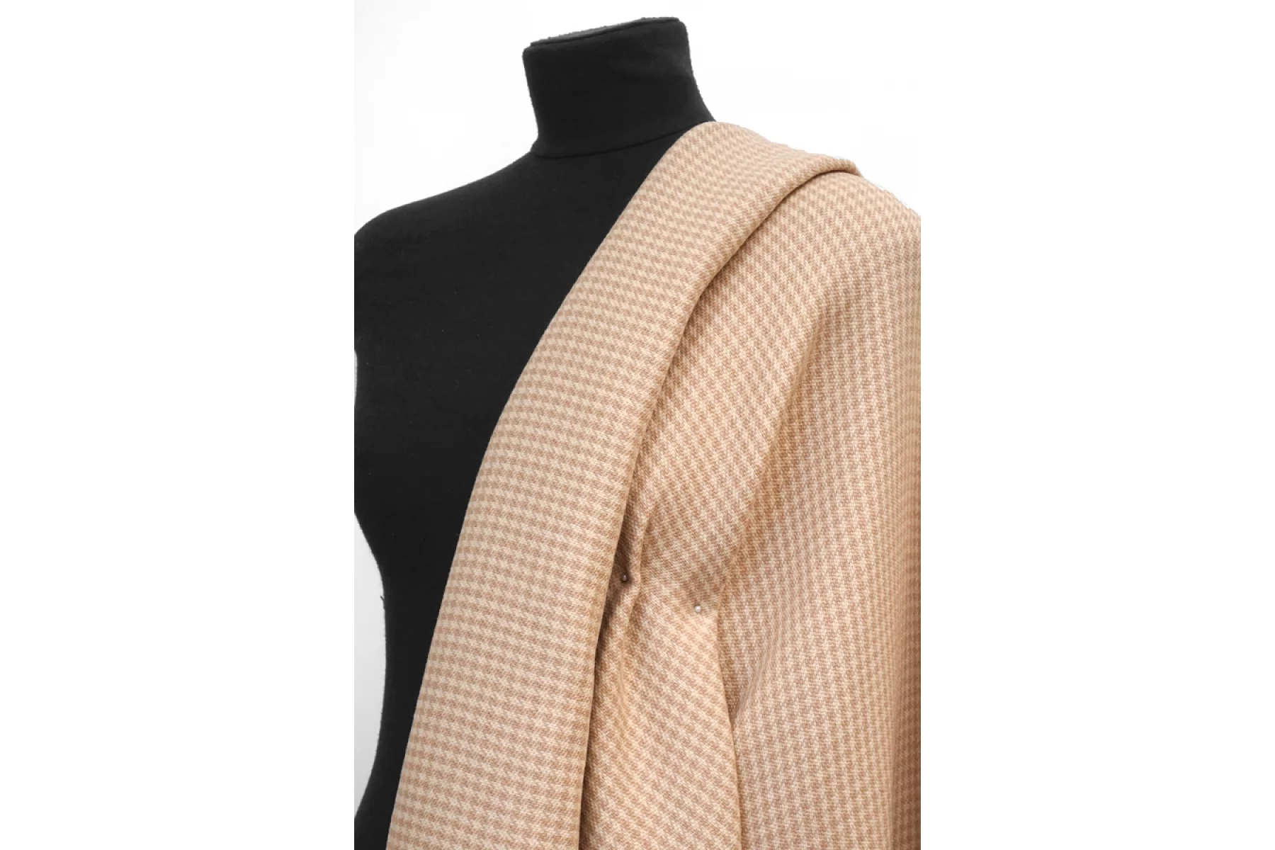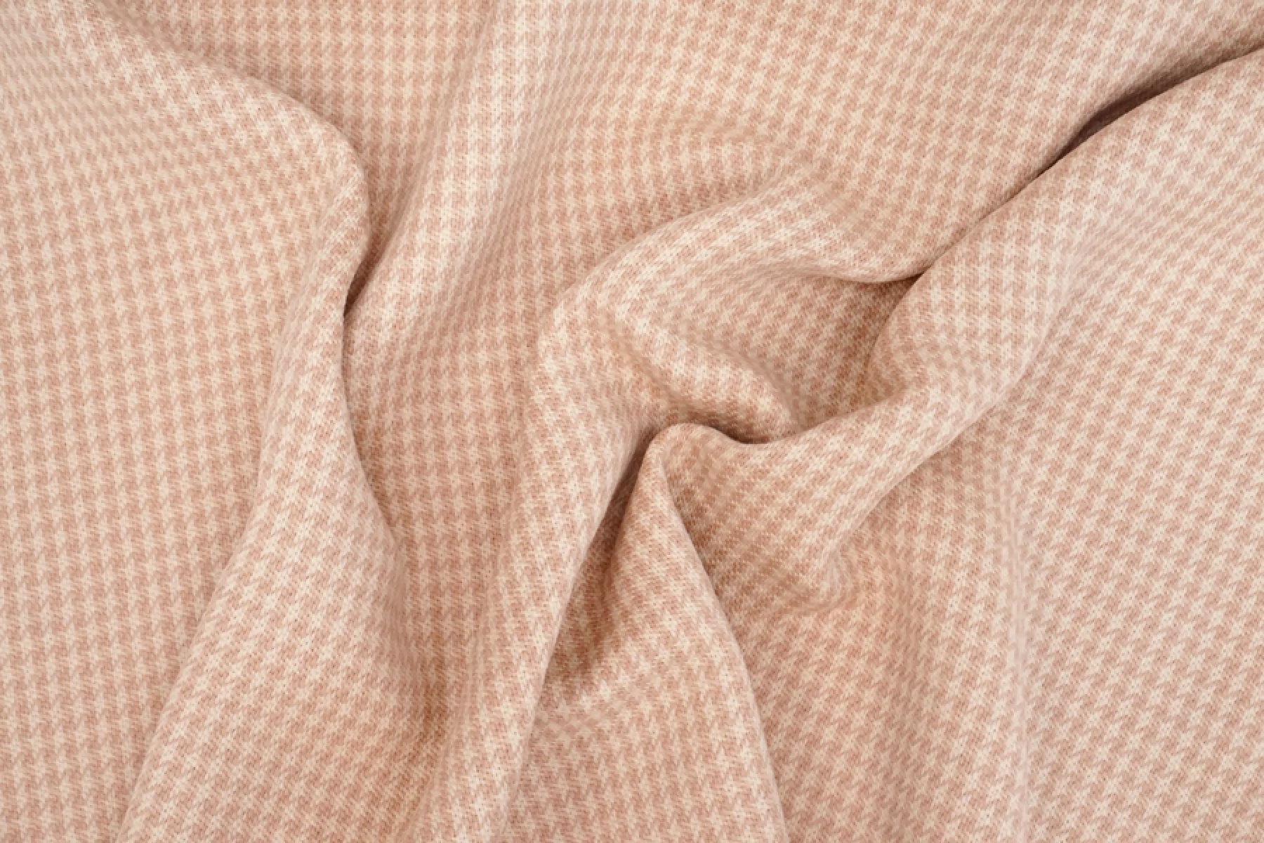 Классная позиция! Костюмно-пальтовая шерсть, состоящая из двух слоев. Один слой - пудровый, а другой (лицеовой) в гусиную лапку пудрового и сливочного цвета. Слои сшиты между собой и легко разделяются. Работать можно на обе стороны. Материал суховатый и шероховатый наощупь. Немного покалывает. Форму держит. При этом довольно пластичный. Шьем рубашки, теплые жакеты и облегченные пальто. Уход - деликатный.