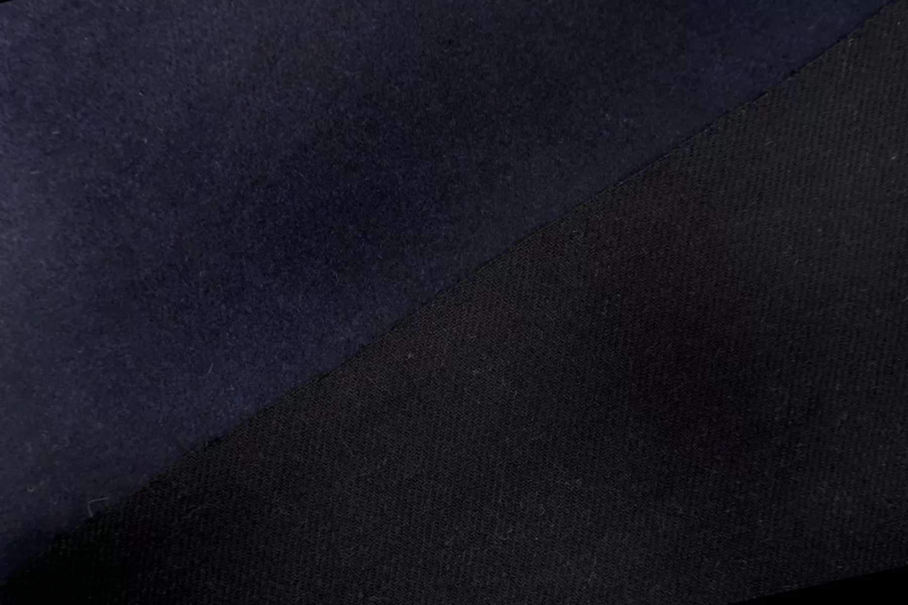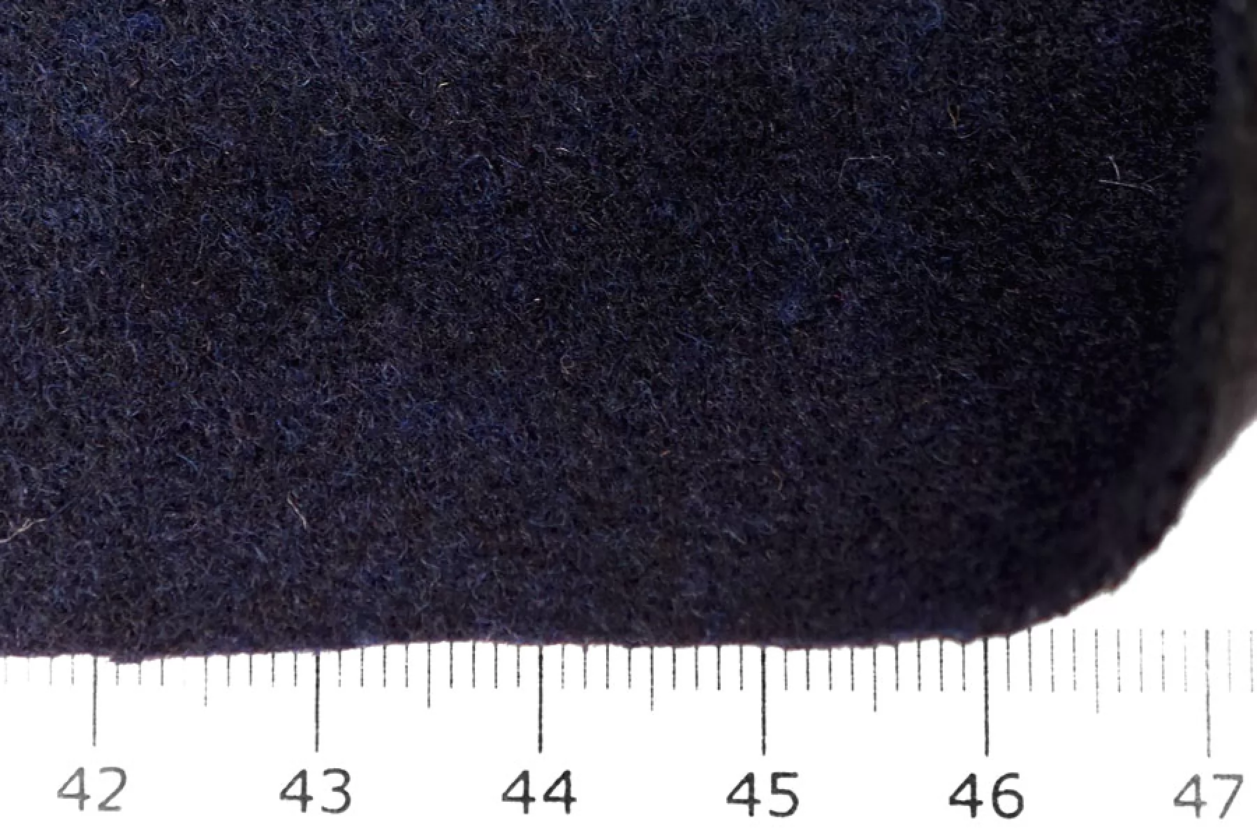 Прекрасная шерсть пальтово-костюмной плотности двусторонняя и двухслойная (слои легко разделяются) темно-синего цвета. Ворс короткий направленный. Материал очень мягкий и приятный наощупь. Примерно 1,5 мм толщиной. Совсем немного суховата наощупь, чуть-чуть колется. Не тянется. Форму держит. Не мнется. Пластичный, не просвечивает. Красиво драпируется. Отличный вариант на пальто. Уход деликатный.