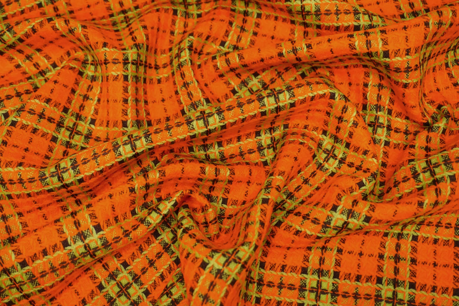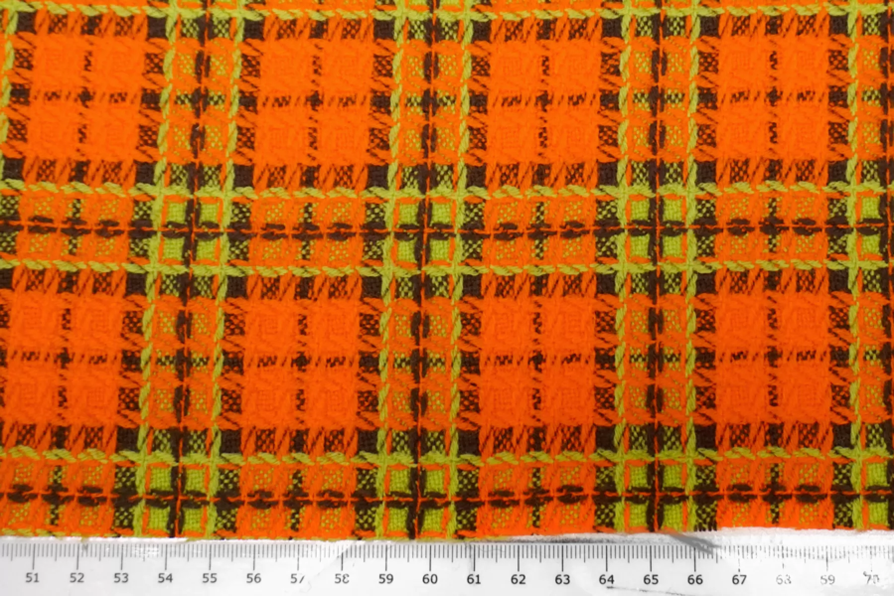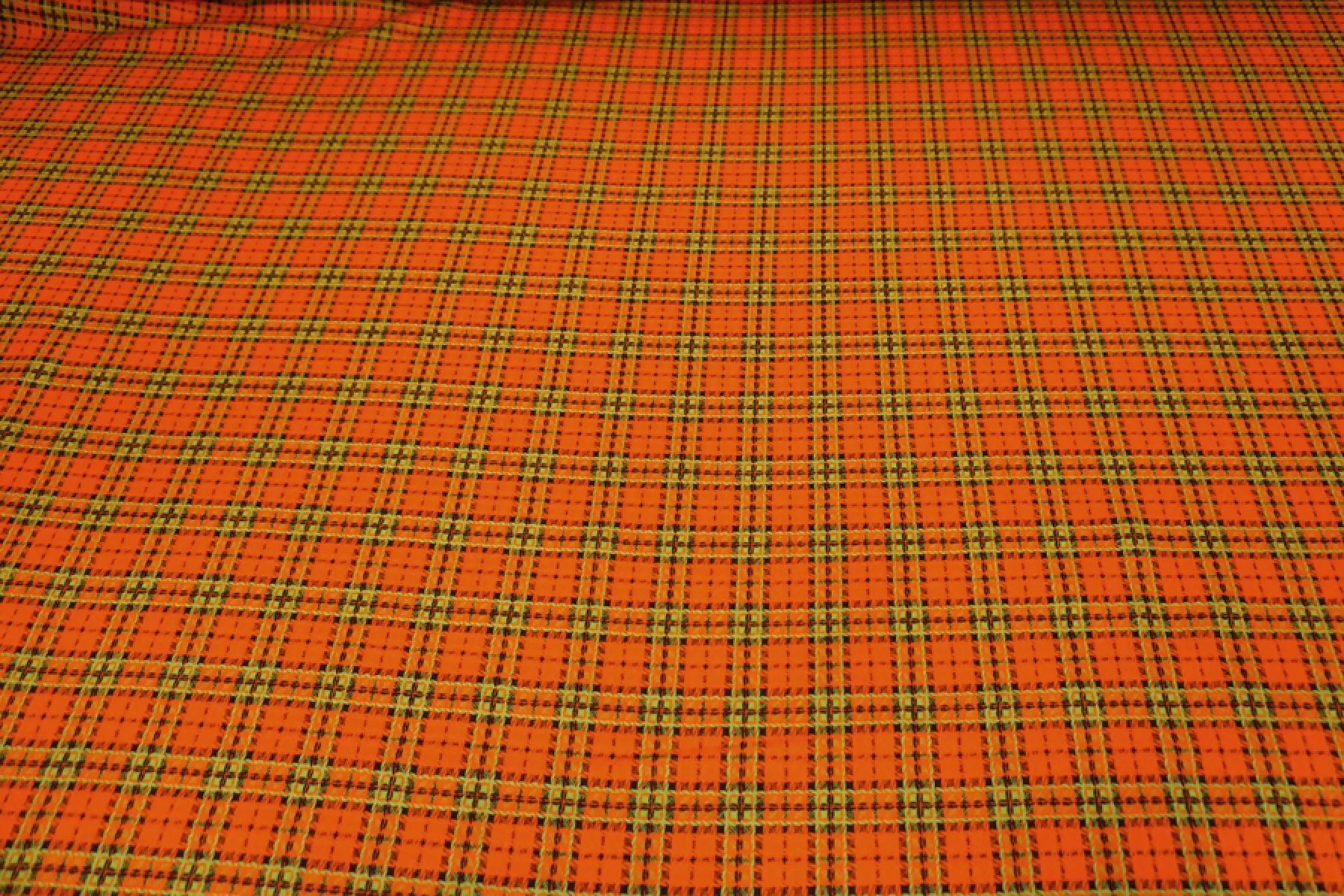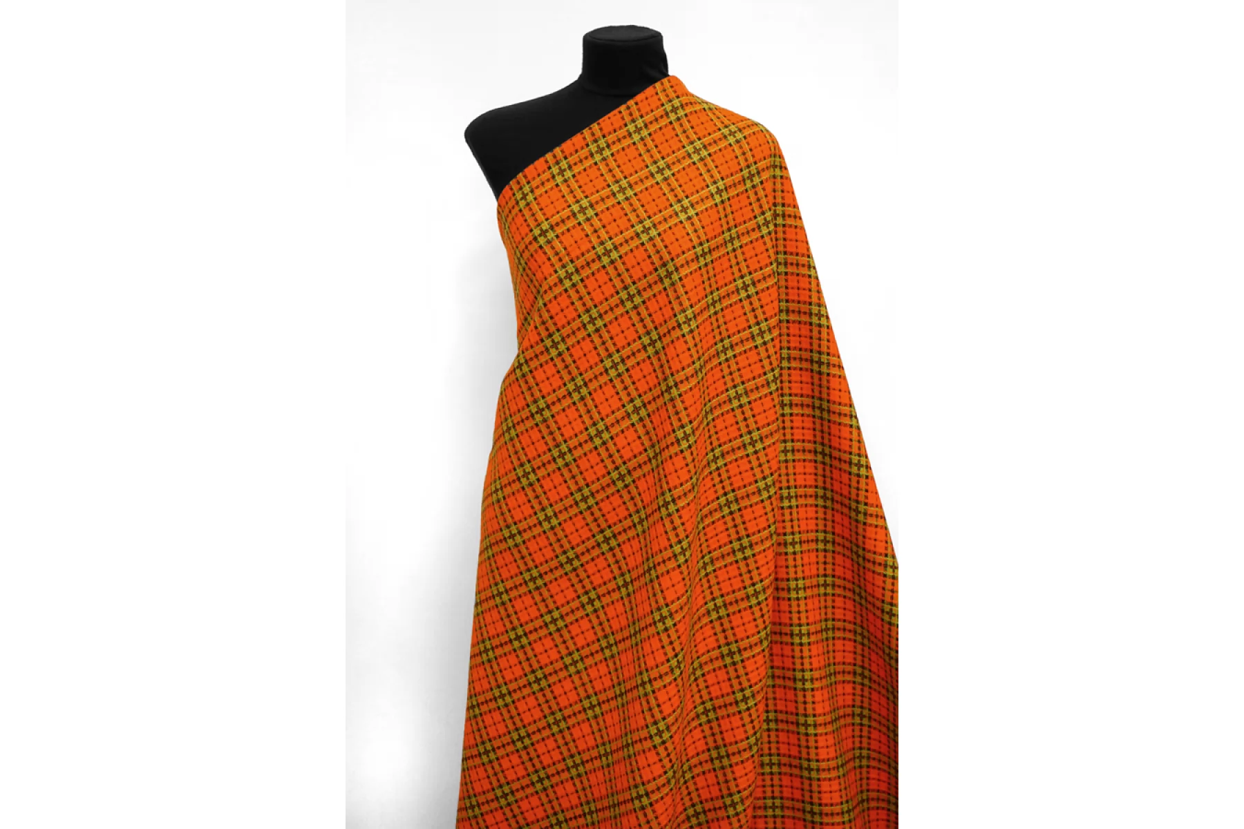 Шикарная костюмная шерсть в яркую оранжевую клетку. Суховатая и шероховатая, немного чувствуется фактура наощупь. С приятным лоском. Слегка колется. Не тянется. Пластичный. Не мнется. Не просвечивает. Форму не держит. Подойдет на костюмную группу. Уход деликатный.