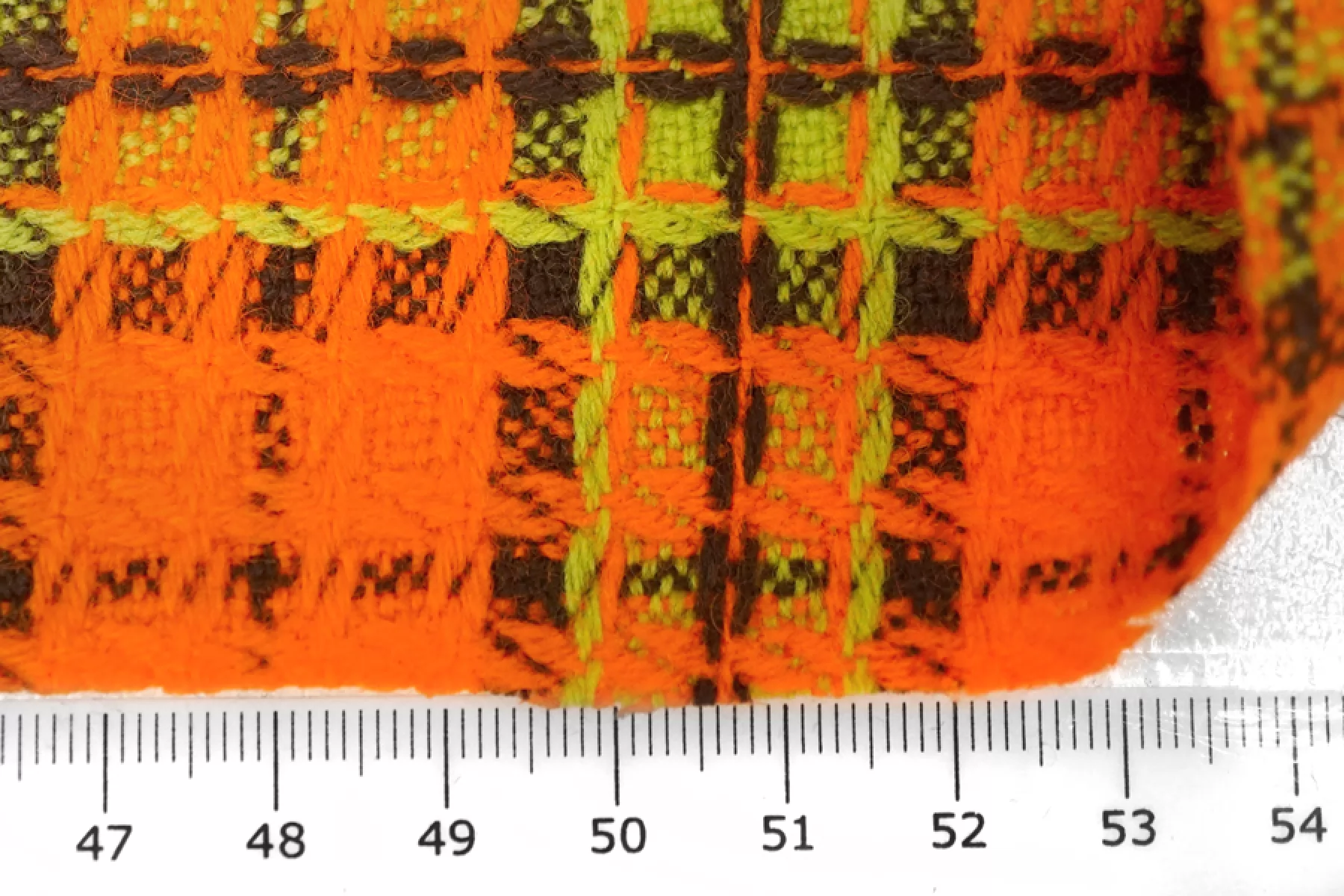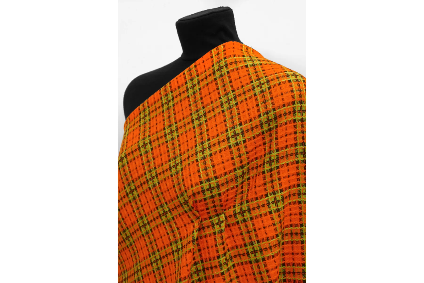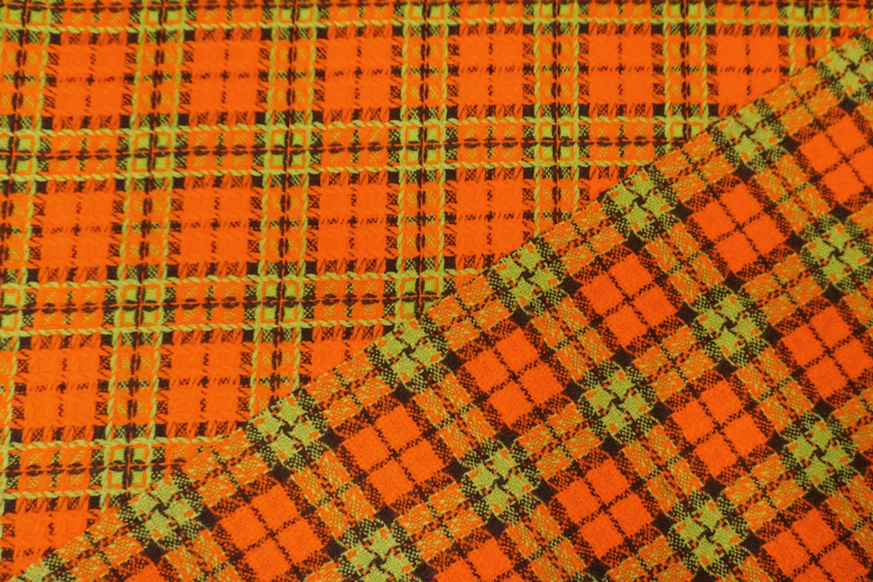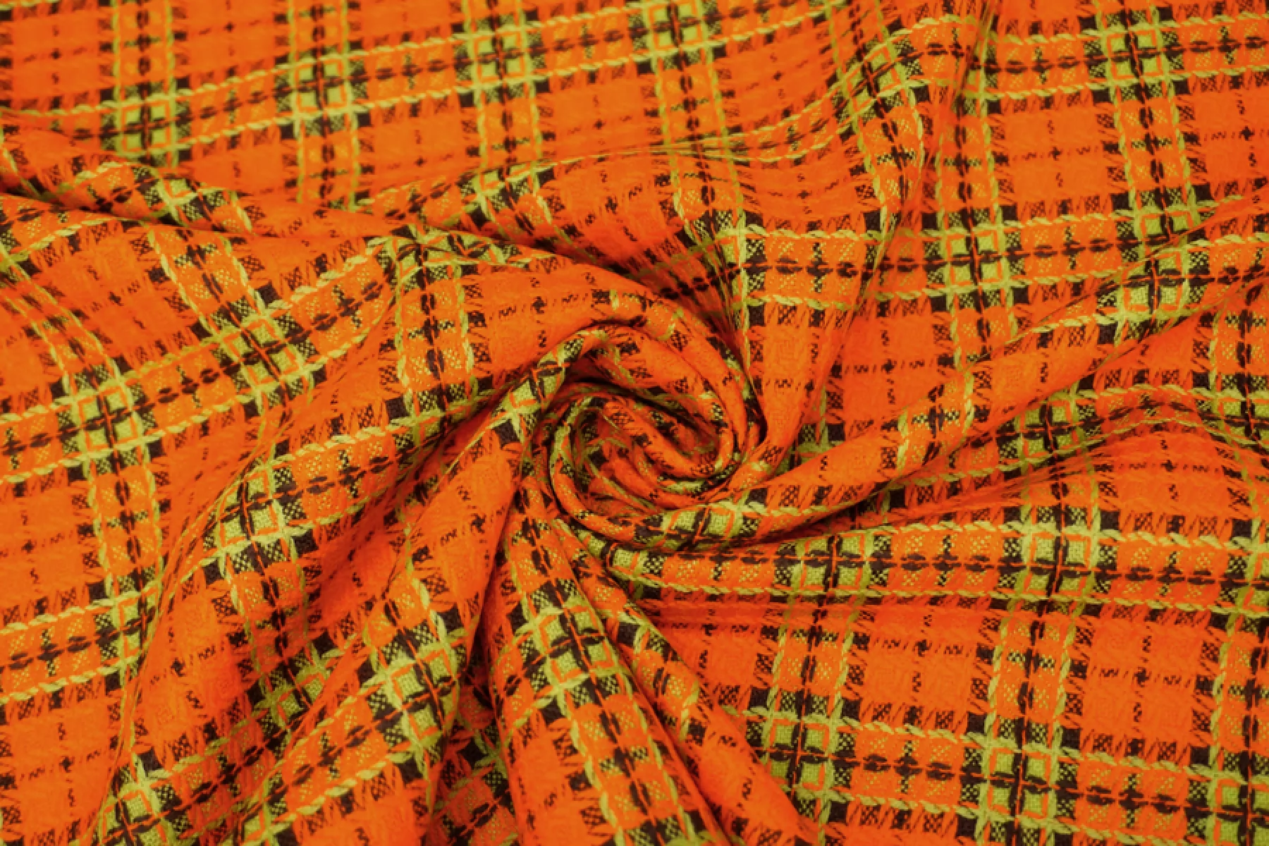 Шикарная костюмная шерсть в яркую оранжевую клетку. Суховатая и шероховатая, немного чувствуется фактура наощупь. С приятным лоском. Слегка колется. Не тянется. Пластичный. Не мнется. Не просвечивает. Форму не держит. Подойдет на костюмную группу. Уход деликатный.