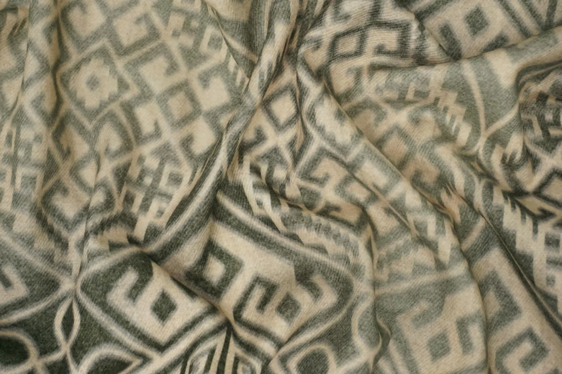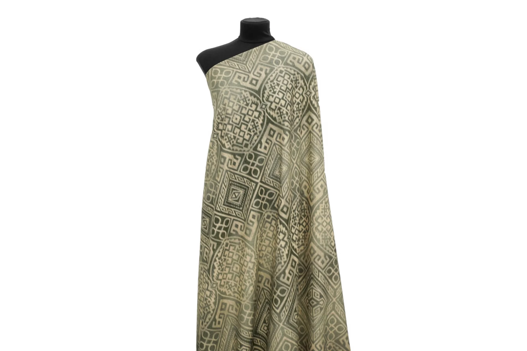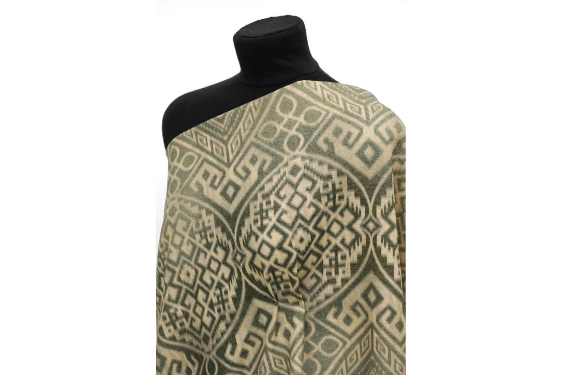 Прекрасная костюмно-плательная шерсть в от бренда ETRO бежево-зеленого оттенка с этническим орнаментом. Шерсть тактильно очень приятная, мягкая, с легким ворсом,не колется. Не мнется. Материал тонкий, но плотный. Совсем слегка тянется благодаря плетению, немного заметен силуэт, если смотреть прямо на просвет. Красива в складках. Отличный вариант для костюмов, теплых платьев, жакетов. Уход за материалом деликатный. При необходимости используйте подкладочный материал.