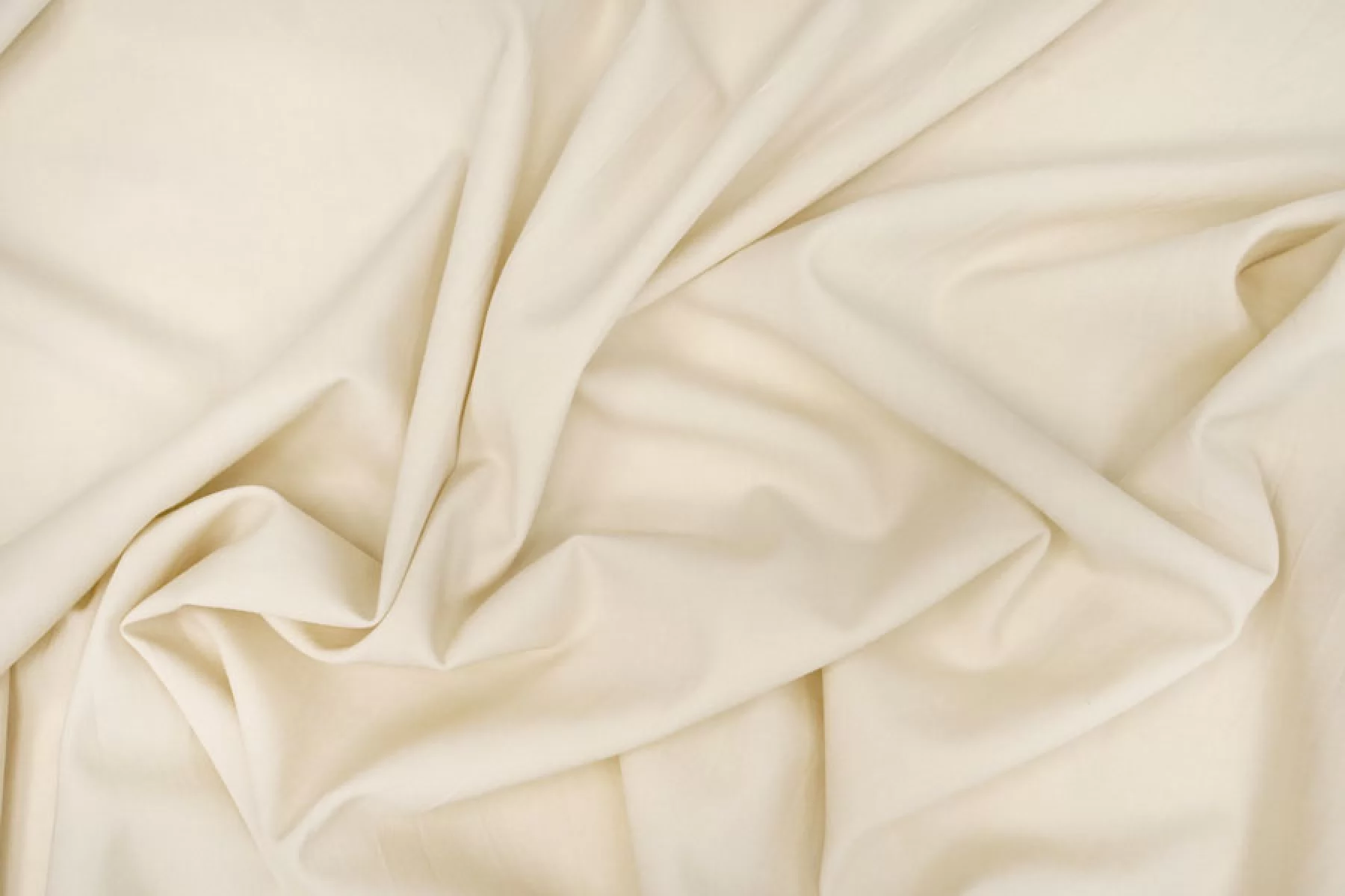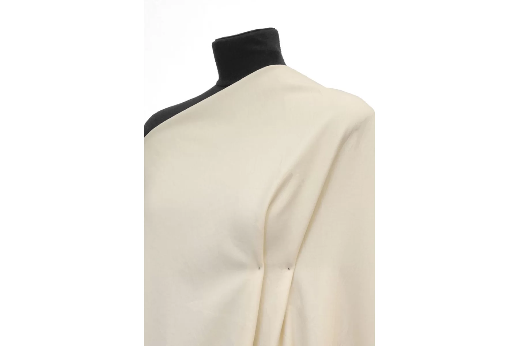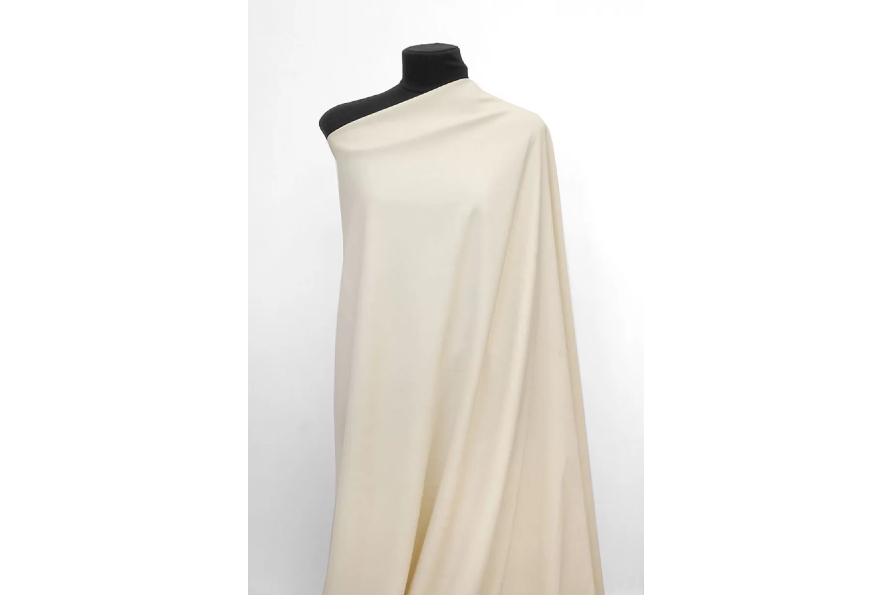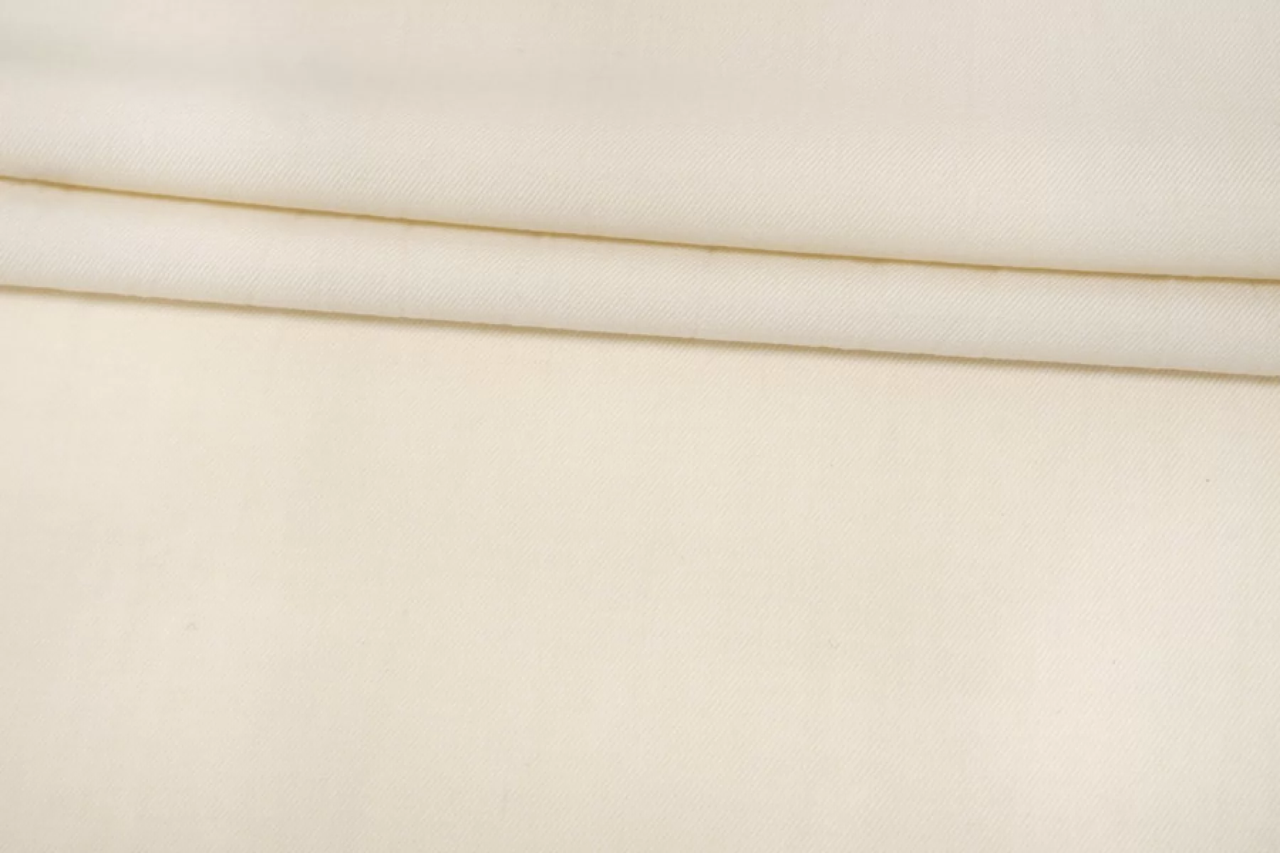 Итальянская костюмно-плательная шерсть в нежном сливочном оттенке диагонального плетения. Приятная суховатая наощупь. Немного просвечивает, пластичная, немного тянется. Не колется. Очень пластичная. Красиво драпируется и неплохо держит форму. Мнется. Подойдет для пошива жакета, брюк, платья, юбки, костюма.