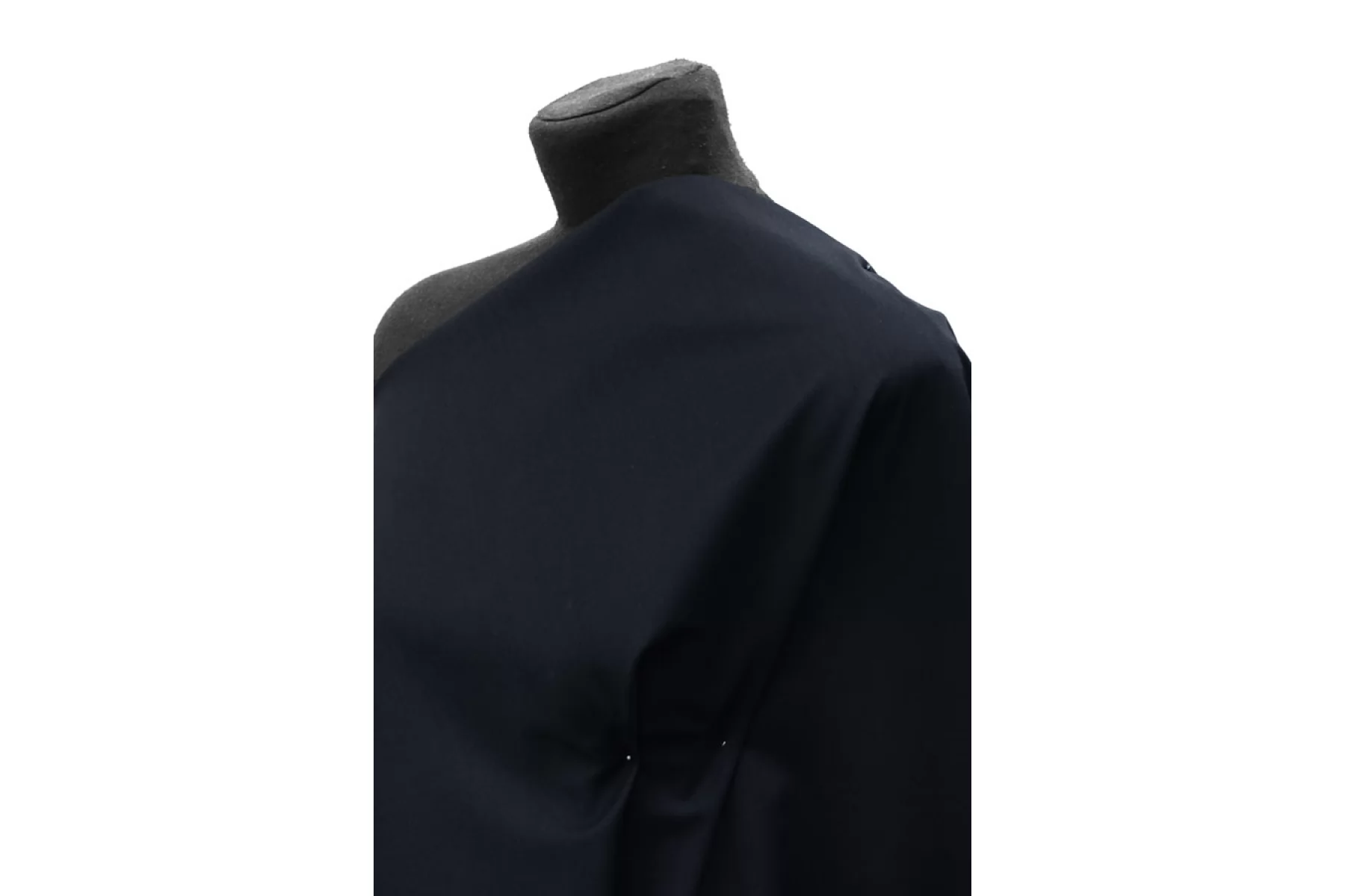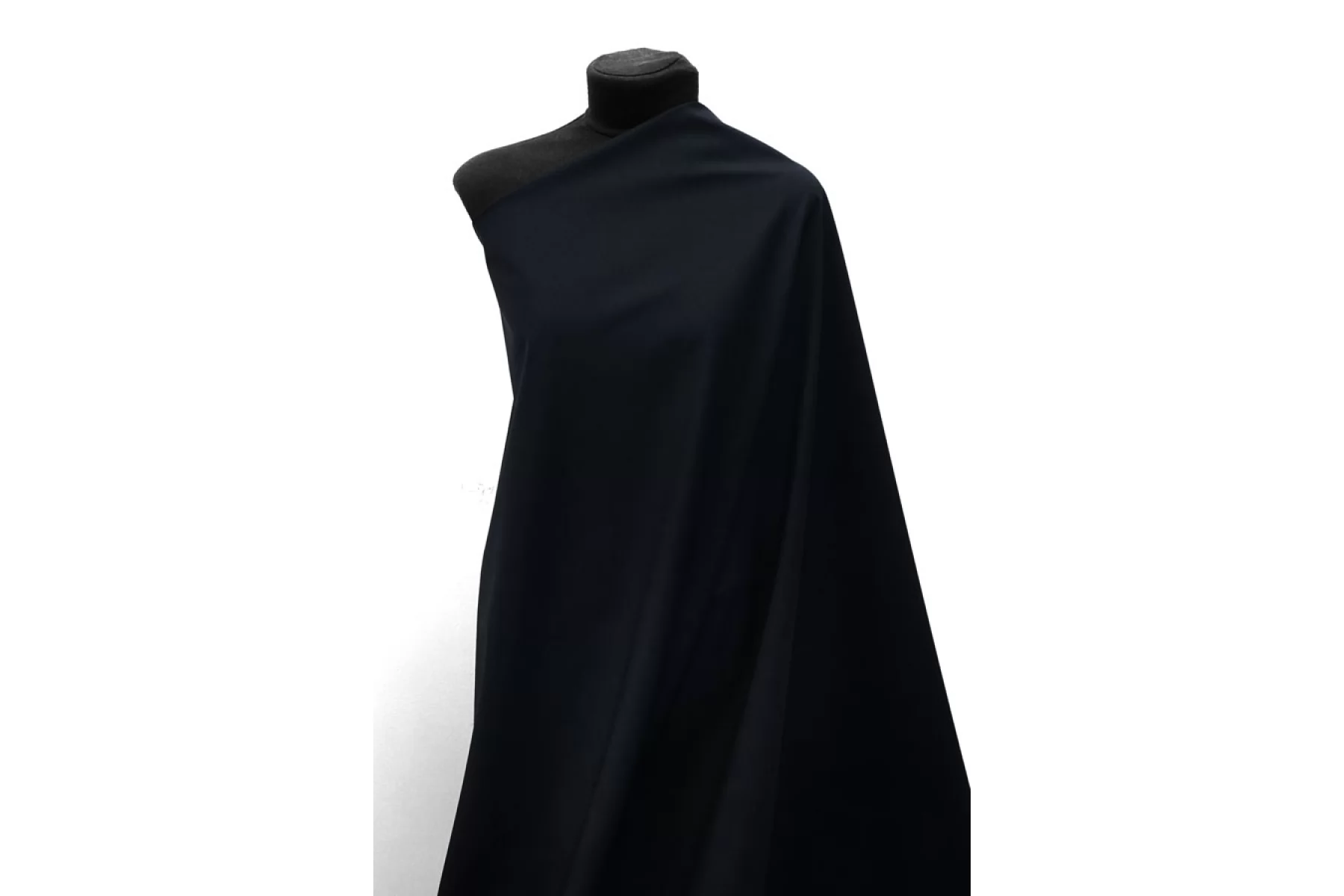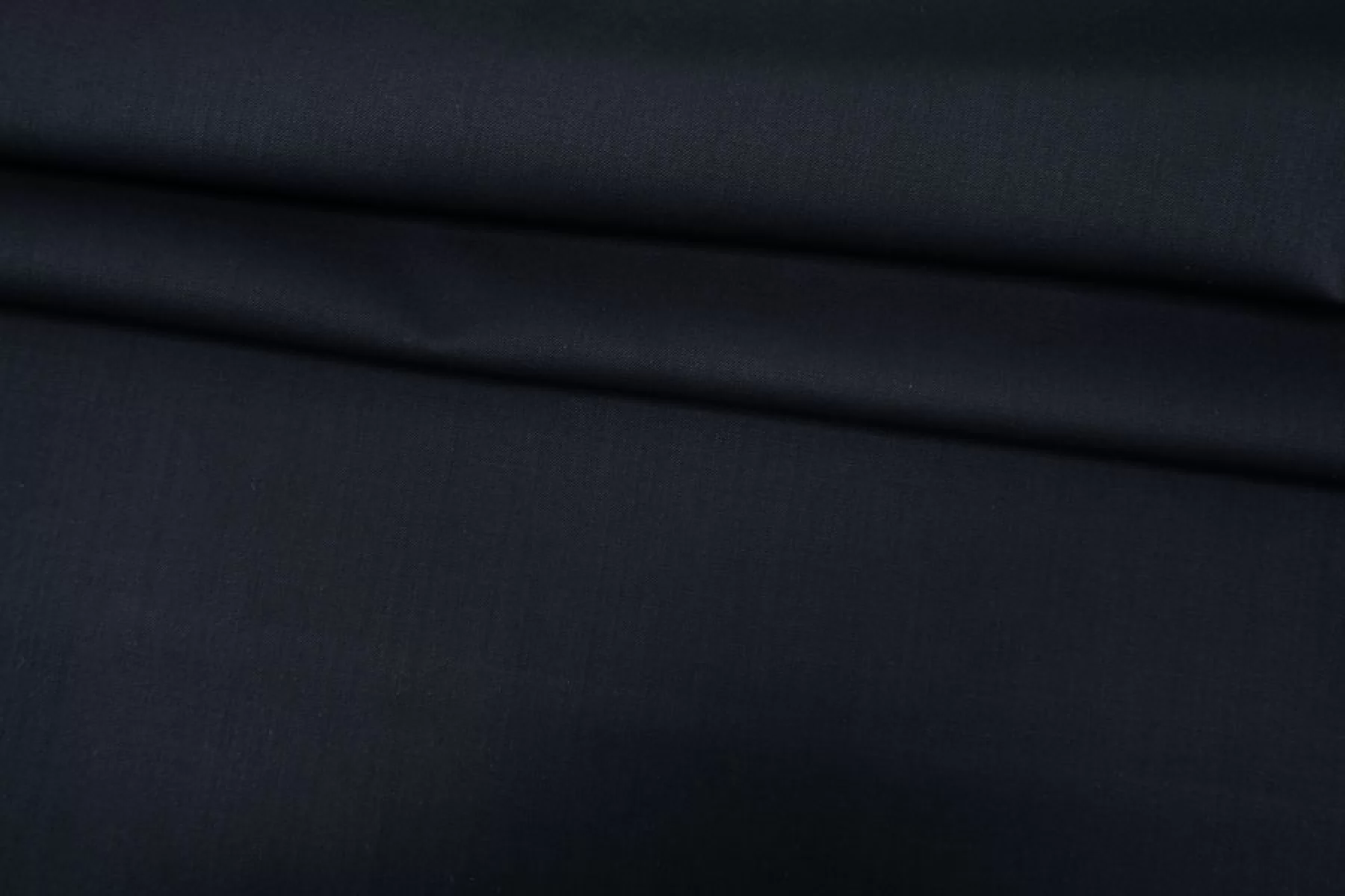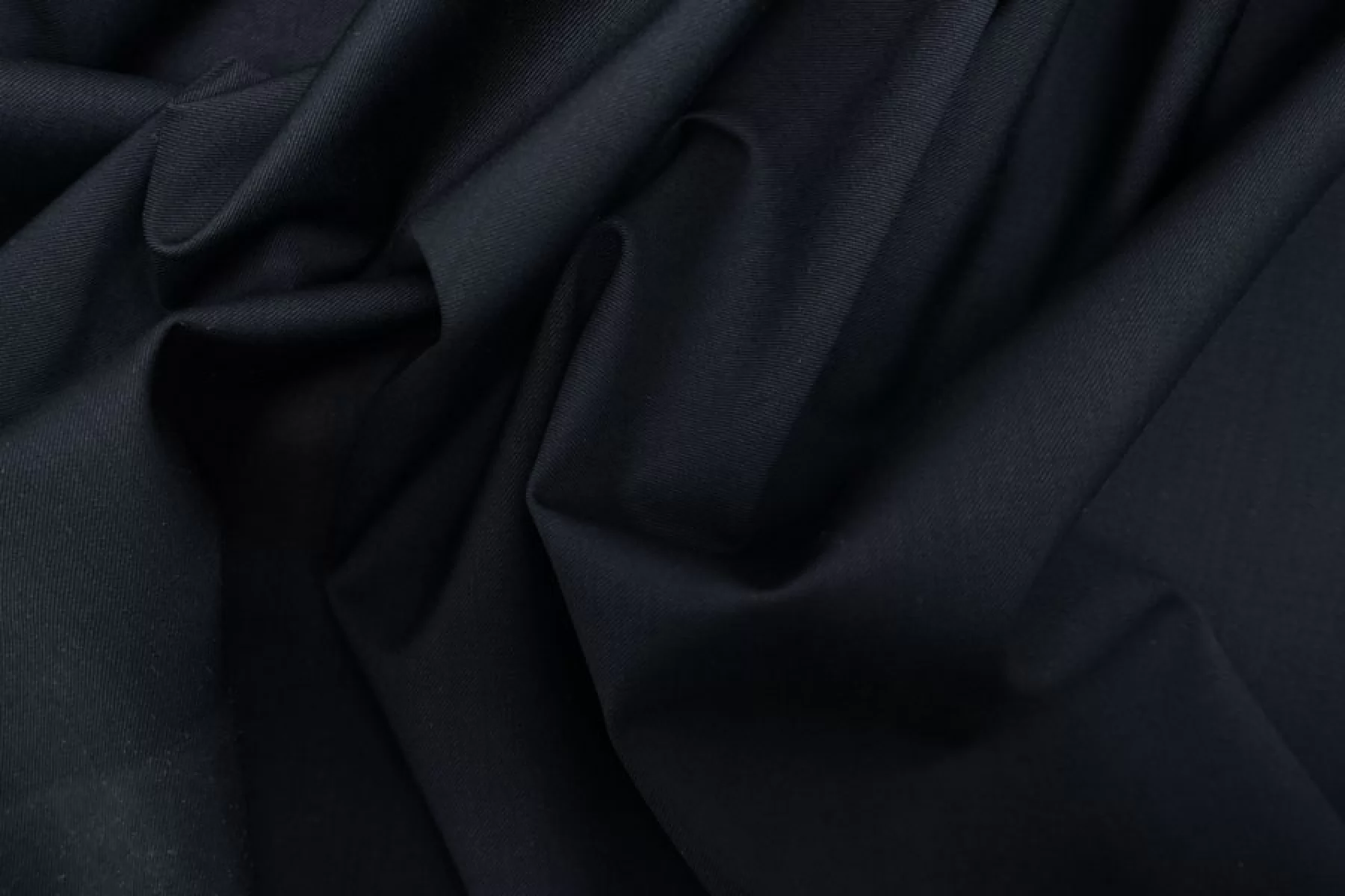 Костюмная шерсть на мембране (полиамид), темно-синего оттенка, диагонального плетения. Вода легко стекает с поверхности, но через 10 минут слегка начинает впитываться в поверхность материала, но мембрана не пропускает воду насквозь. Влаго- и ветрозащитная. Тянется. Приятная, слегка суховатая. Хорошо держит форму и складки. Не просвечивает. Слегка сминается, но восстанавливается. Подойдет для пошива тренча, куртки, бомбера, плаща.