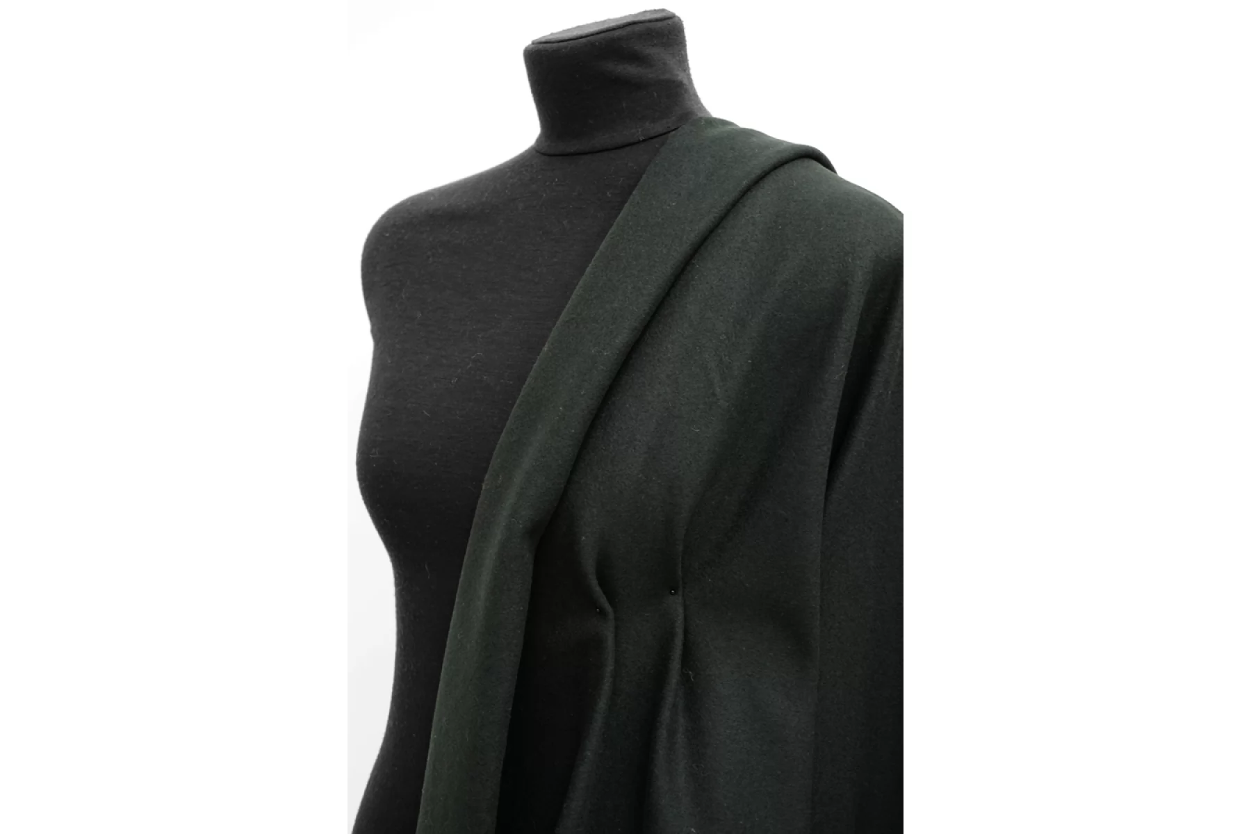 Достаточно тонкая, но плотненькая, пальтовая шерсть холодного очень темного зеленого оттенка. Тактильно приятная и очень мягкая, суховатая. С легким ненаправленным ворсом. Не просвечивает. Чувствуется, что шерсть, но не колется. Не тянется. Слегка сминается, но восстанавливается. Отличный вариант для пошива верхней группы одежды. Уход деликатный.