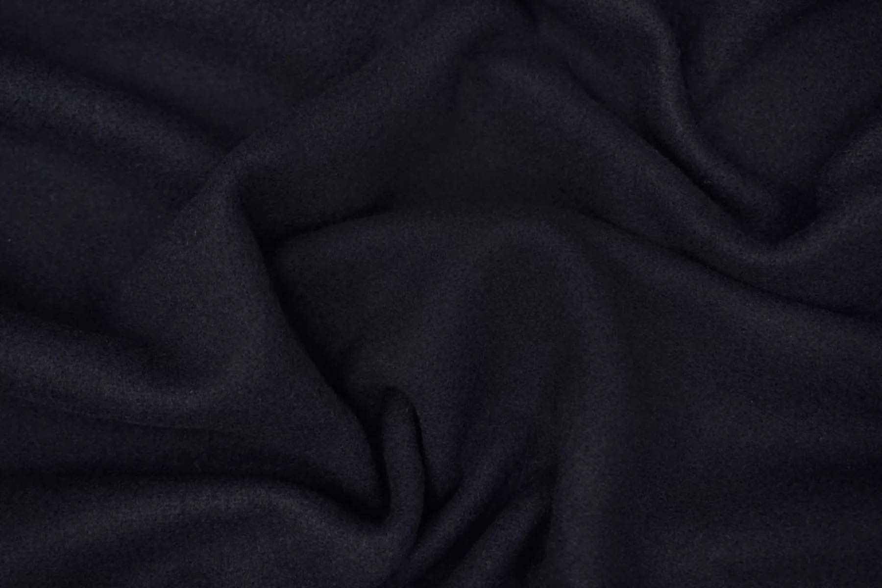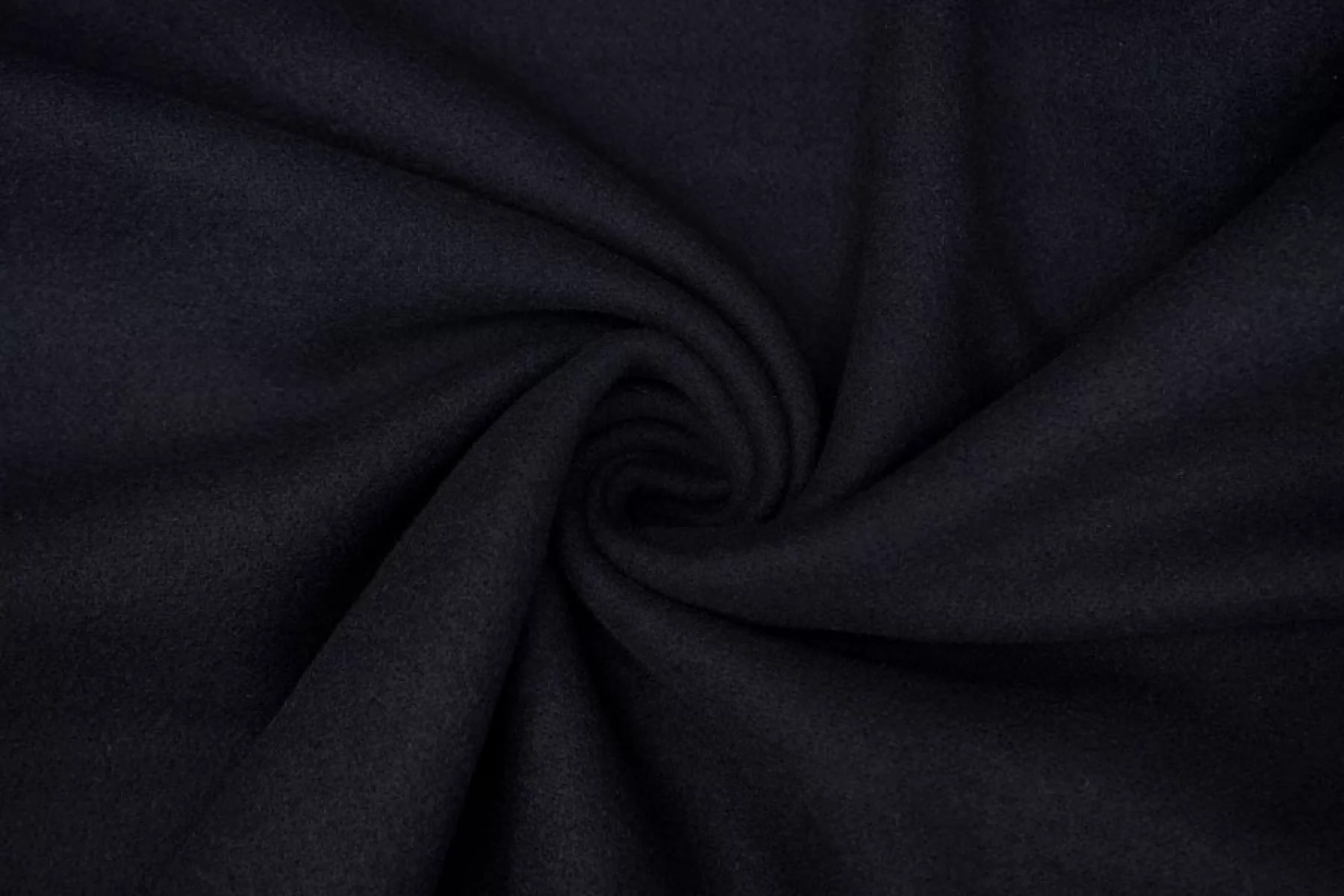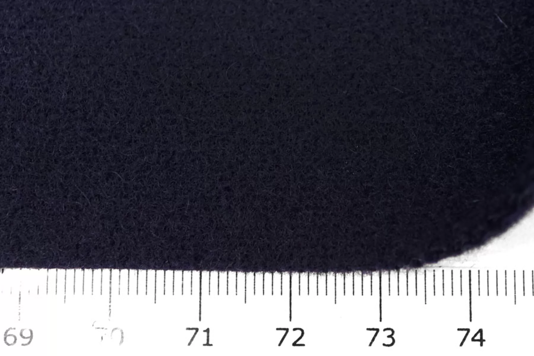 Пальтово-костюмная шерсть в глубоком темно-синем оттенке. Мягкая, приятная, чувствуется, что шерсть, слегка сухая. Не колется. Лицевая сторона с легким прижатым ворсом. Красиво смотрится в пластике и складках. Обладает легким лоском. Не просвечивает. Совсем немного пружинит за счет плетения. Материал плотненький ~1,5 мм толщиной. Неплохо держит форму. Сминается, но восстанавливается. Отлично подойдет для пошива пальто любого кроя - от классического до пальто-рубашки.