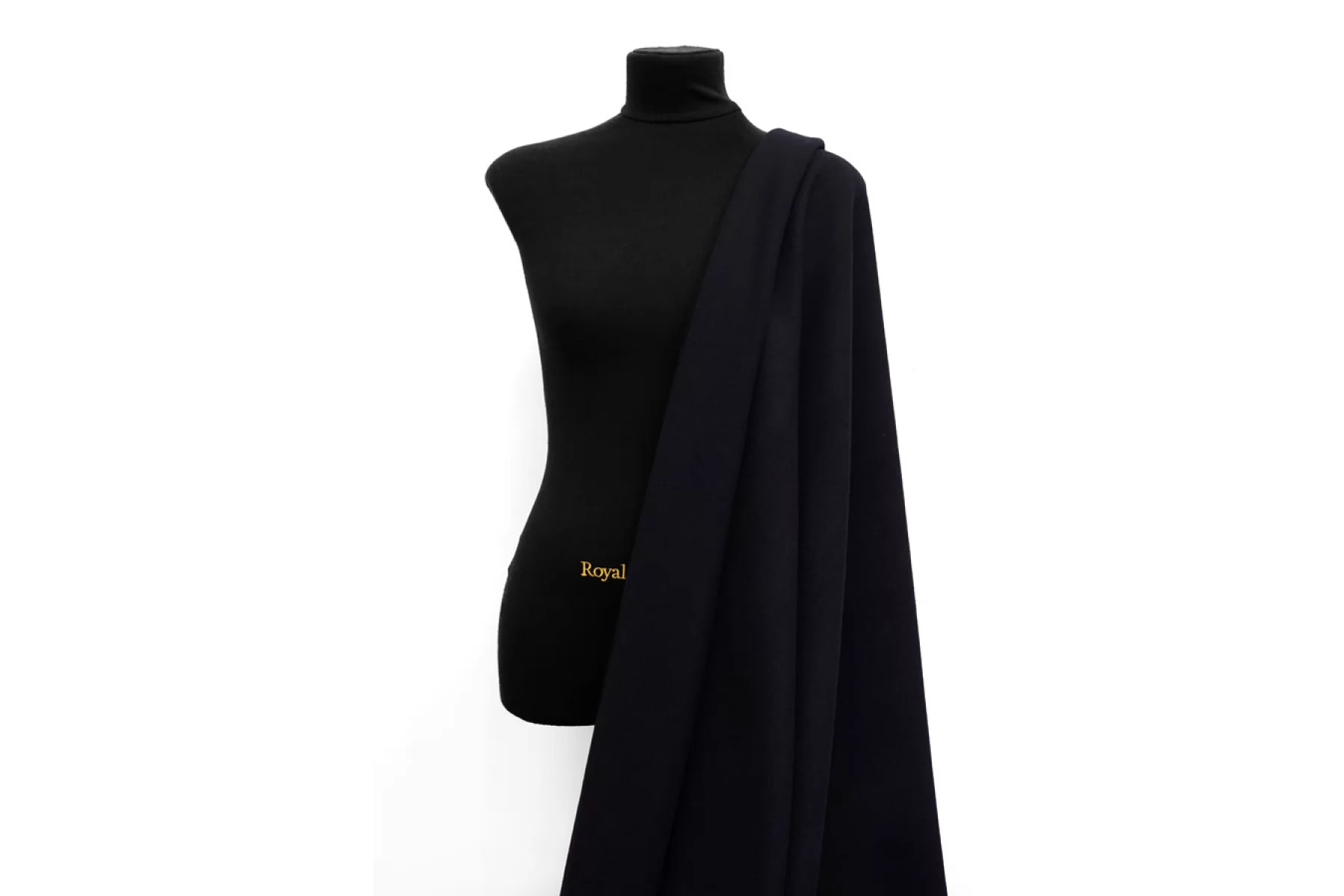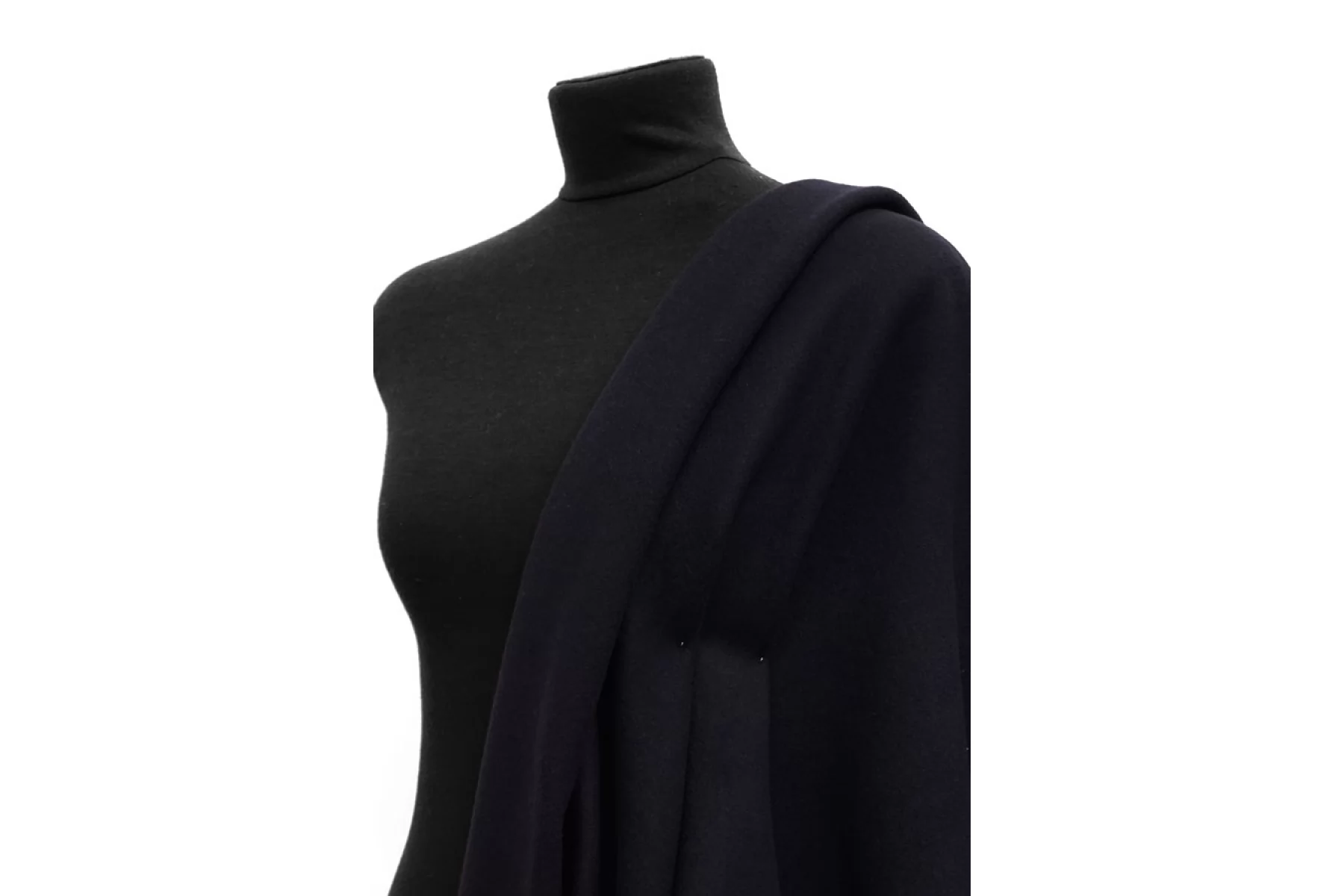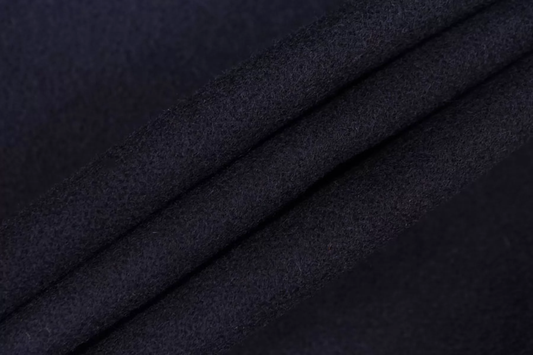 Пальтово-костюмная шерсть в глубоком темно-синем оттенке. Мягкая, приятная, чувствуется, что шерсть, слегка сухая. Не колется. Лицевая сторона с легким прижатым ворсом. Красиво смотрится в пластике и складках. Обладает легким лоском. Не просвечивает. Совсем немного пружинит за счет плетения. Материал плотненький ~1,5 мм толщиной. Неплохо держит форму. Сминается, но восстанавливается. Отлично подойдет для пошива пальто любого кроя - от классического до пальто-рубашки.