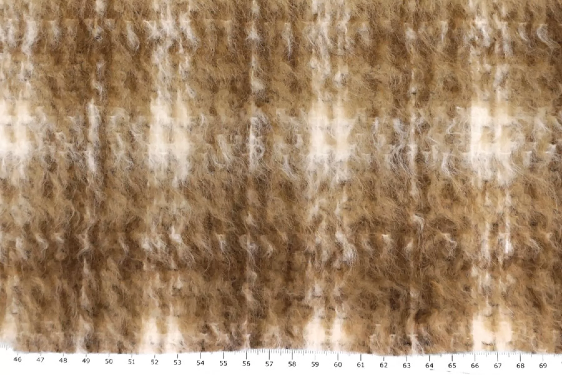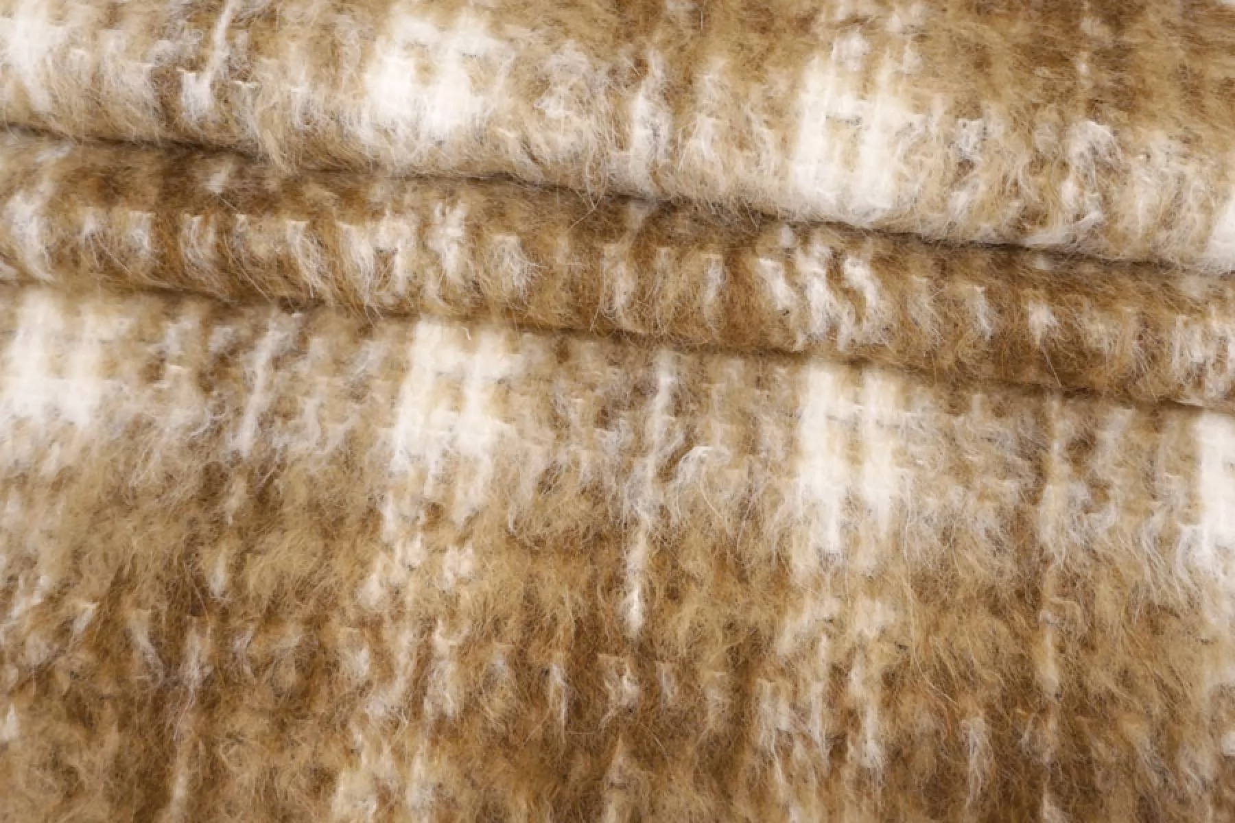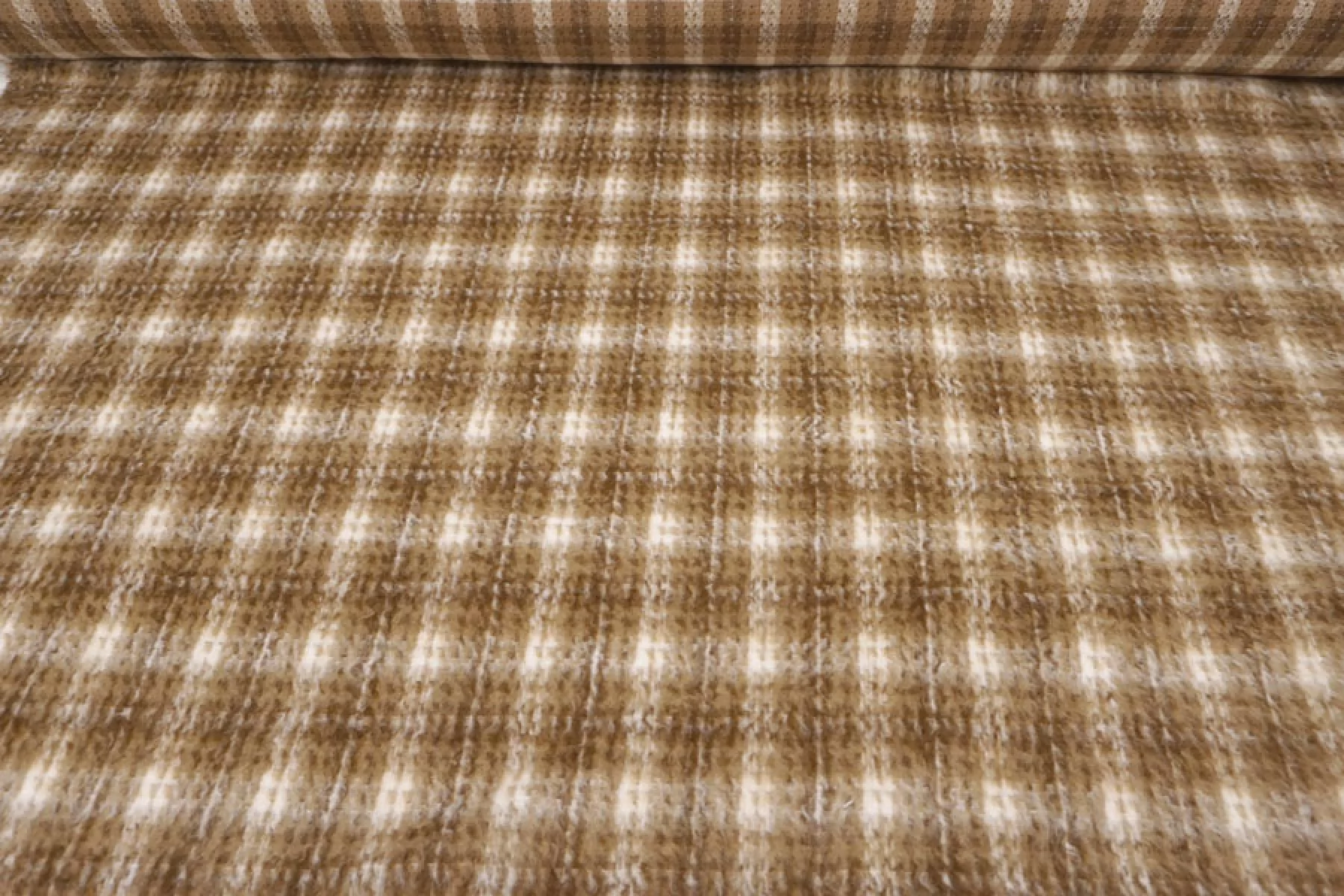 Интересная пальтовая шерсть с узором-клеткой в бело-охристо-коричневых тонах. Ворс примерно 1 см длинной, направленный. Материал очень мягкий и приятный, суховатый и немного колется. Толщина примерно 1 мм. Не тянется. Форму держит. Не мнется. Отличный вариант на бомберы или пальто. Уход деликатный.