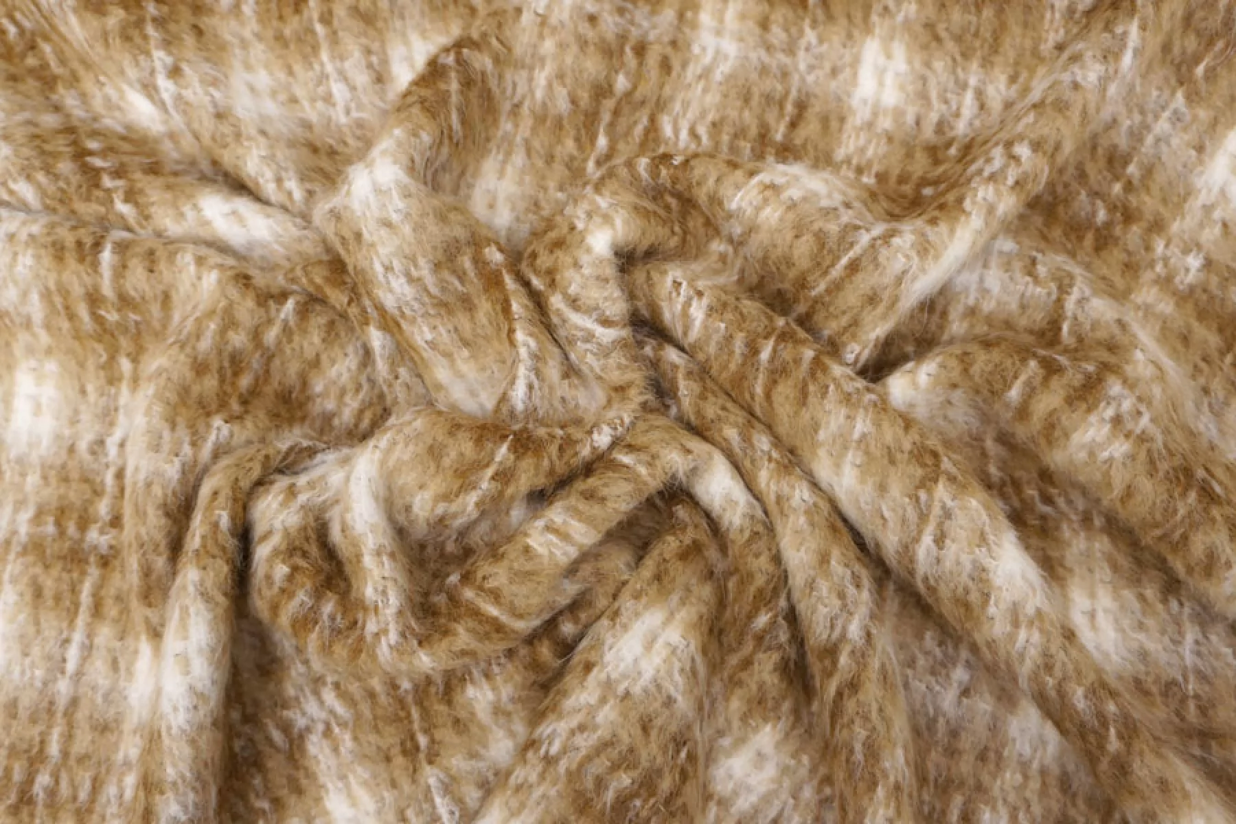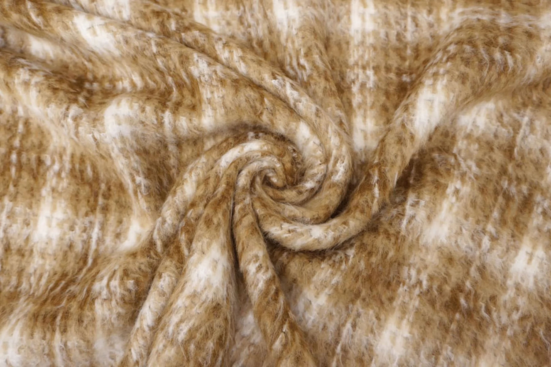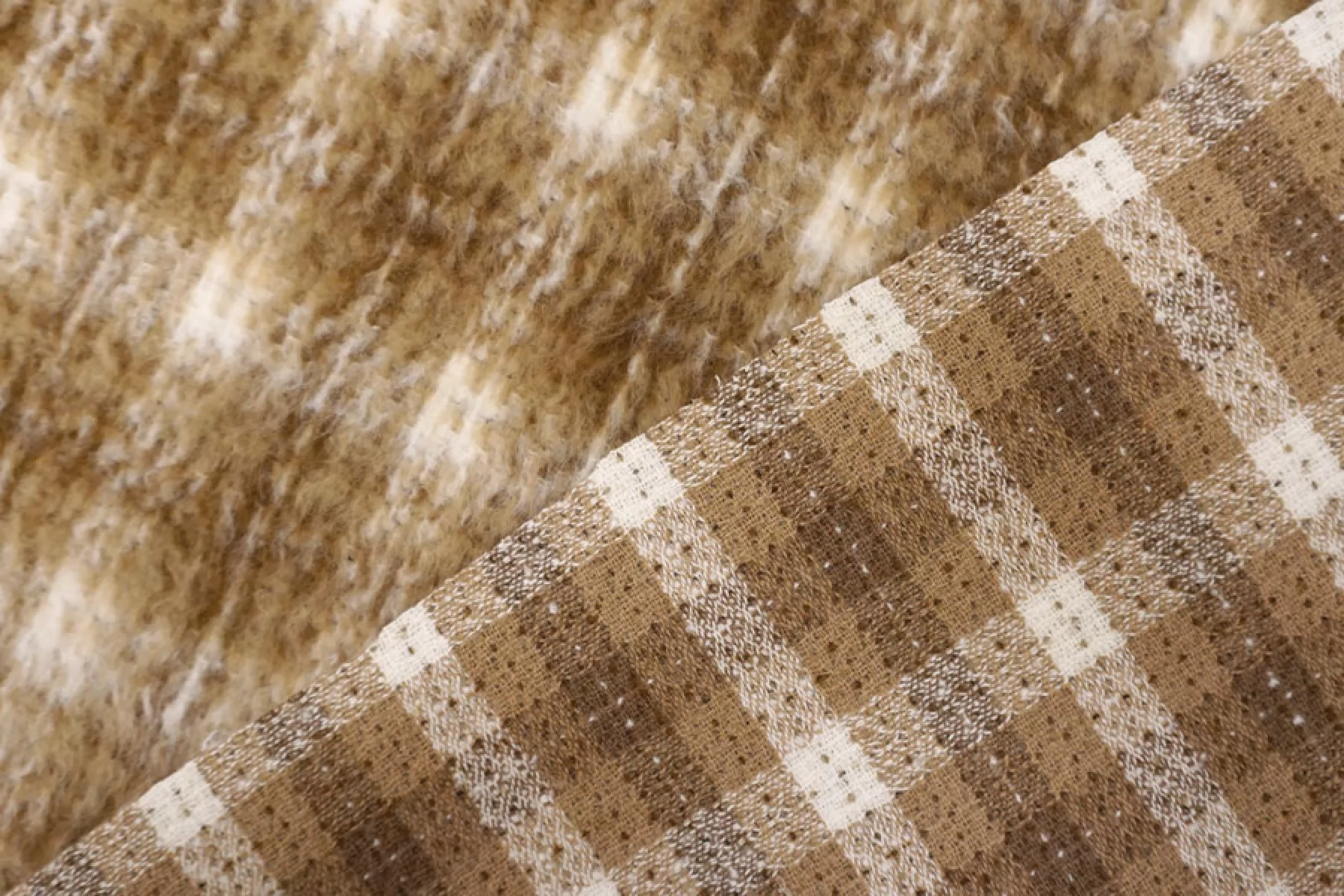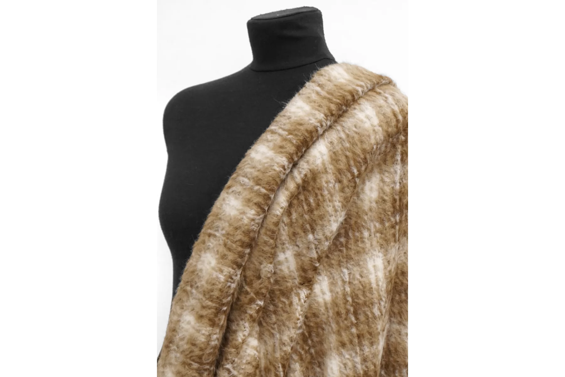 Интересная пальтовая шерсть с узором-клеткой в бело-охристо-коричневых тонах. Ворс примерно 1 см длинной, направленный. Материал очень мягкий и приятный, суховатый и немного колется. Толщина примерно 1 мм. Не тянется. Форму держит. Не мнется. Отличный вариант на бомберы или пальто. Уход деликатный.