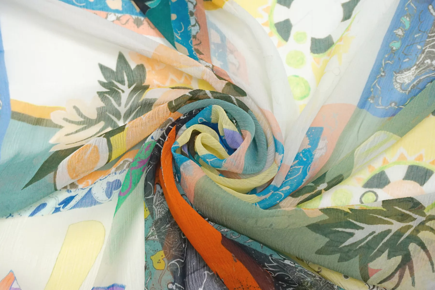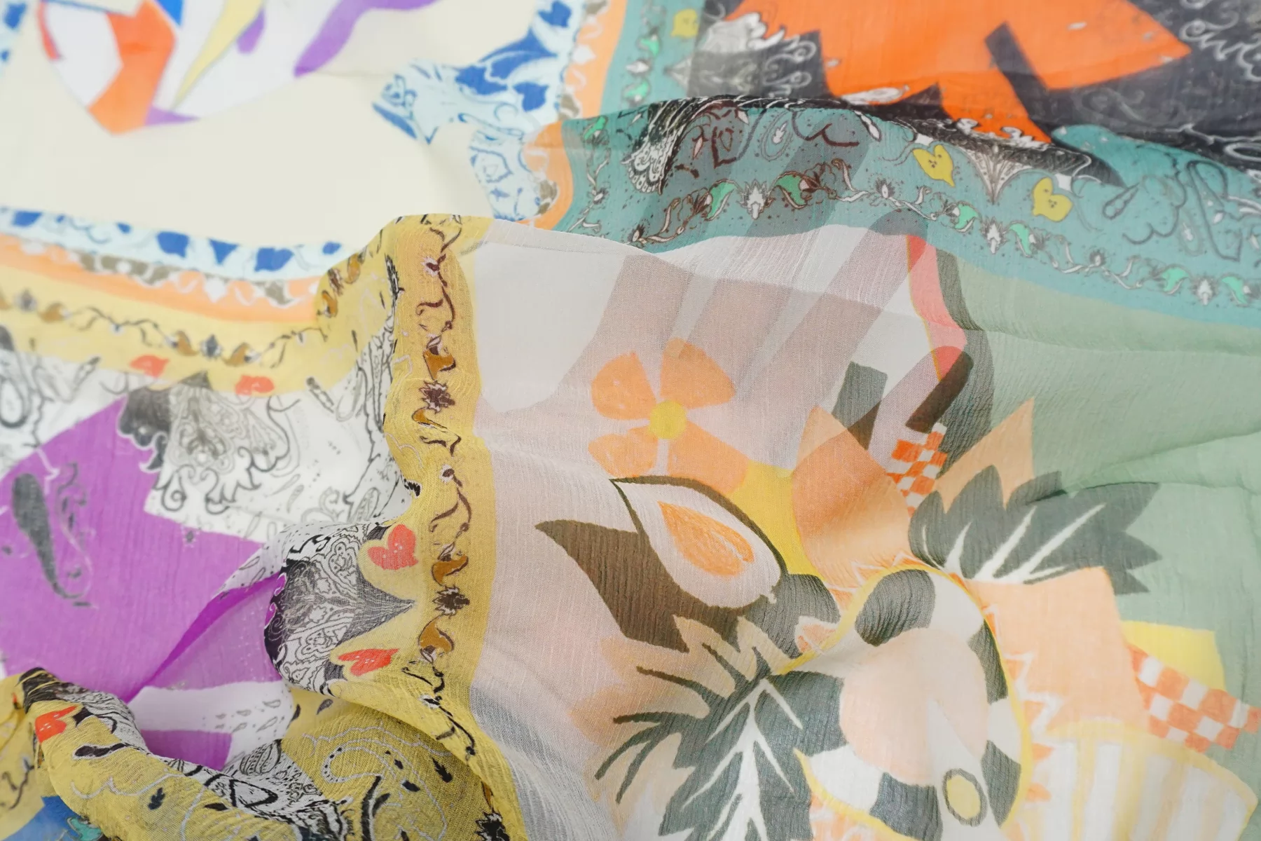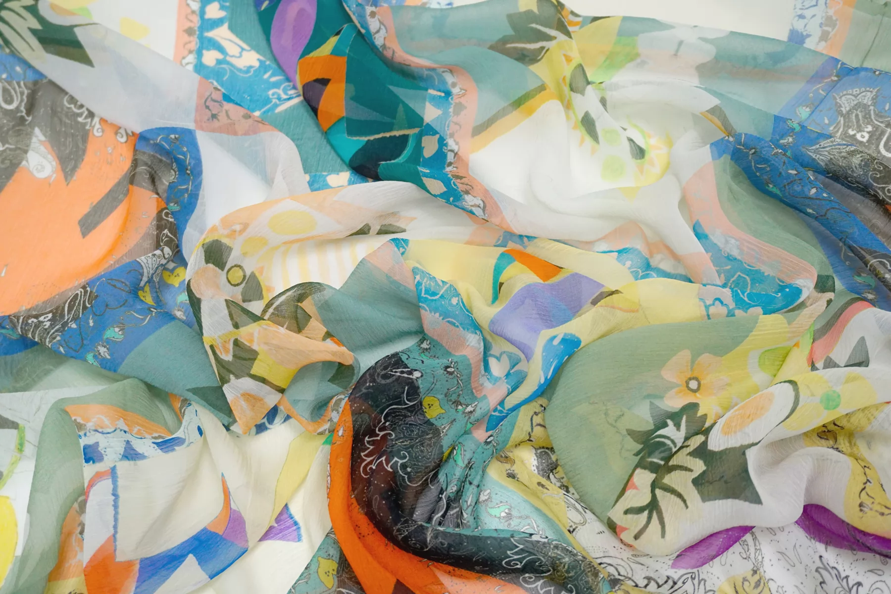 Раппорт 133 см. Шикарный шёлковый креш-шифон с абстрактным принтом под платочный. Тончайший, легкий, летящий! Прекрасная пластика. Гладкий, приятный, мягкий и невесомый. Жатая структура тянется, мнется слабо. Полупрозрачный. Форму не держит, но красив в складках. Шьем блузки, платья, юбки, или используем для отдельных элементов изделия. Уход деликатный.