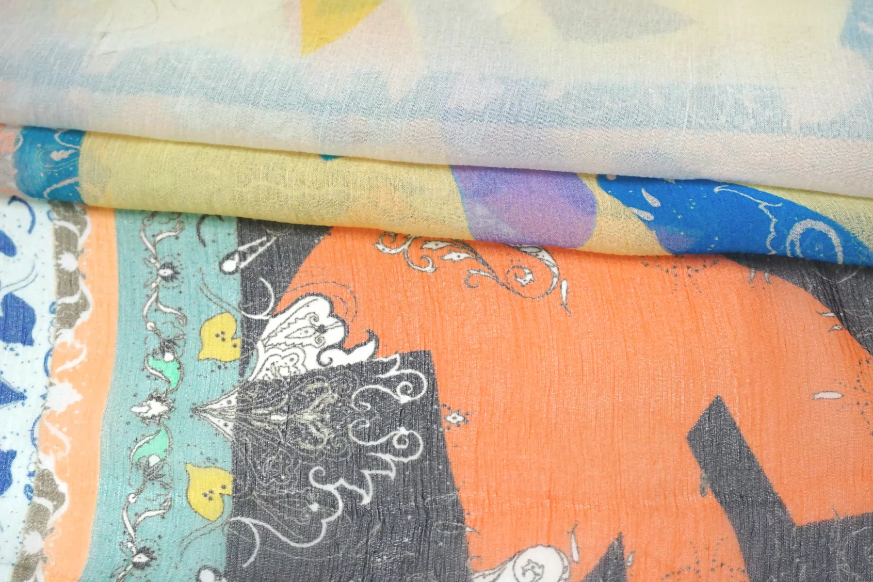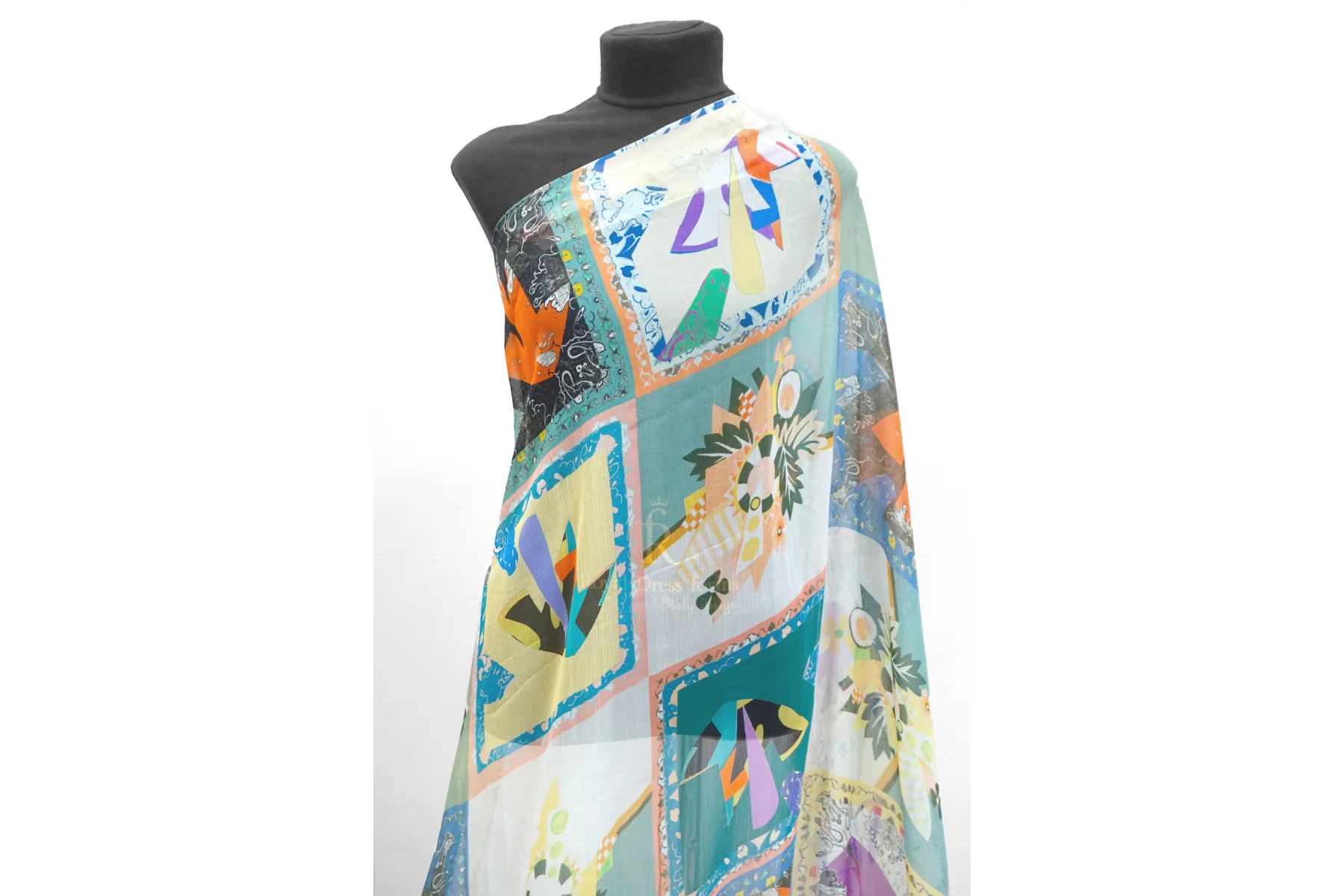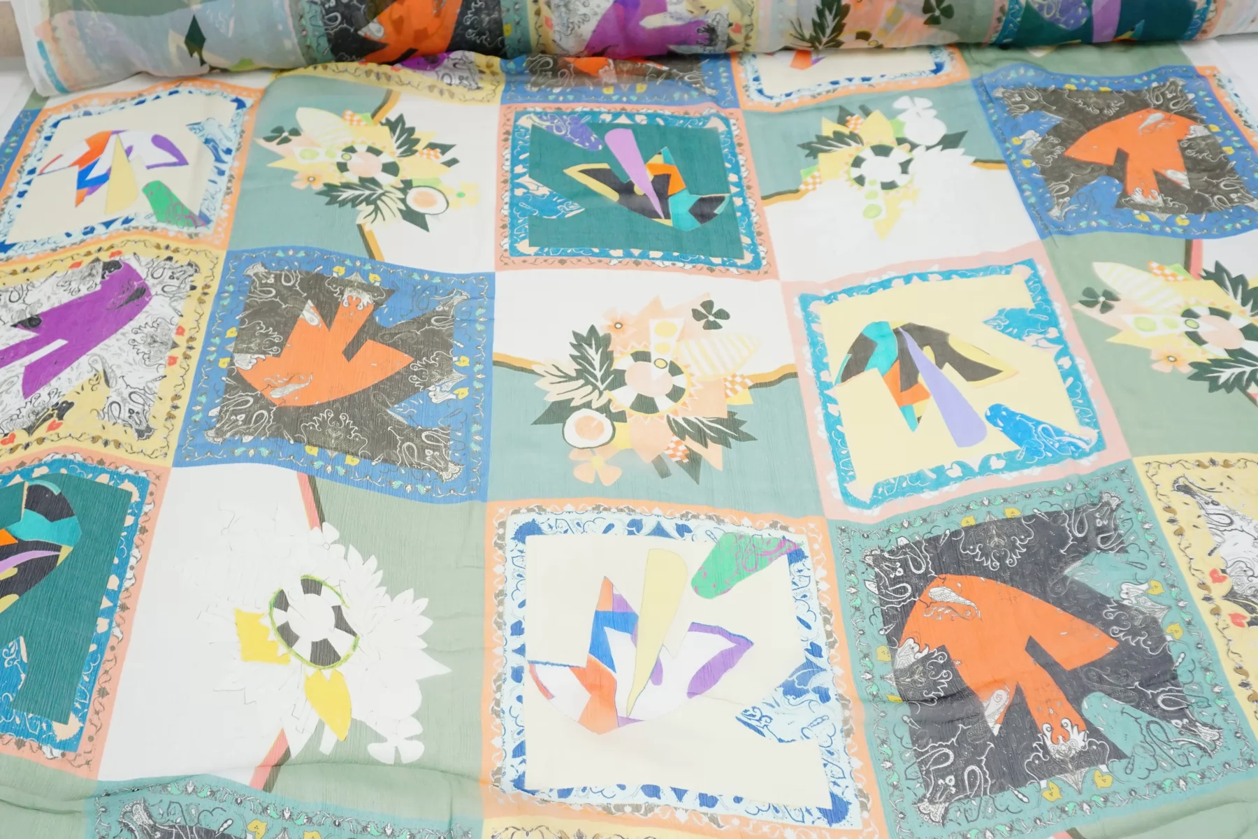 Раппорт 133 см. Шикарный шёлковый креш-шифон с абстрактным принтом под платочный. Тончайший, легкий, летящий! Прекрасная пластика. Гладкий, приятный, мягкий и невесомый. Жатая структура тянется, мнется слабо. Полупрозрачный. Форму не держит, но красив в складках. Шьем блузки, платья, юбки, или используем для отдельных элементов изделия. Уход деликатный.