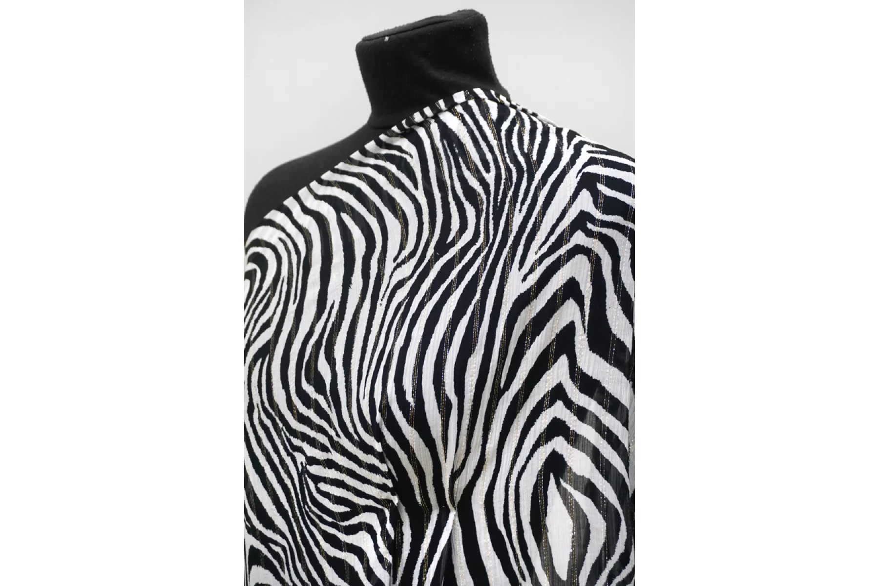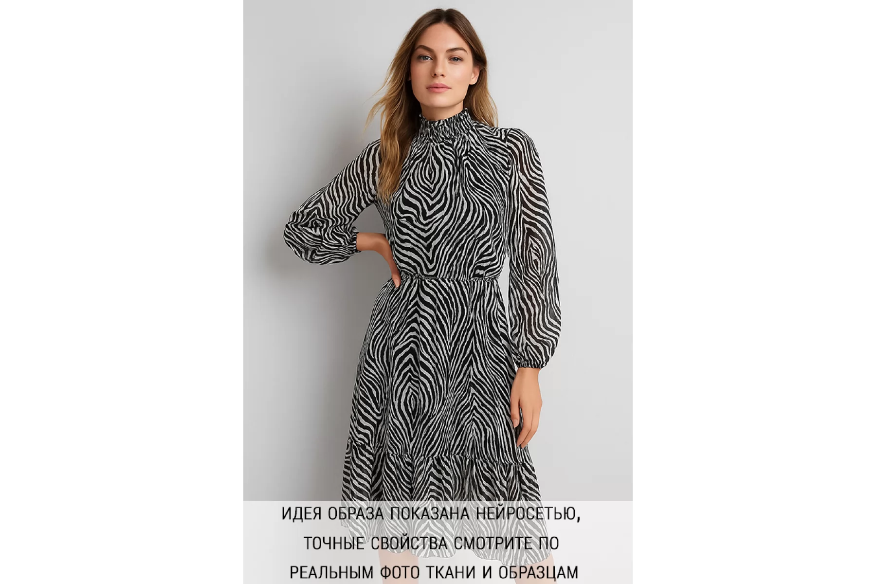 Шикарный креш-шифон из шелка с вискозой, с черно-белым принтом, плюс полосками вплетен серебристый люрекс. Тончайший, легкий, летящий! Прекрасная пластика. Гладкий, приятный, мягкий и невесомый. Жатая структура немного тянется, мнется слабо. Полупрозрачный. Форму не держит, но красив в складках. Шьем блузки, платья, юбки, или используем для отдельных элементов изделия. Уход деликатный.