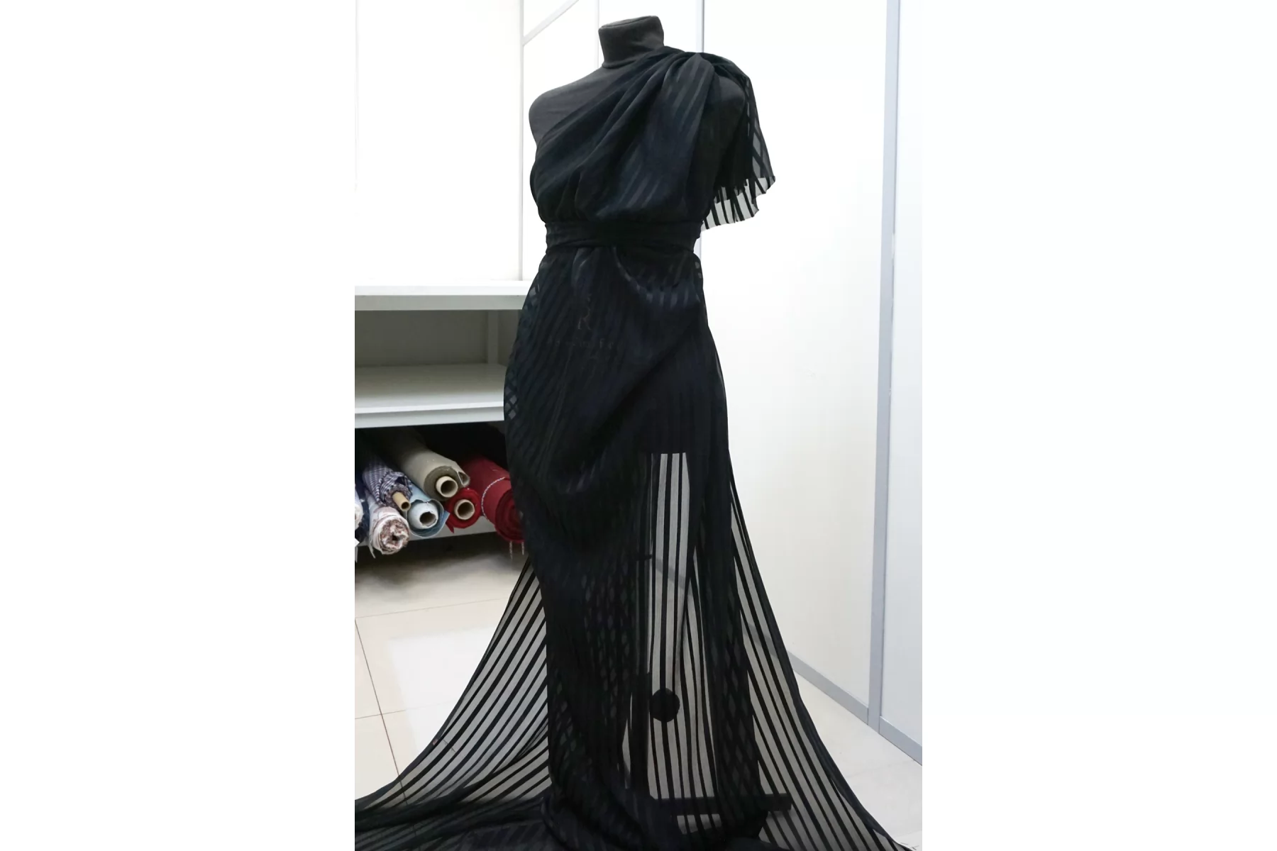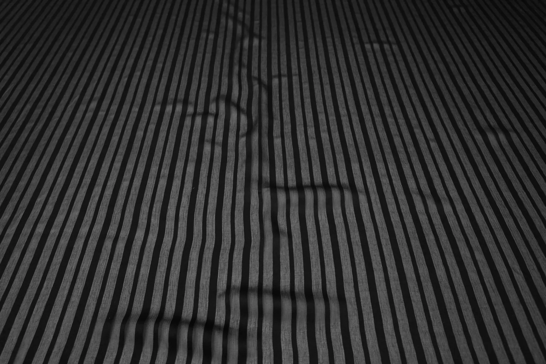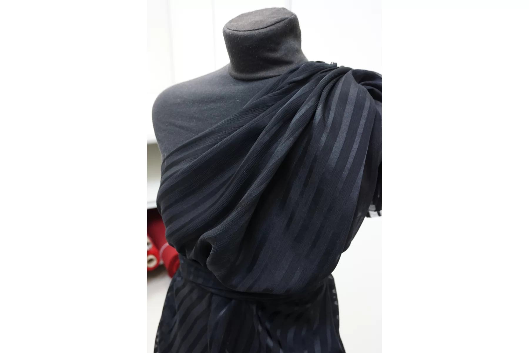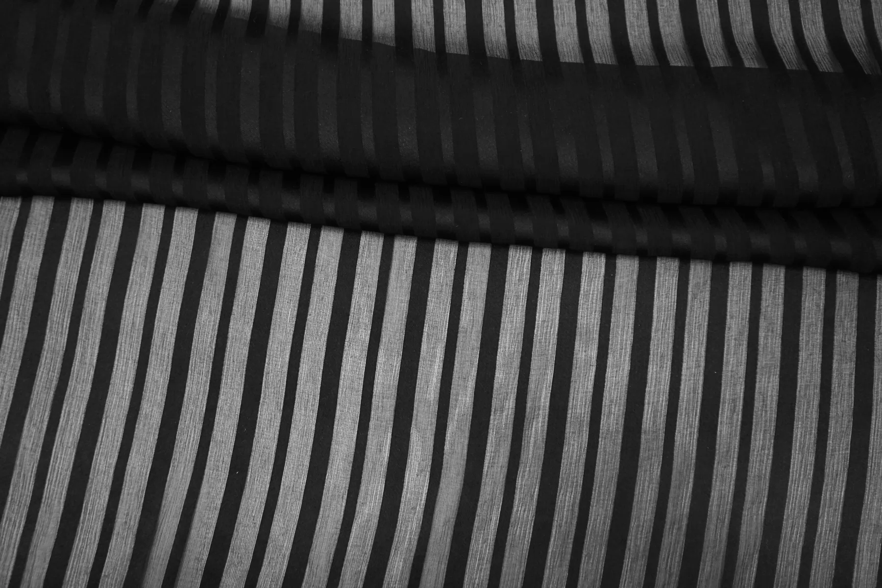 Прекрасный креш-шифон из шелка чёрно цвета, в сатиновую чёрную полоску. Тончайший, легкий, летящий! Прекрасная пластика. Гладкий, приятный, мягкий и невесомый. Жатая структура немного тянется, мнется слабо. Полупрозрачный. Форму не держит, но красив в складках. Шьем блузки, платья, юбки, или используем для отдельных элементов изделия. Уход деликатный.