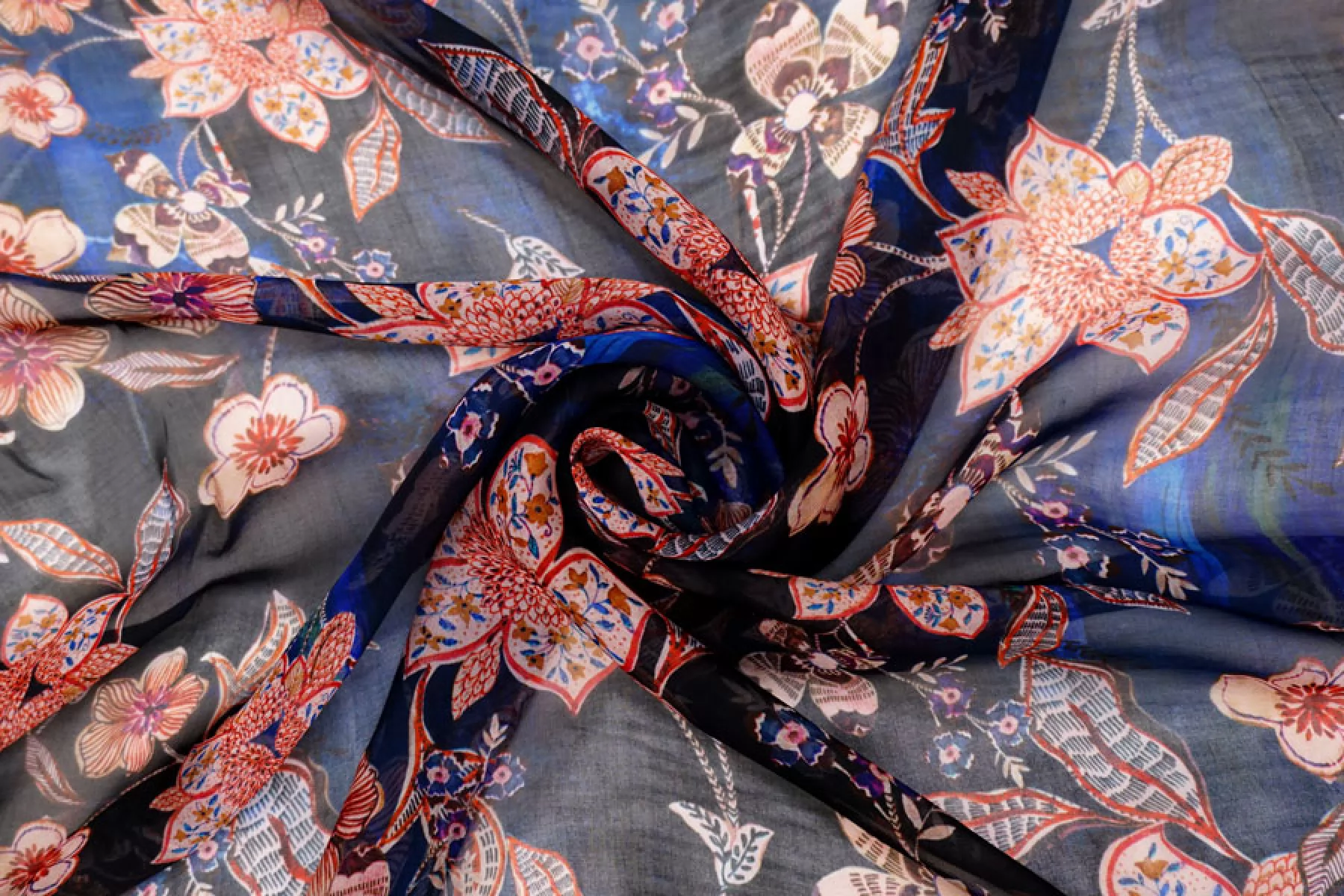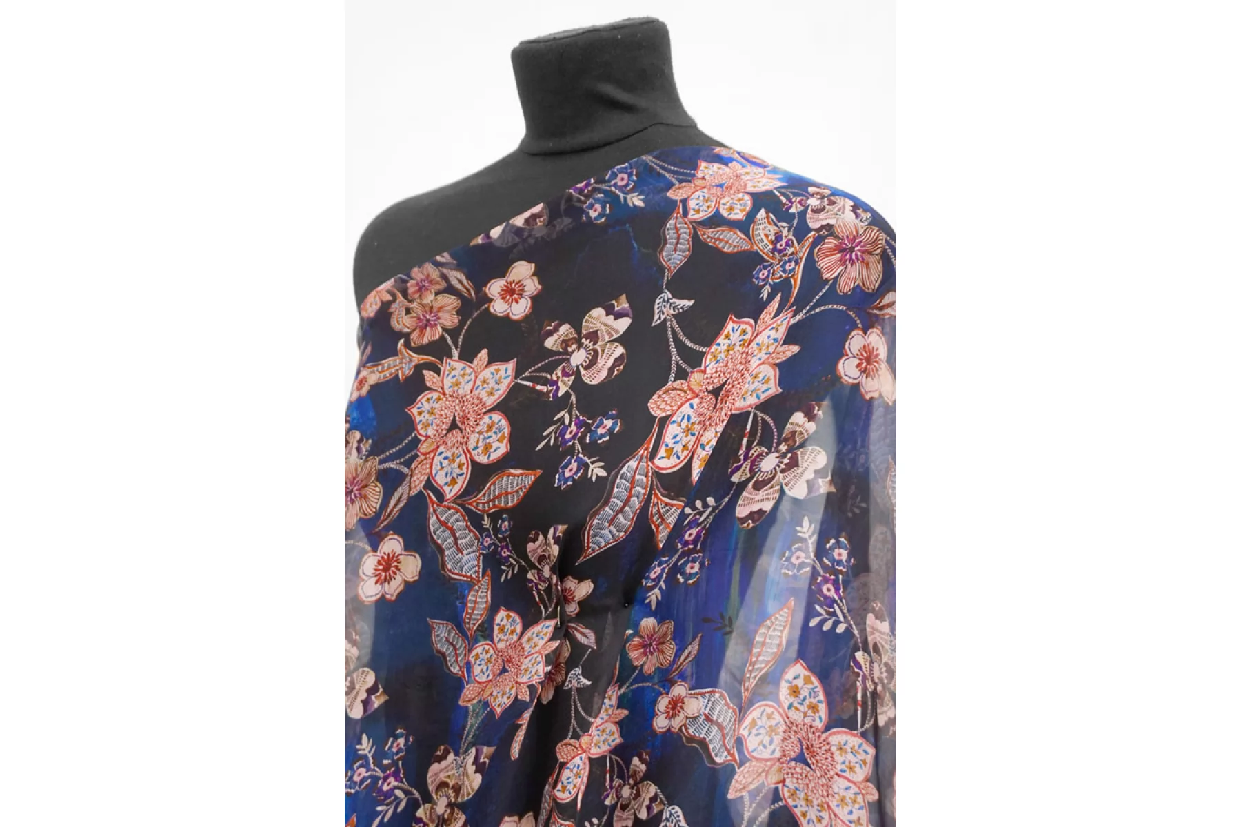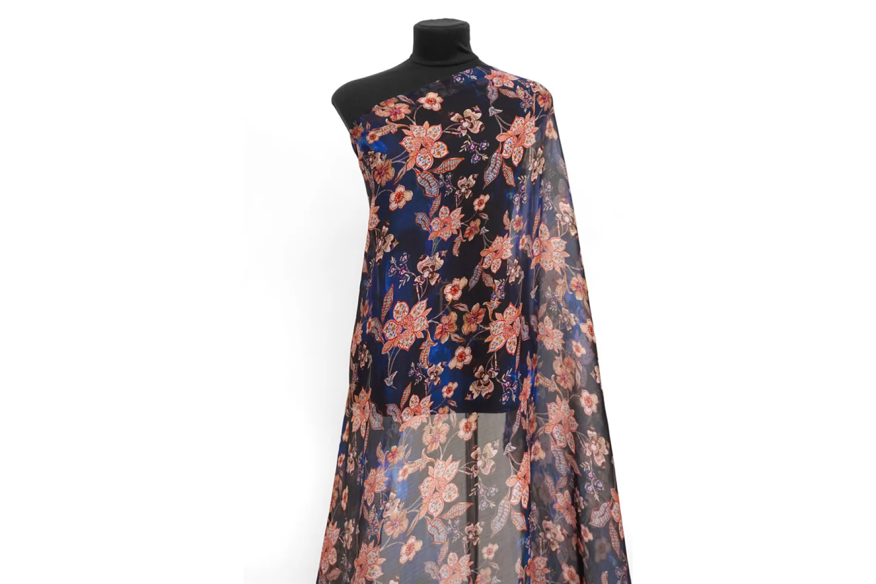 Шикарный шелковый шифон с вискозой! в основе материала черные и синие оттенки с цветочным принтом в оттенках бледно-розоватого, фиолетовых, терракотовых и бордовых. Тончайший, легкий, летящий! Прекрасная пластика. Гладкий, приятный, мягкий и невесомый. Не тянется. Практически не мнется. Полупрозрачный. Форму не держит, но красив в складках. Шьем блузки, платья, юбки, или используем для отдельных элементов изделия. Уход деликатный.
