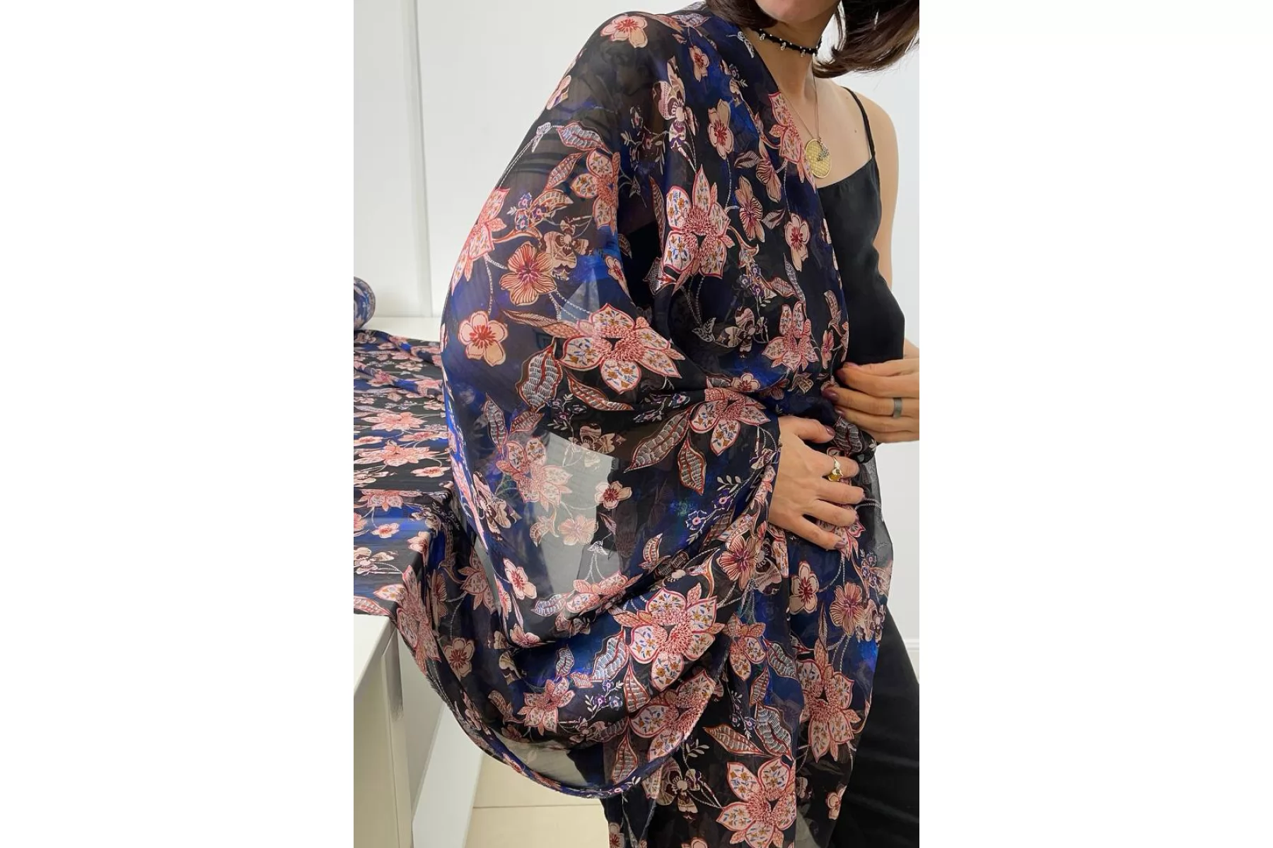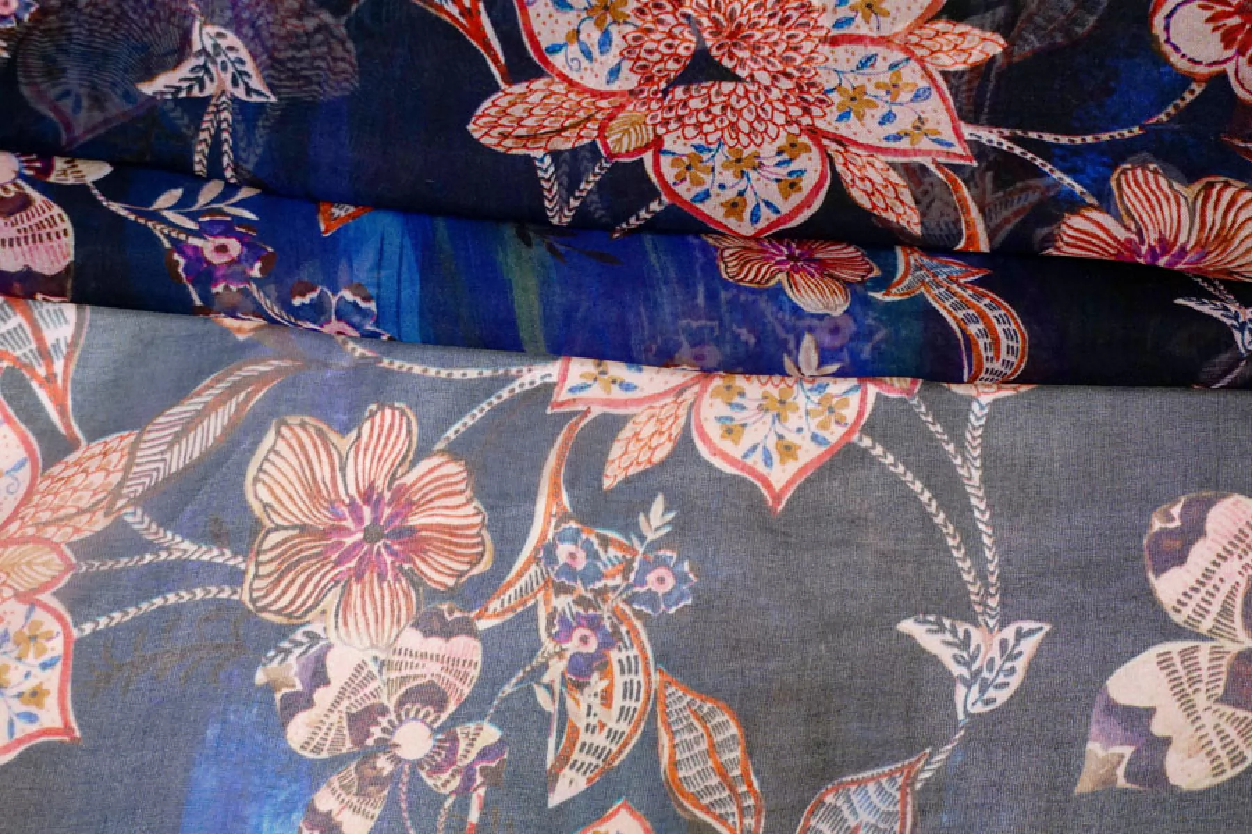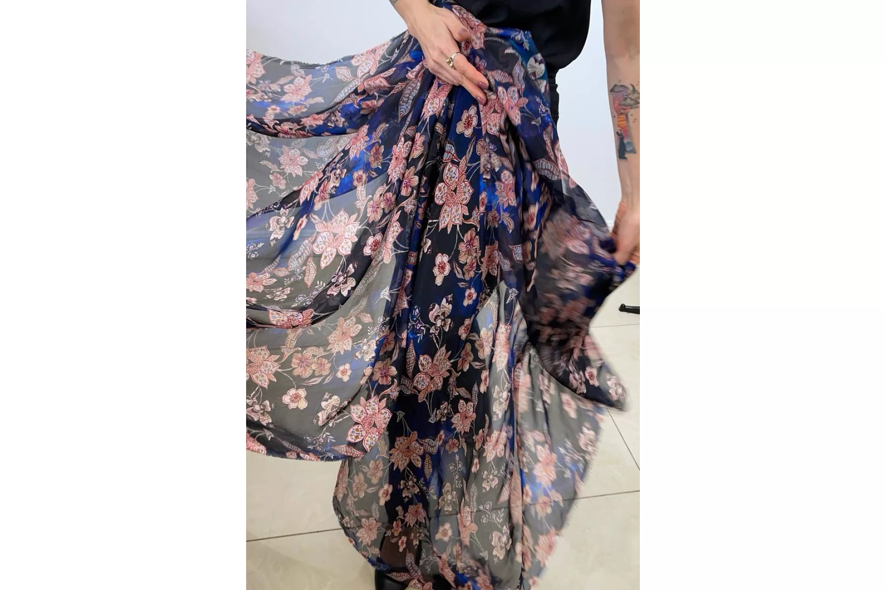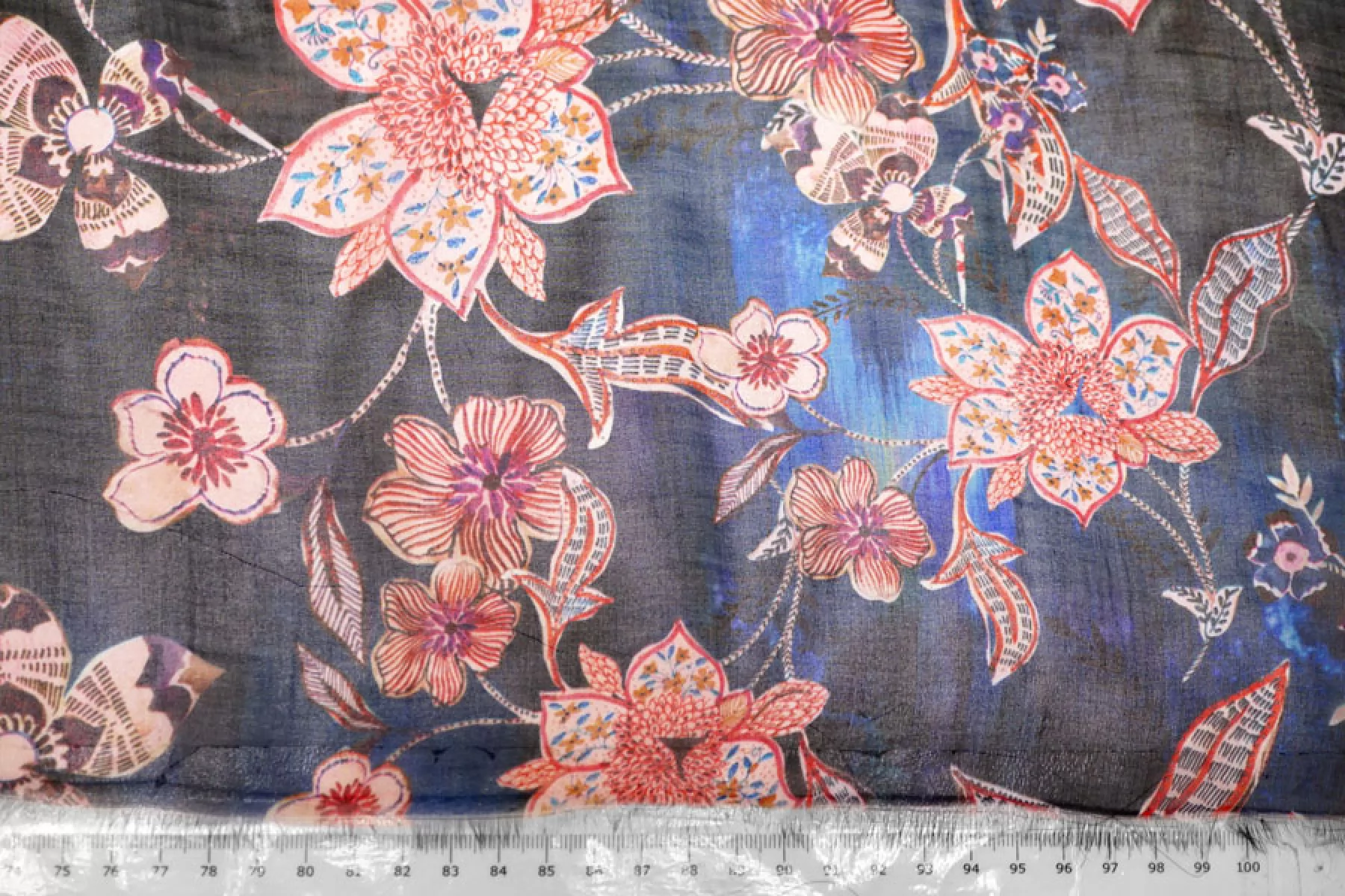 Шикарный шелковый шифон с вискозой! в основе материала черные и синие оттенки с цветочным принтом в оттенках бледно-розоватого, фиолетовых, терракотовых и бордовых. Тончайший, легкий, летящий! Прекрасная пластика. Гладкий, приятный, мягкий и невесомый. Не тянется. Практически не мнется. Полупрозрачный. Форму не держит, но красив в складках. Шьем блузки, платья, юбки, или используем для отдельных элементов изделия. Уход деликатный.