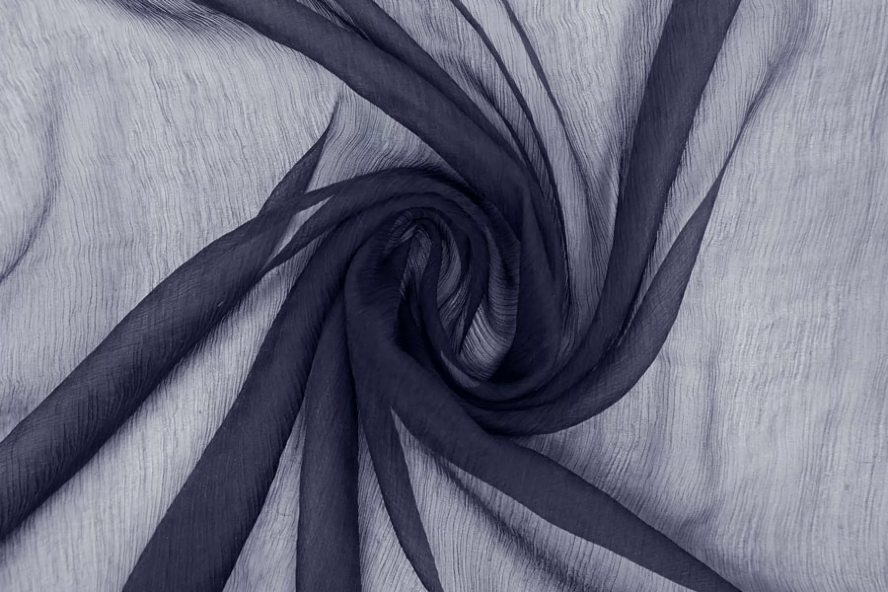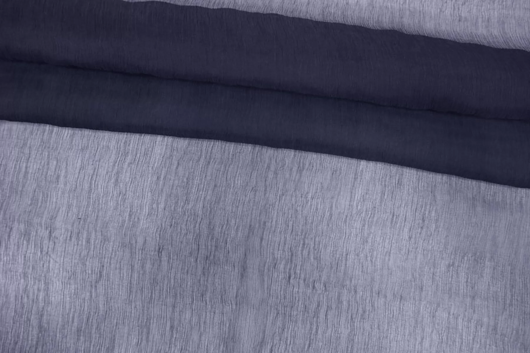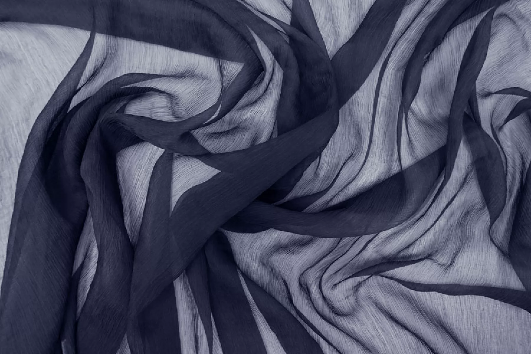 Шелковый крешированный шифон в синем оттенке. Струящийся, летящий, воздушный, шероховатый, отлично тянется за счет жатой фактуры. Прозрачный. Подойдет на платье, блузку, юбку. Уход, как и за любым шелком, деликатный.