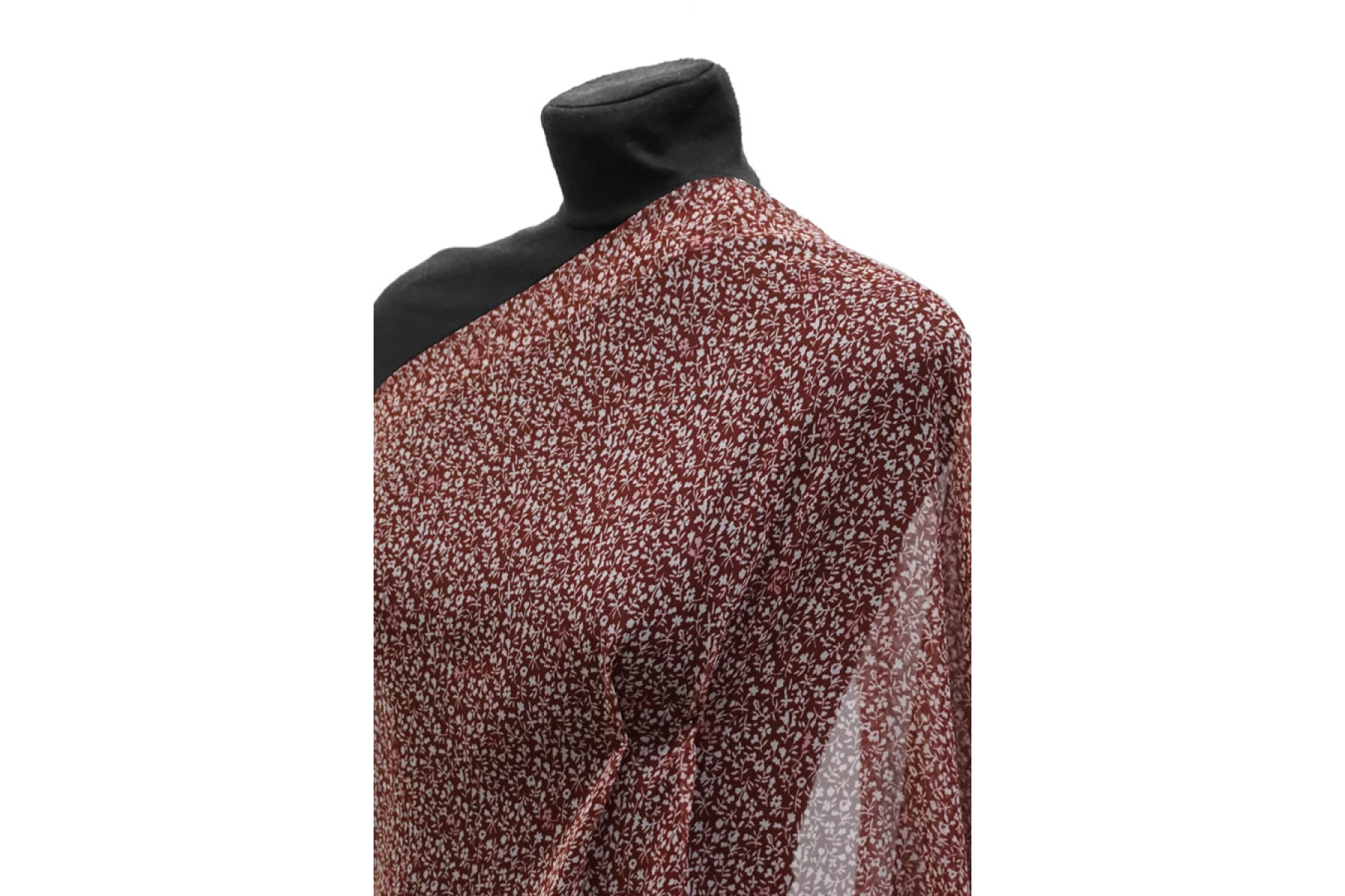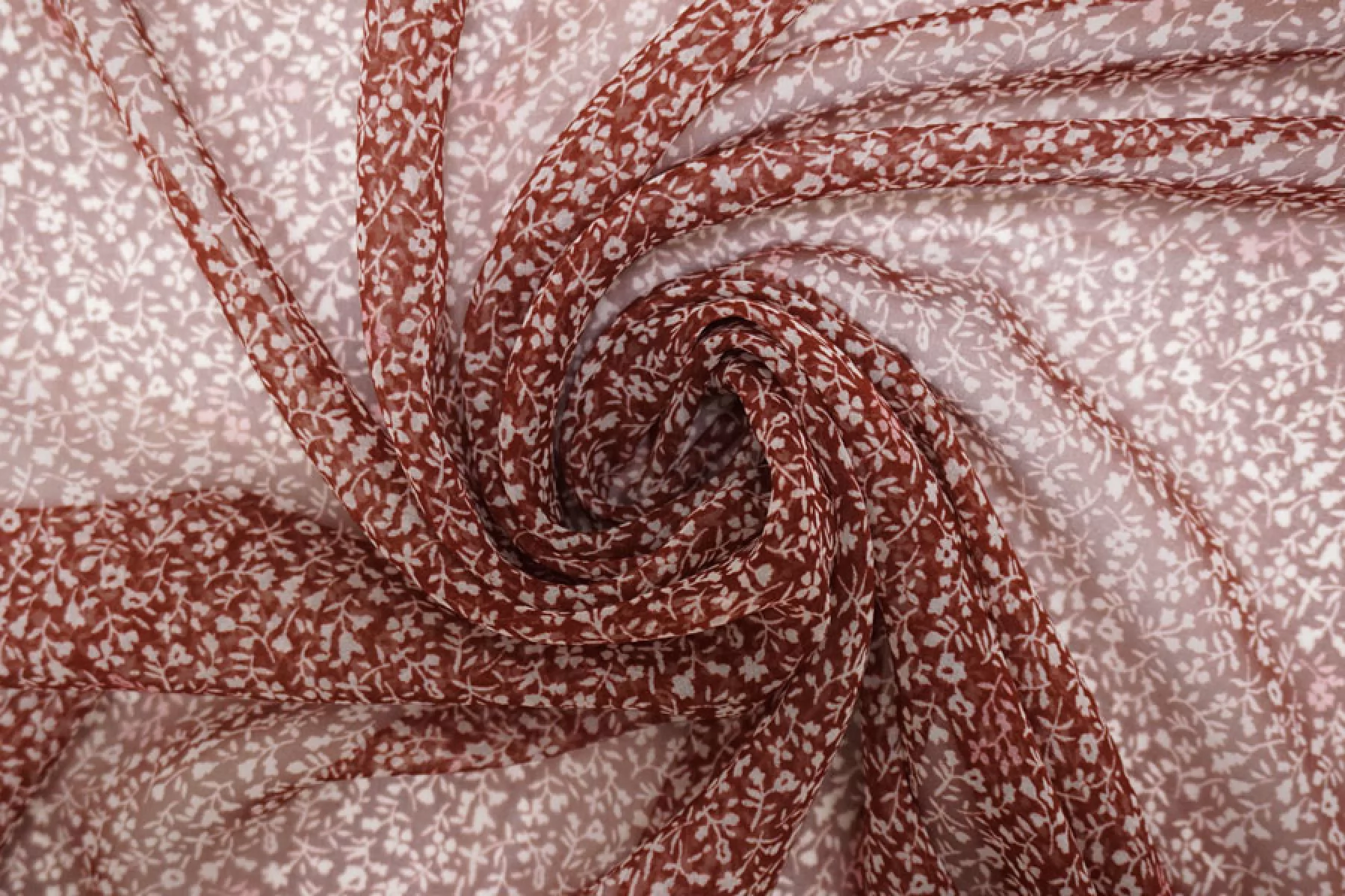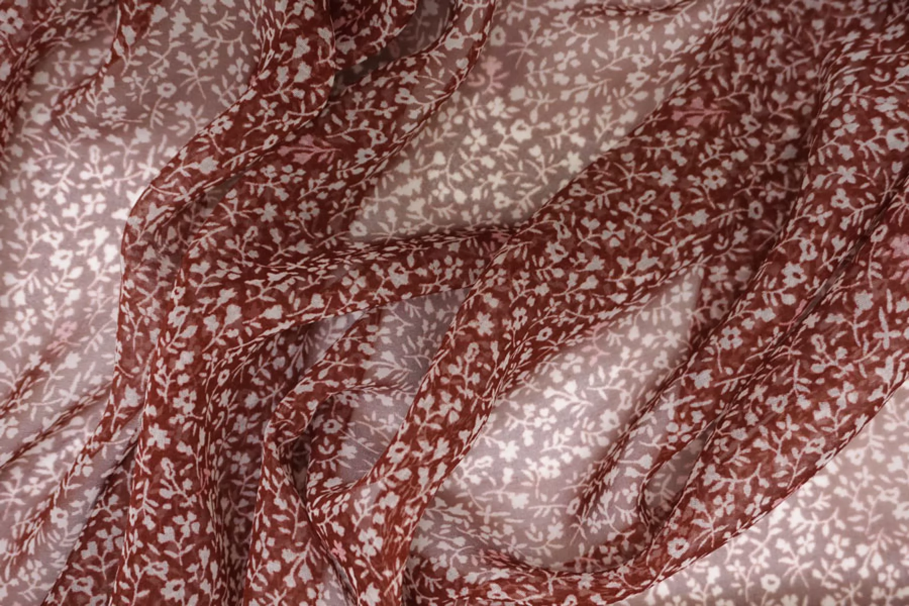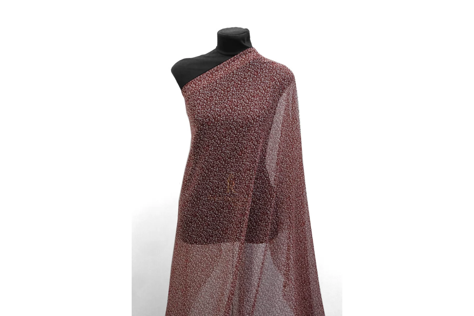 Прекрасный шёлковый шифон от бренда Max Mara, мелкий цветочный принт (белый и розовый цвет) на винном фоне. Струящийся, летящий, воздушный, очень приятный, чуть шероховатый. Уход, как и за любым шелком, деликатный. Полупрозрачный. Сминается слабо. Подойдет на платье, блузку, юбку.
