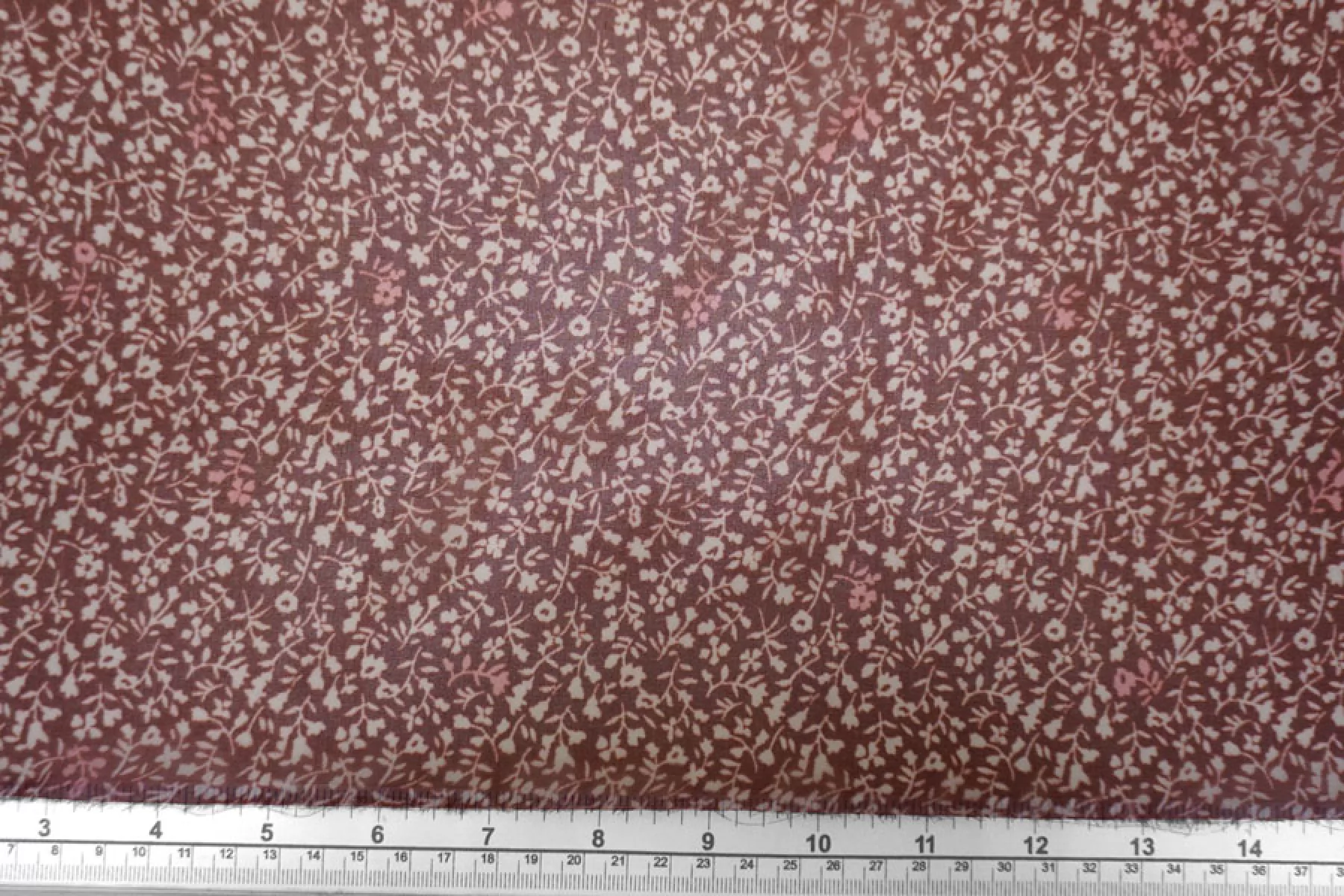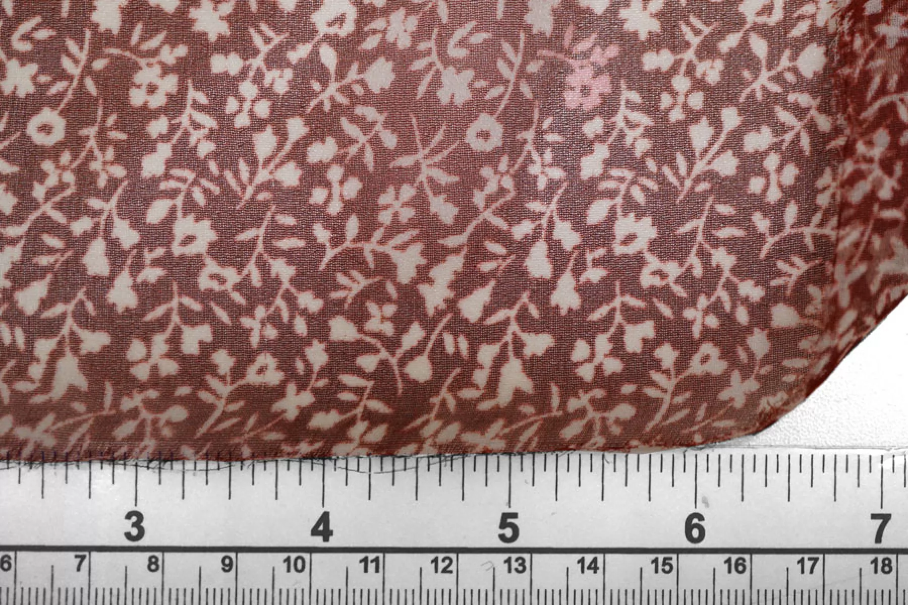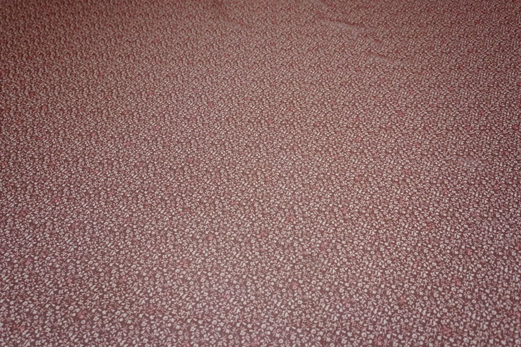 Прекрасный шёлковый шифон от бренда Max Mara, мелкий цветочный принт (белый и розовый цвет) на винном фоне. Струящийся, летящий, воздушный, очень приятный, чуть шероховатый. Уход, как и за любым шелком, деликатный. Полупрозрачный. Сминается слабо. Подойдет на платье, блузку, юбку.