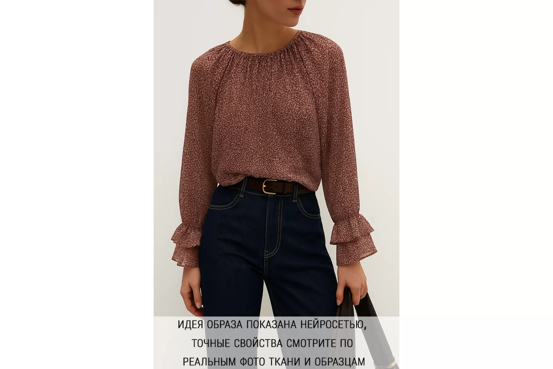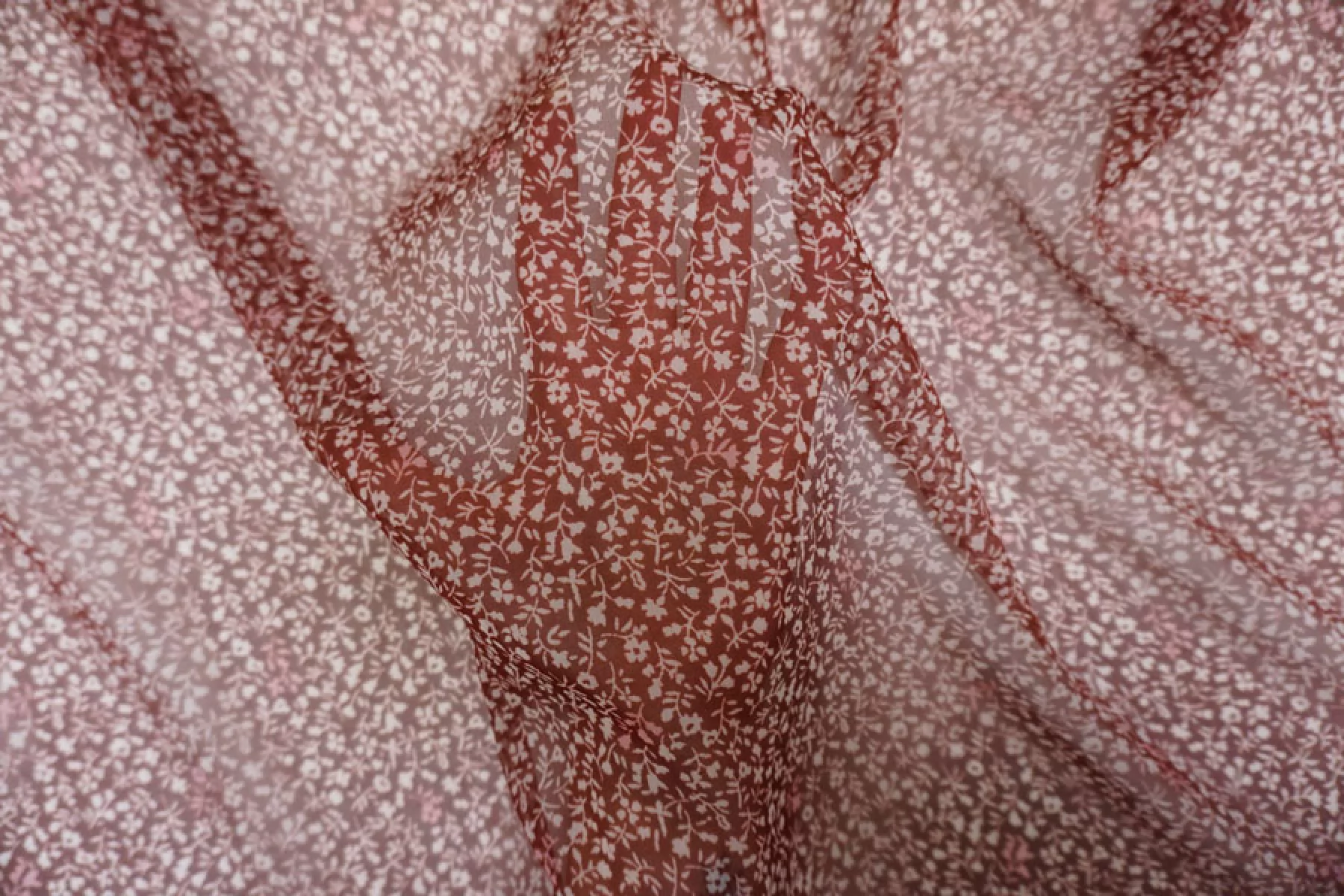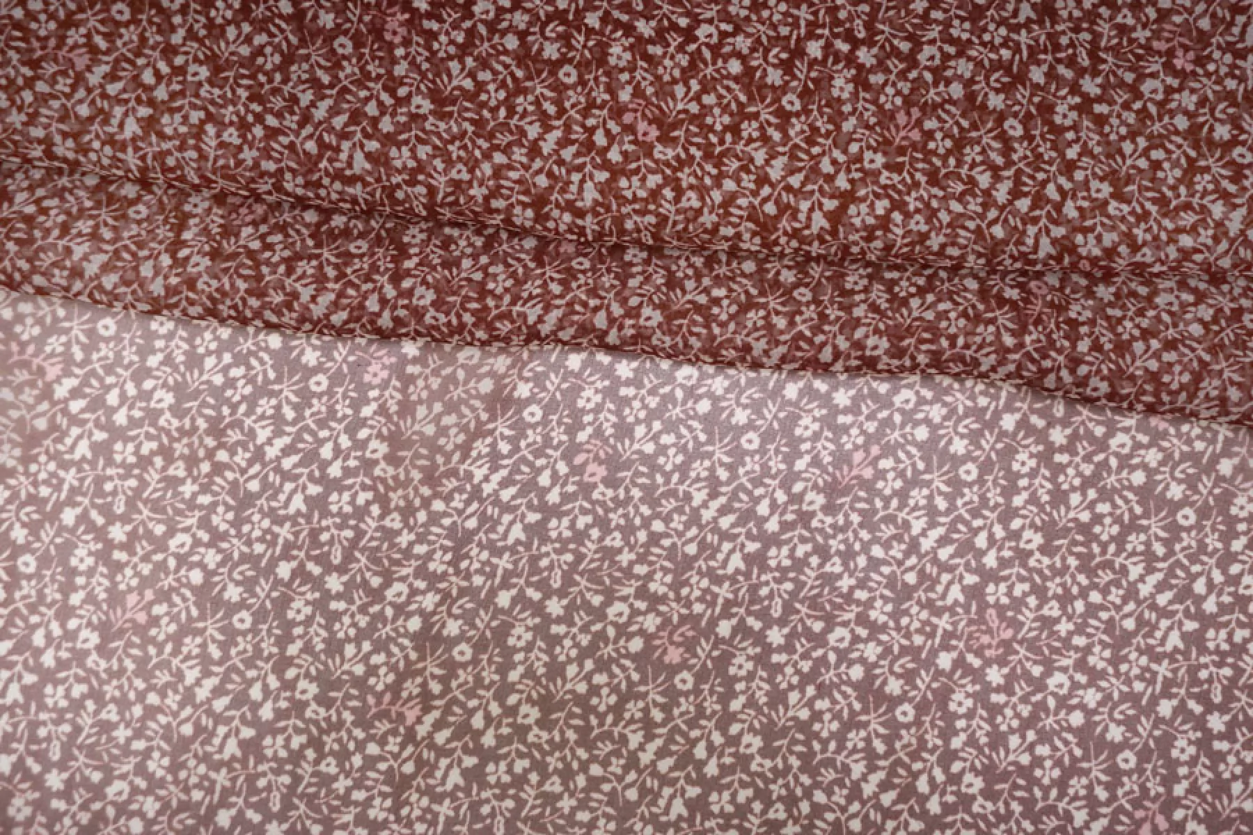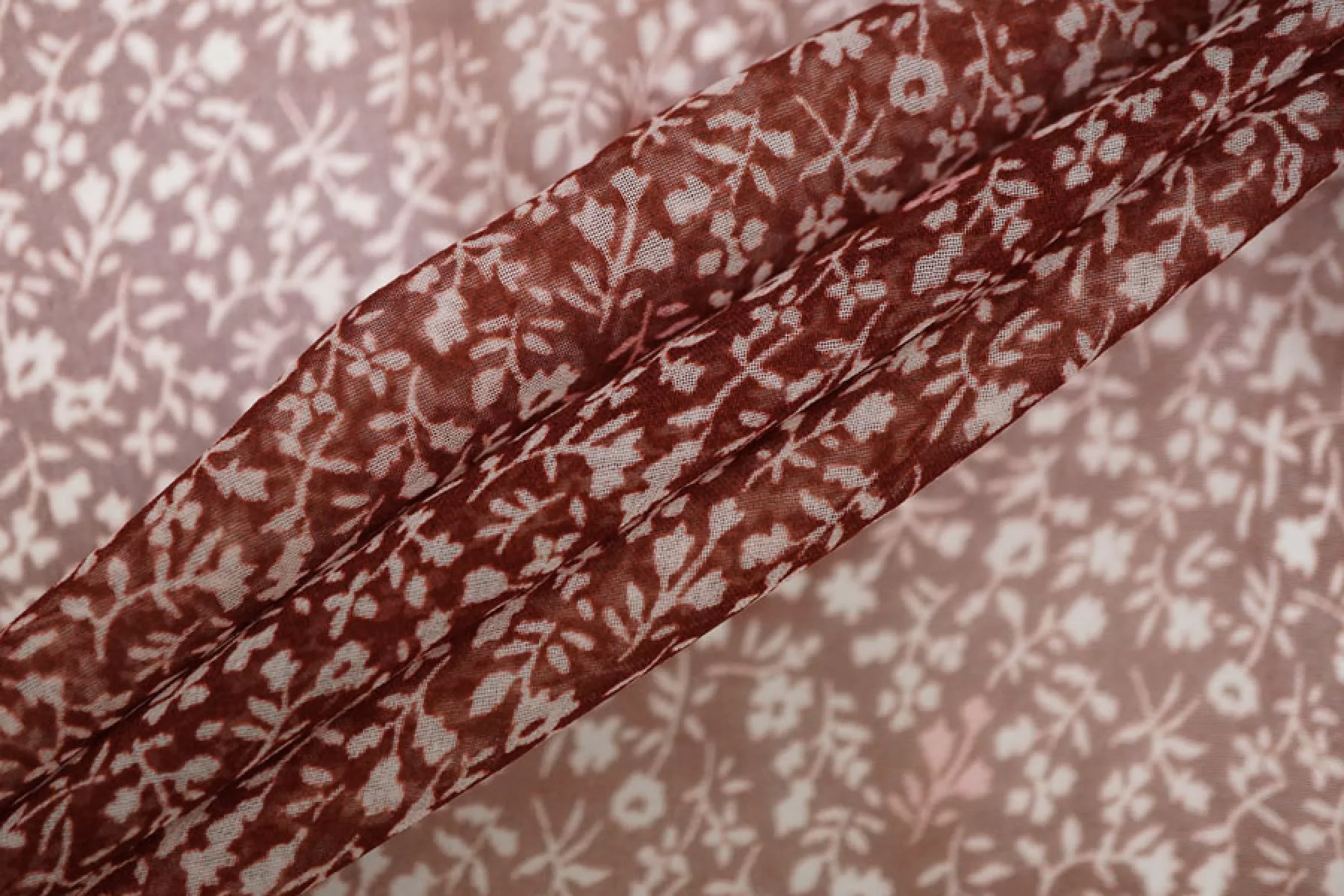 Прекрасный шёлковый шифон от бренда Max Mara, мелкий цветочный принт (белый и розовый цвет) на винном фоне. Струящийся, летящий, воздушный, очень приятный, чуть шероховатый. Уход, как и за любым шелком, деликатный. Полупрозрачный. Сминается слабо. Подойдет на платье, блузку, юбку.