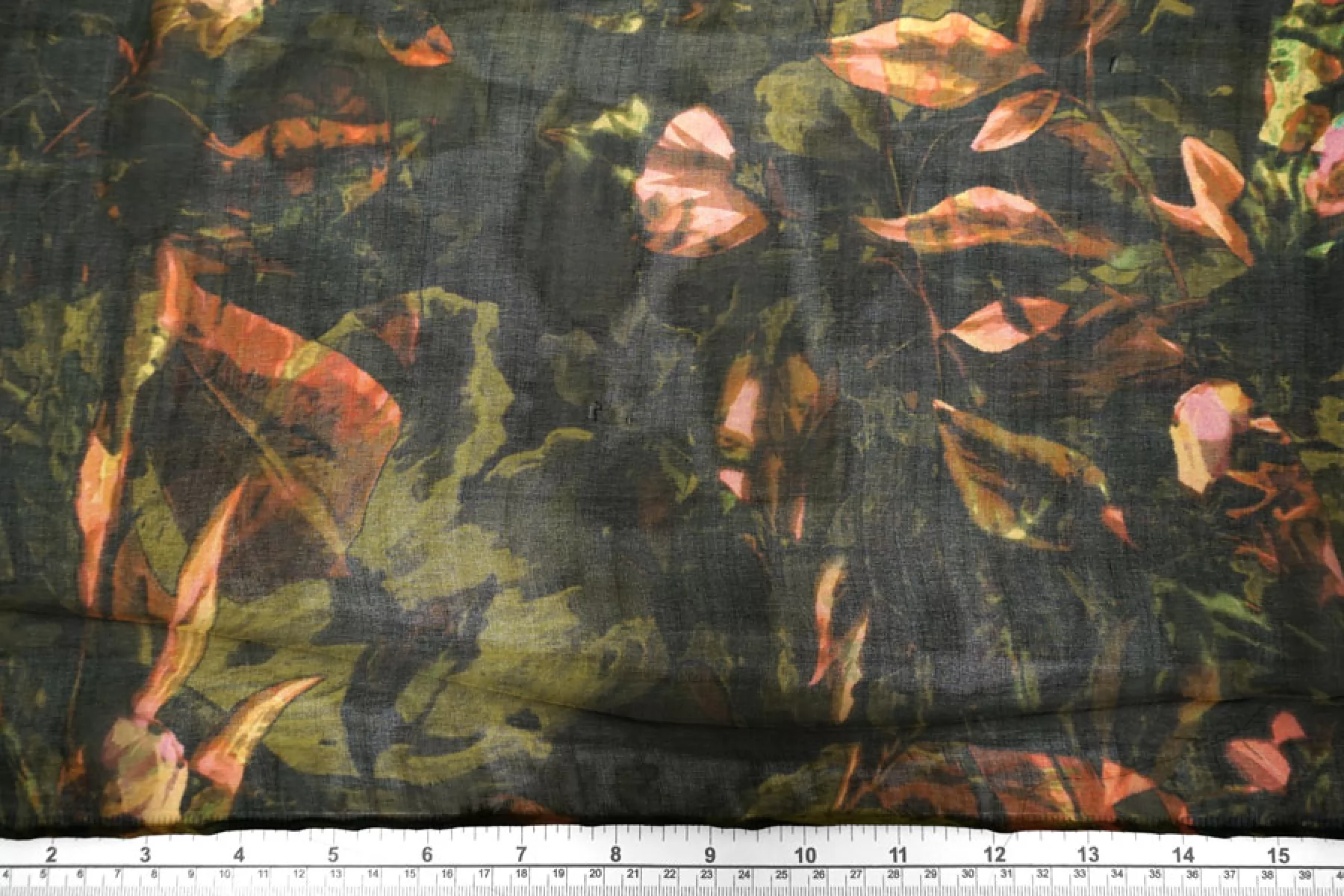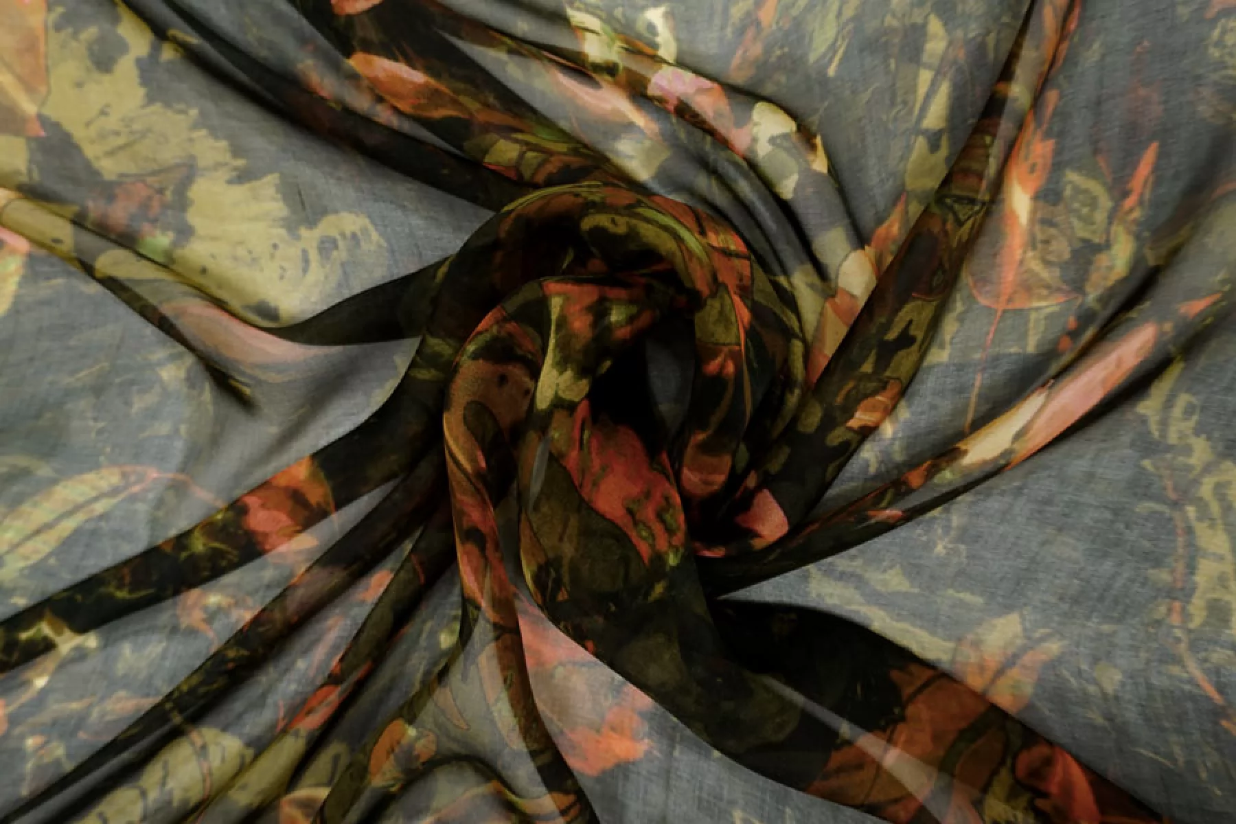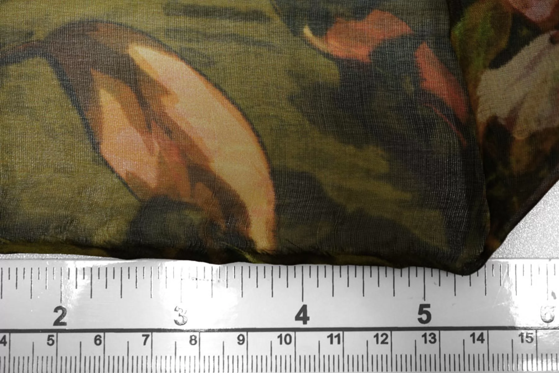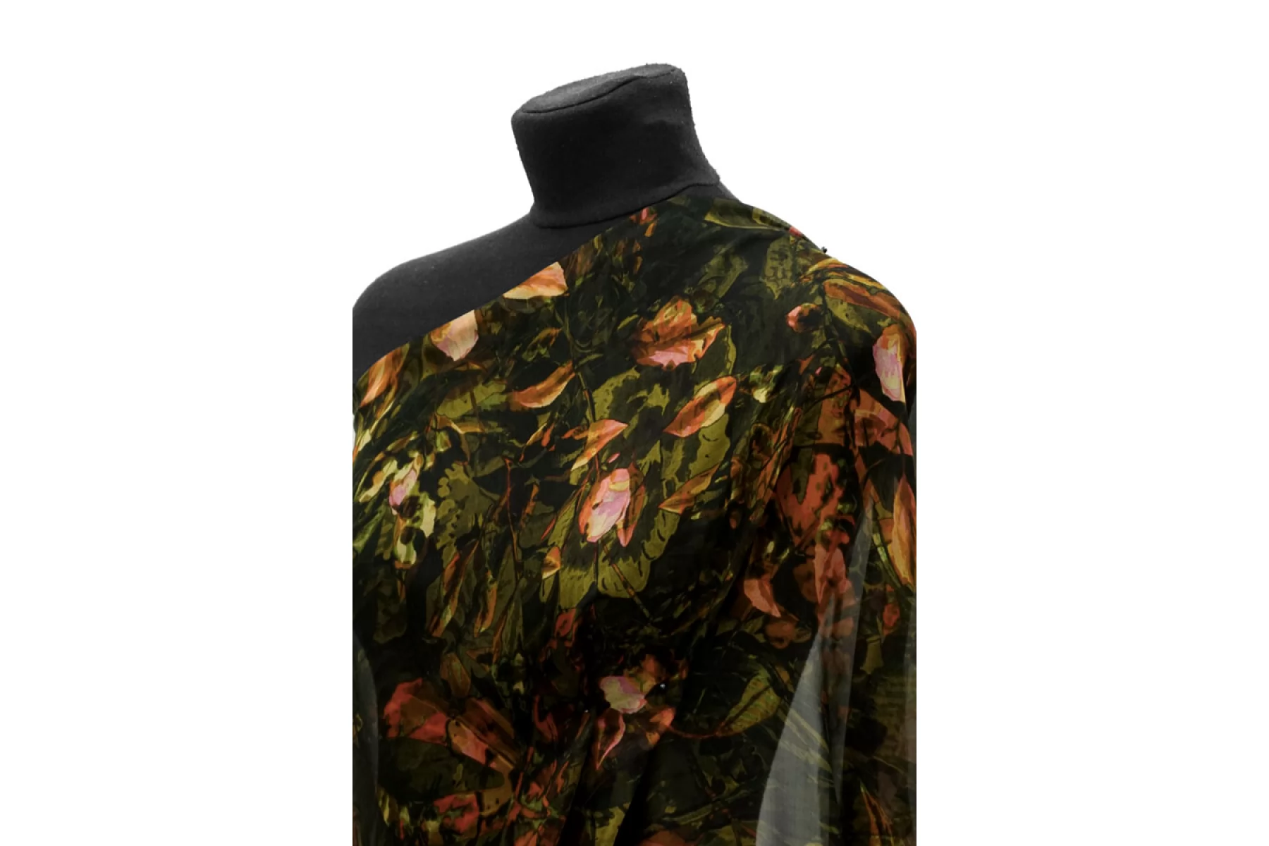 ВНИМАНИЕ!! Зацепки и уплотнения нити попадаются каждые 40-70 см, см. фото. Прекрасный шёлковый шифон от бренда Max Mara, красивый цветочный принт. Струящийся, летящий, воздушный, очень приятный и нежный к телу. Уход, как и за любым шелком, деликатный. Полупрозрачный Сминается несильно. Подойдет на платье, блузку, юбку.