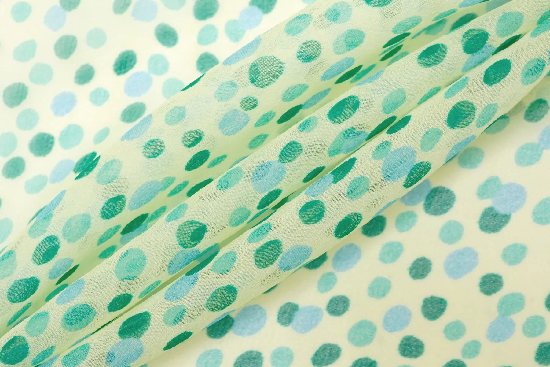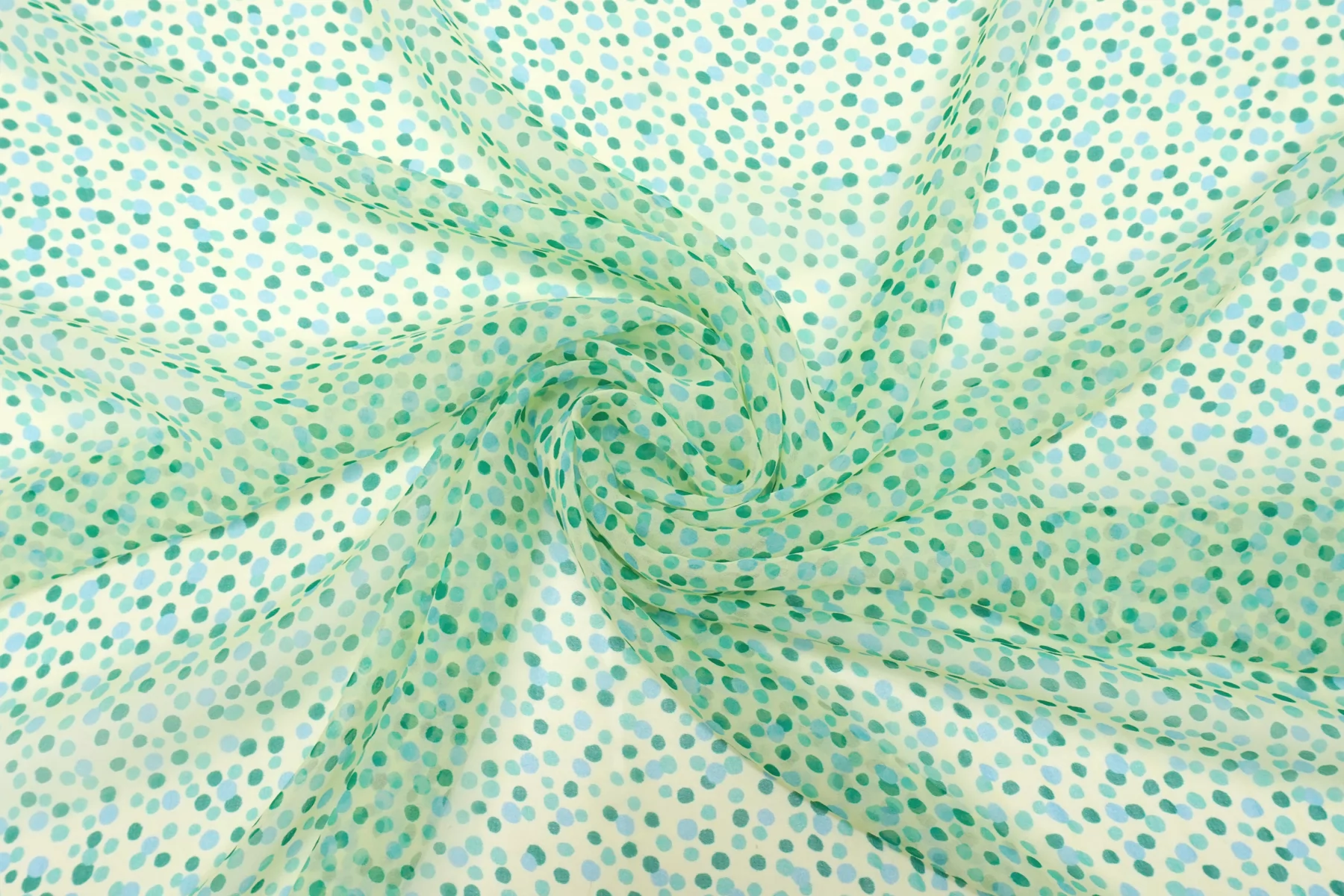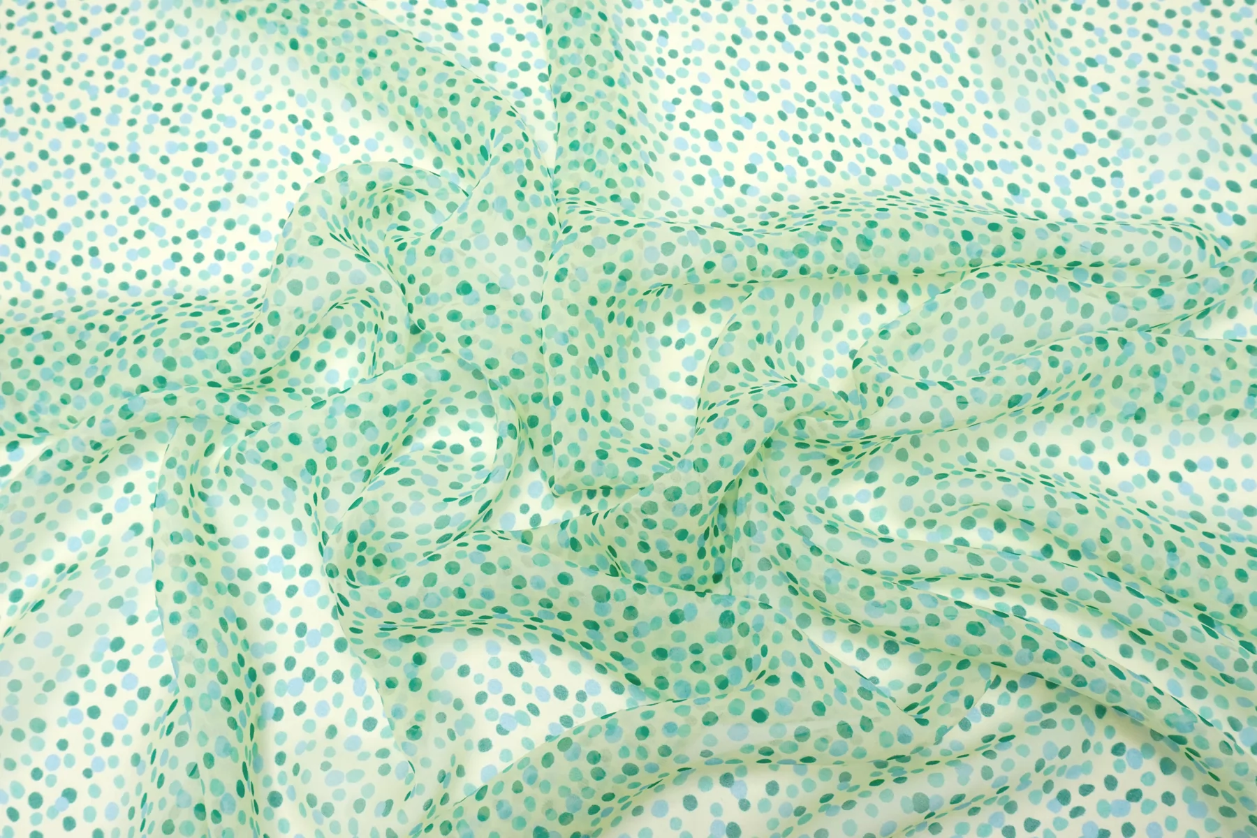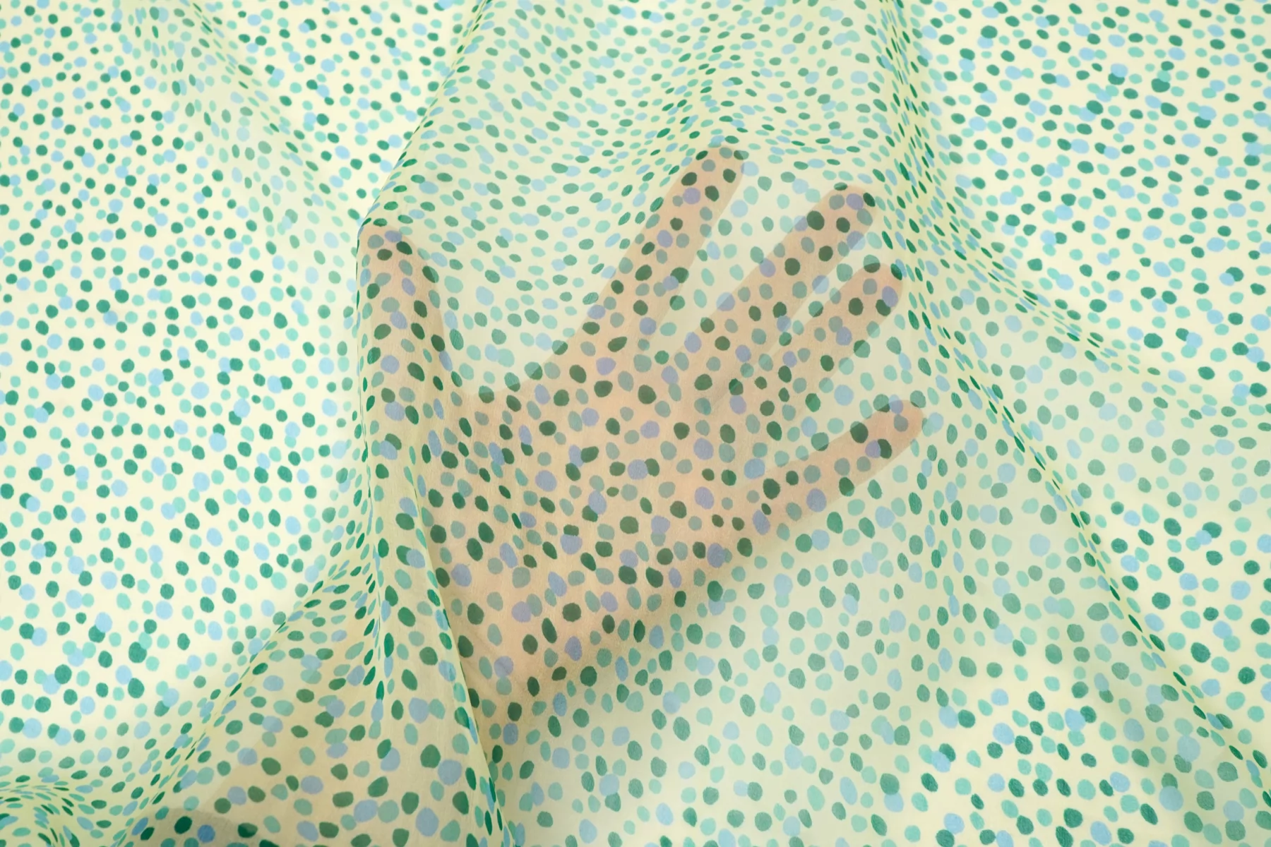 Прекрасный шелковый шифон от бренда Max Mara, принт в виде хаотичного горошка голубого, бирюзового и зелёного цвета на бледно-жёлтом фоне. Струящийся, летящий, воздушный, очень приятный и нежный к телу. Уход, как и за любым шелком, деликатный. Прозрачный. Сминается несильно. Подойдет на платье, блузку, юбку.